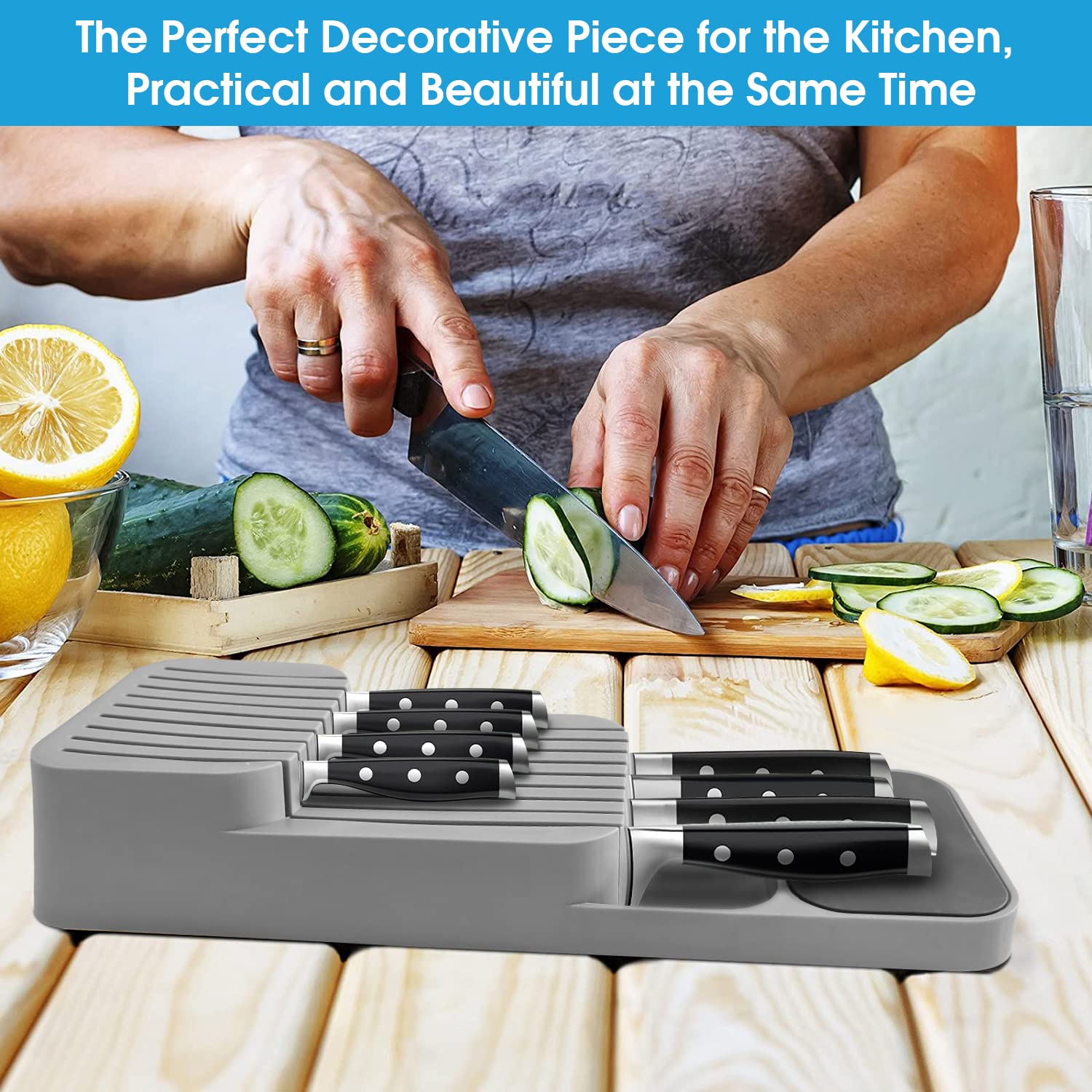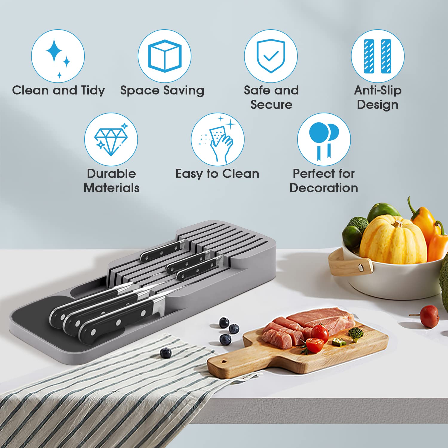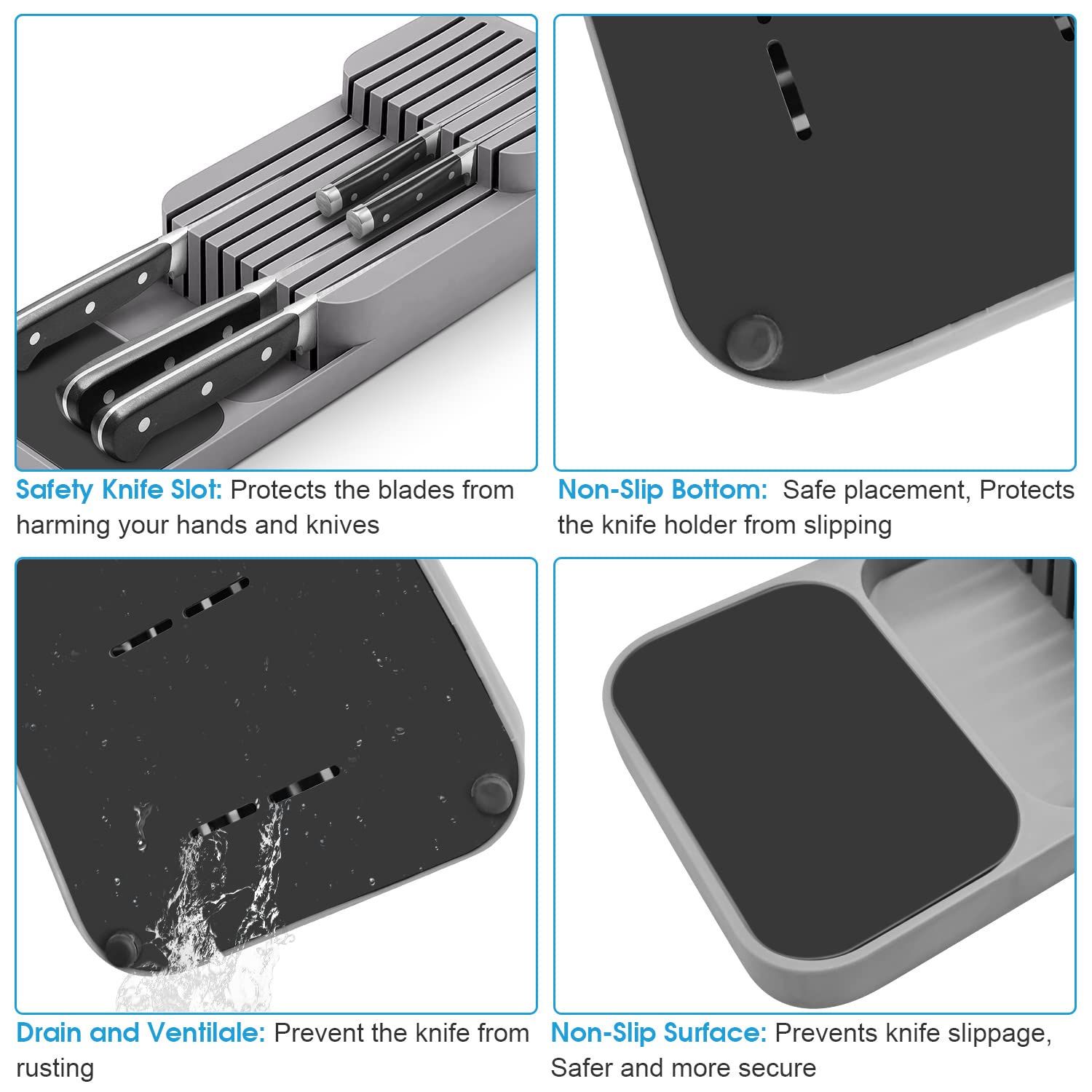 Verbesserte Messerblock für Schublade, Zweistufiger Messer Organizer mit Schlitzen, Platz für 9 Messer, Knife Block mit Anti-Rutsch-Pad, für Schubladen oder Arbeitsfläche, Sicher, Kompakt - Grau