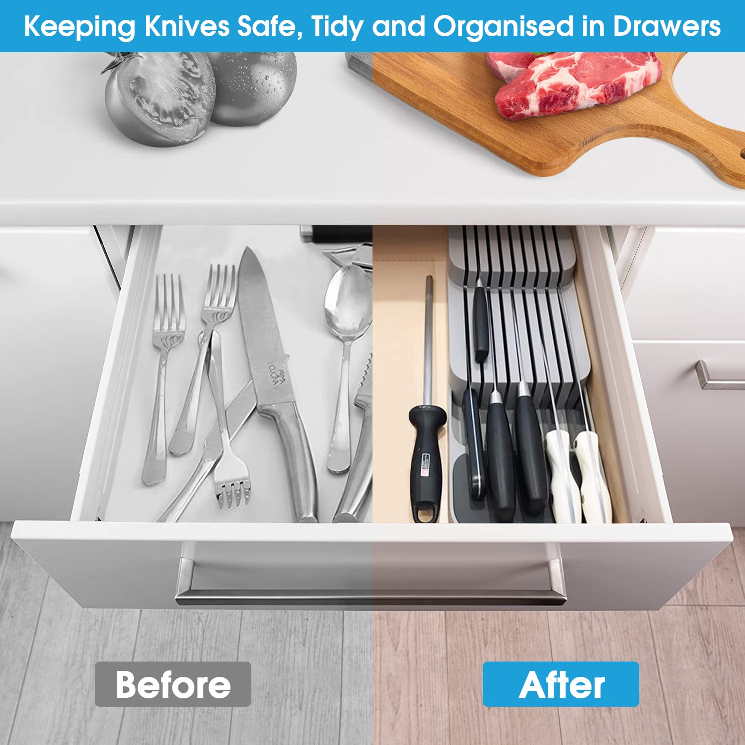 Verbesserte Messerblock für Schublade, Zweistufiger Messer Organizer mit Schlitzen, Platz für 9 Messer, Knife Block mit Anti-Rutsch-Pad, für Schubladen oder Arbeitsfläche, Sicher, Kompakt
