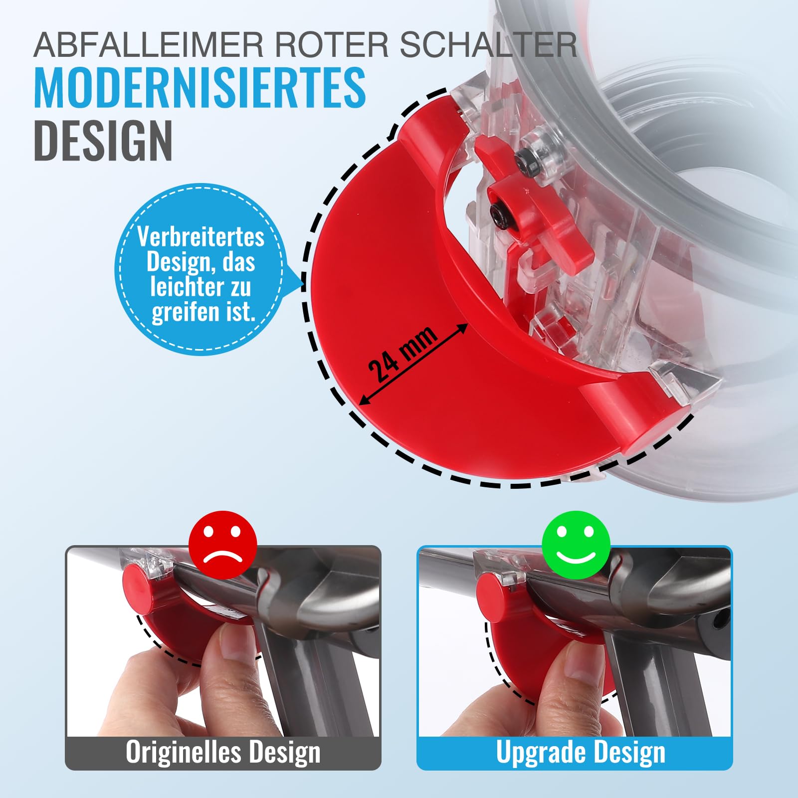 Merkmale:- Dies ist der kleine Ersatzbehälter für Dyson V10 Staubsauger, einschliesslich für Fluffy V10, V10 Motorhead.- 100% nagelneu und aus hochwertigem Material gefertigt, garantiert gute Verarbeitung und Haltbarkeit.- Der verbesserte Ersatzbehälter für Dyson verfügt über ein ergonomisches Design am Entriegelungsgriff, das das Entleeren des Staubbehälters und die Entsorgung von Abfall erleichtert. Dadurch wird die Belastung der Hand reduziert und weniger Aufwand erforderlich.- Dieser Staubbehälter ist nahezu identisch mit dem Original und sorgt dafür, dass Ihr Staubsauger in bestem Arbeitszustand bleibt. Er passt perfekt zum Originalgerät.- Wir bieten einen professionellen Kundenservice. Bei Produktproblemen oder Fragen zur Wartung des Staubsaugers zögern Sie bitte nicht, uns zu kontaktieren.Lieferumfang:- 1 x Kleine Staubbehälter für V10