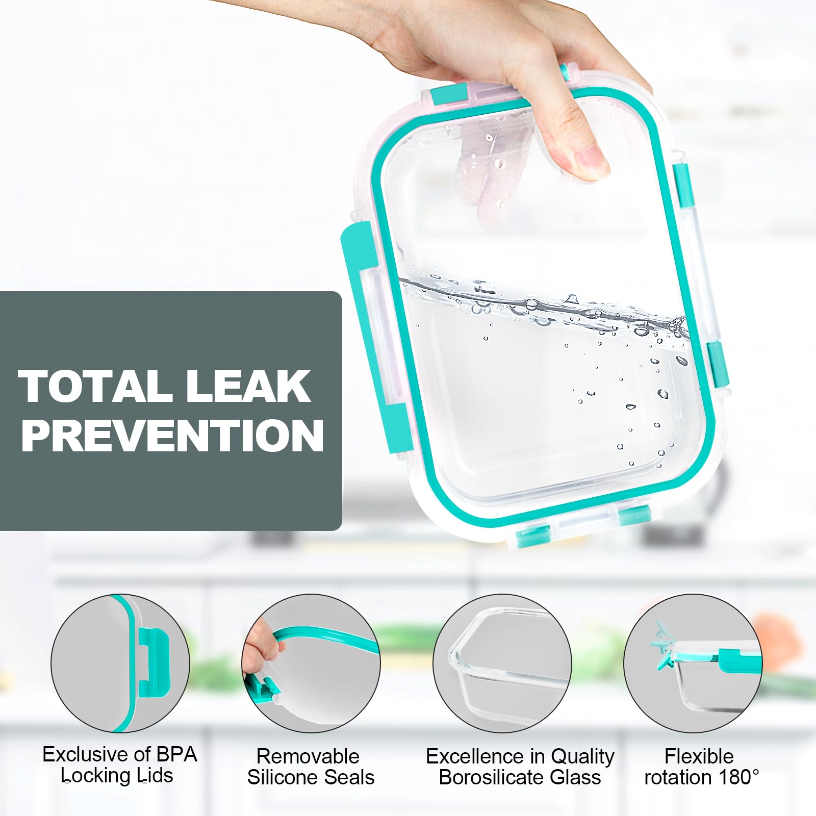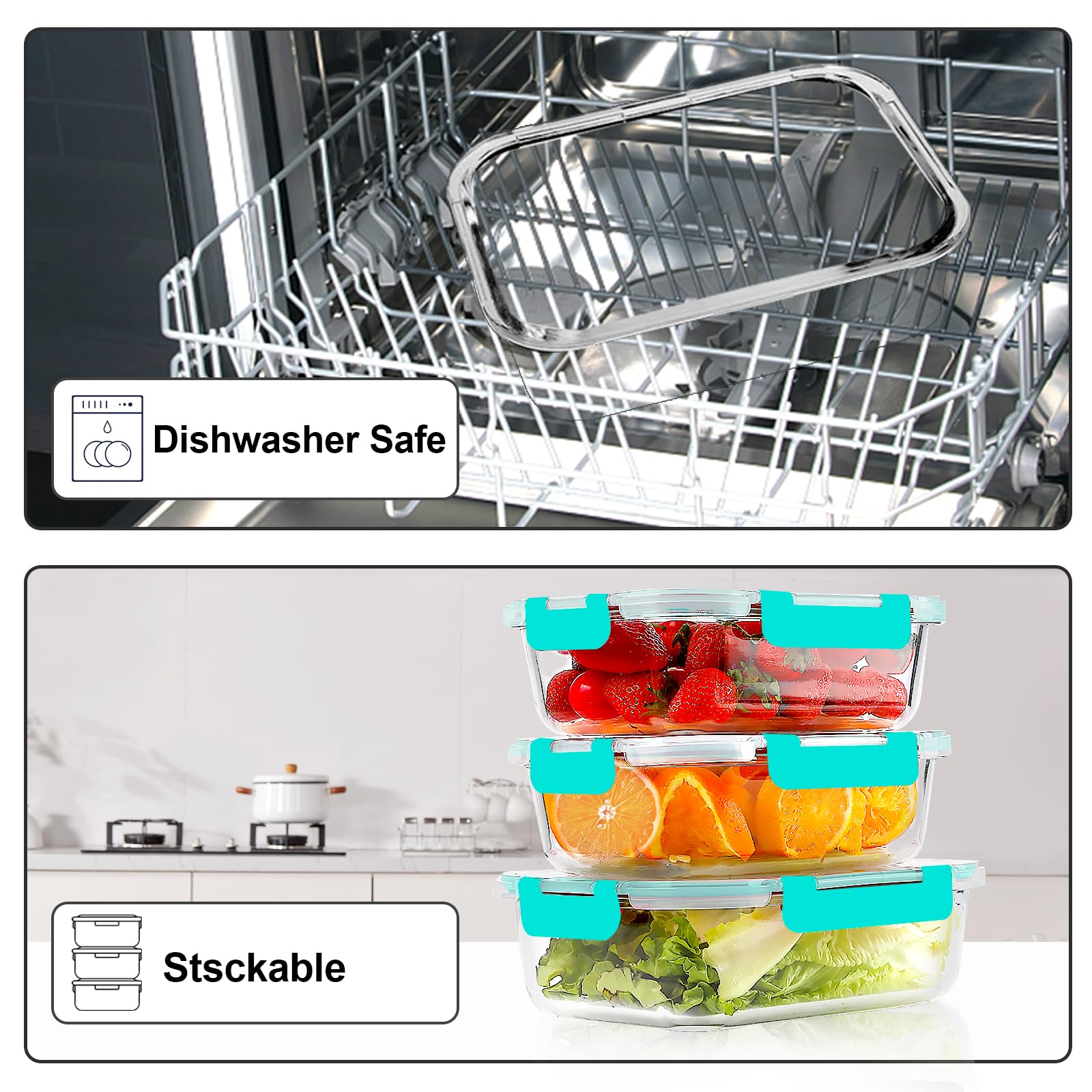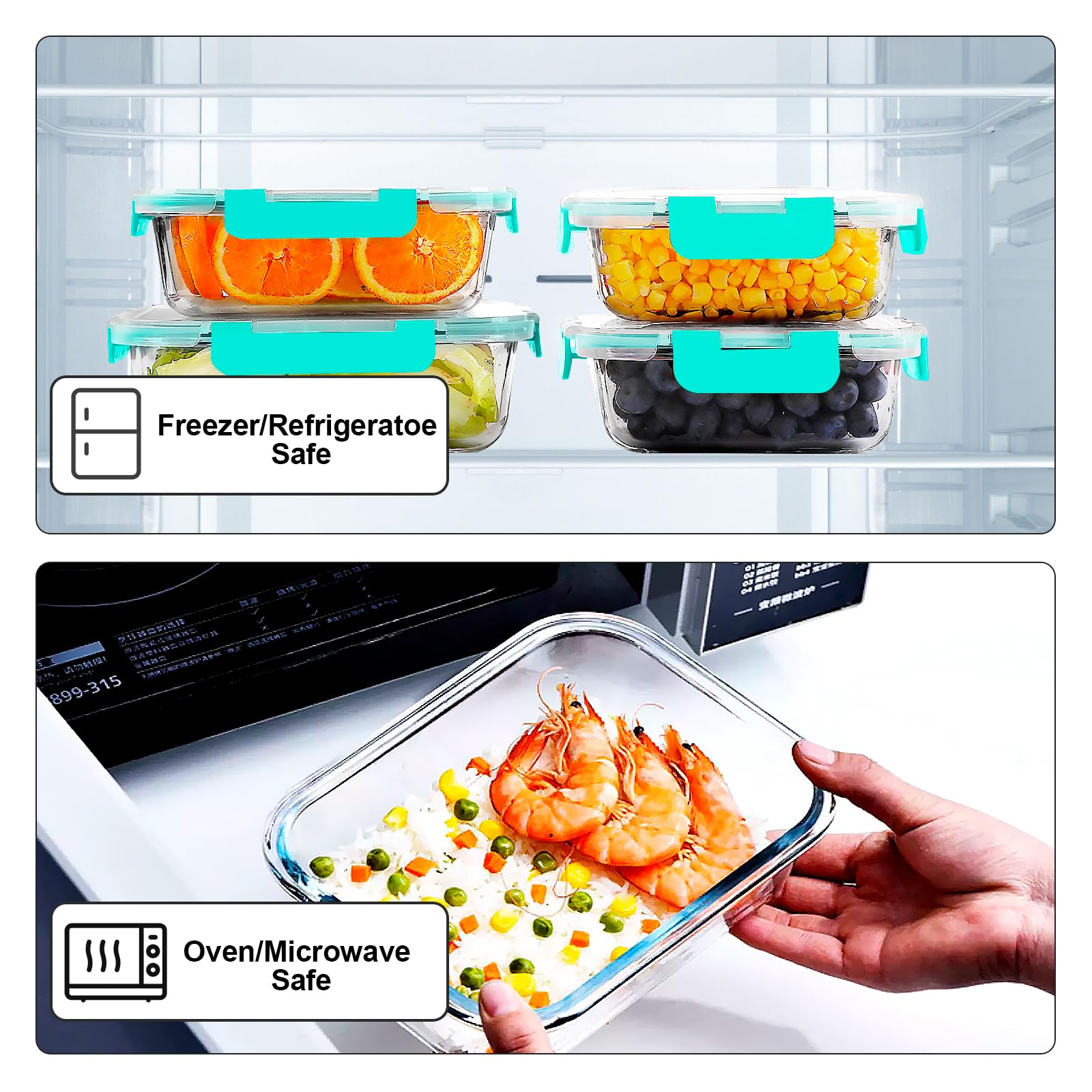 Die Vorratsdosen sind geeignet für den Einsatz im Kühlschrank und Gefrierschrank, der Spülmaschine, der Mikrowelle und dem Backofen. Sie sind auch geruchs- und schmutzabweisend, leicht zu reinigen, ideal, um Ihren Kühlschrank ordentlich zu halten und die Lebensmittel frisch zu halten. Es gibt eine Reihe von budgetfreundlichen Grössen in diesem Behälter-Set, rund, Rechtecke und Quadrate – Sie können immer den richtigen Behälter für Unterhaltung, Servieren und Mitbringen von Speisen auf Partys finden. Tipps: Entfernen Sie die Deckel, bevor Sie den Glasbehälter in Mikrowelle, Backofen und Spülmaschine stellen.
