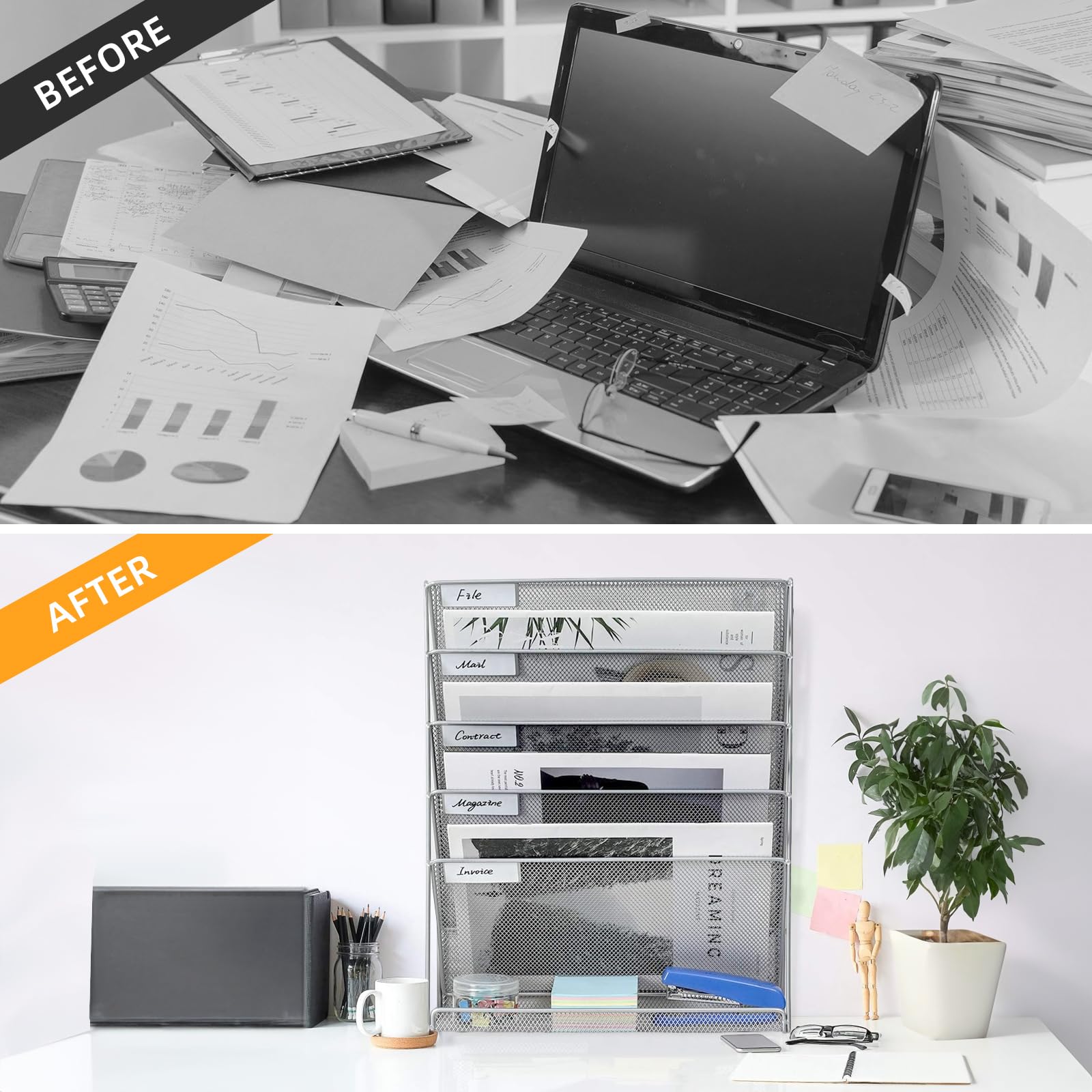 Zeitschriftenhalter Wand, 6 Fächer, 40,5 x 32,5 x 10,5 cm Dokumentenhalter A4, Zeitschriften Wandhalter, Metall Querformat Prospekthalter für Büro, Schreibtisch