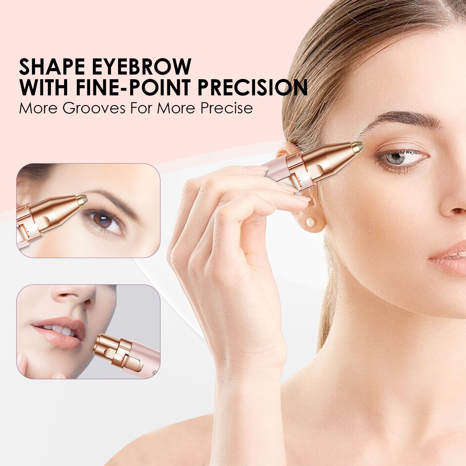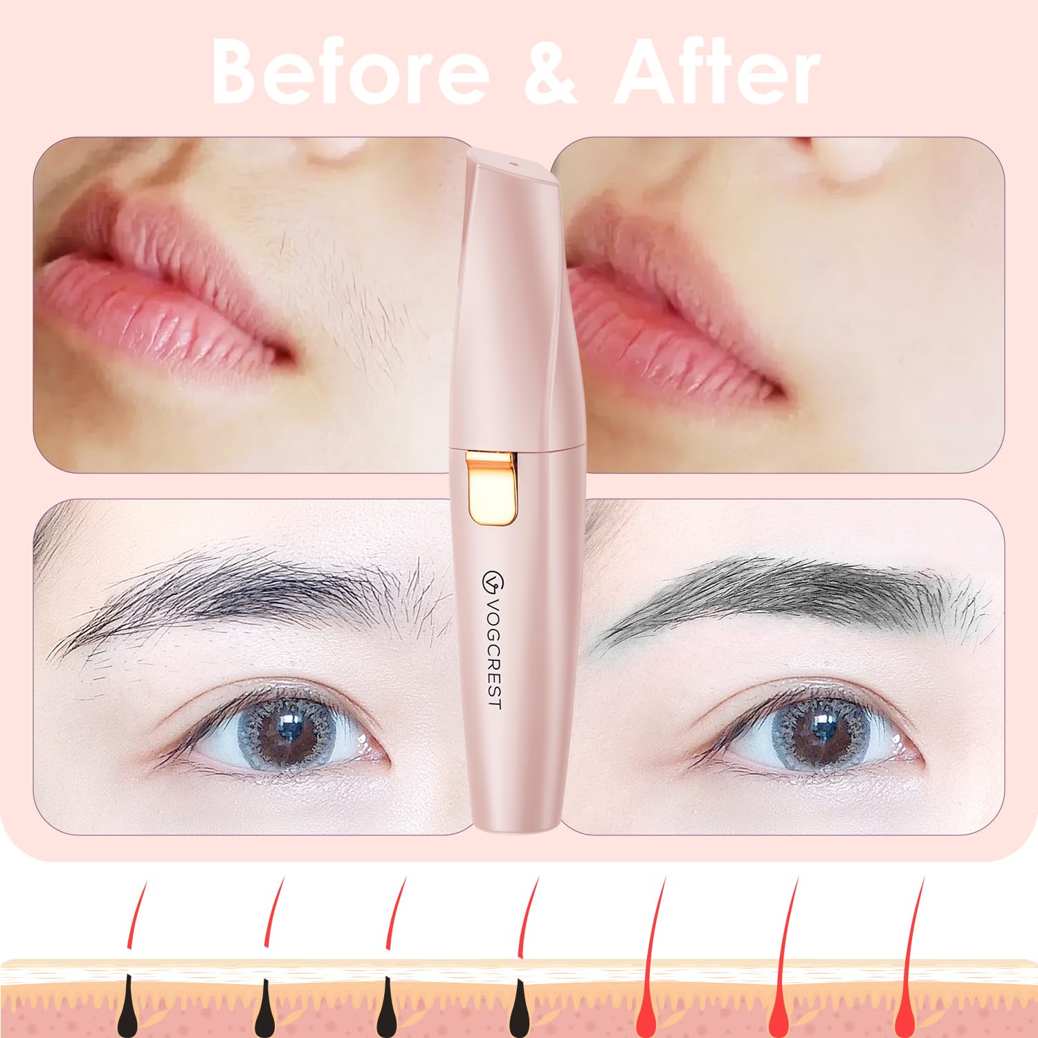 VG VOGCREST Augenbrauen-Gesichtstrimmer 2 in 1 Wiederaufladbare Gesichtshaarentfernung und Augenbrauenrasierer - Gesicht Lippen Körper Schmerzloser Gesichtsrasierer mit eingebauter LED (Rose)