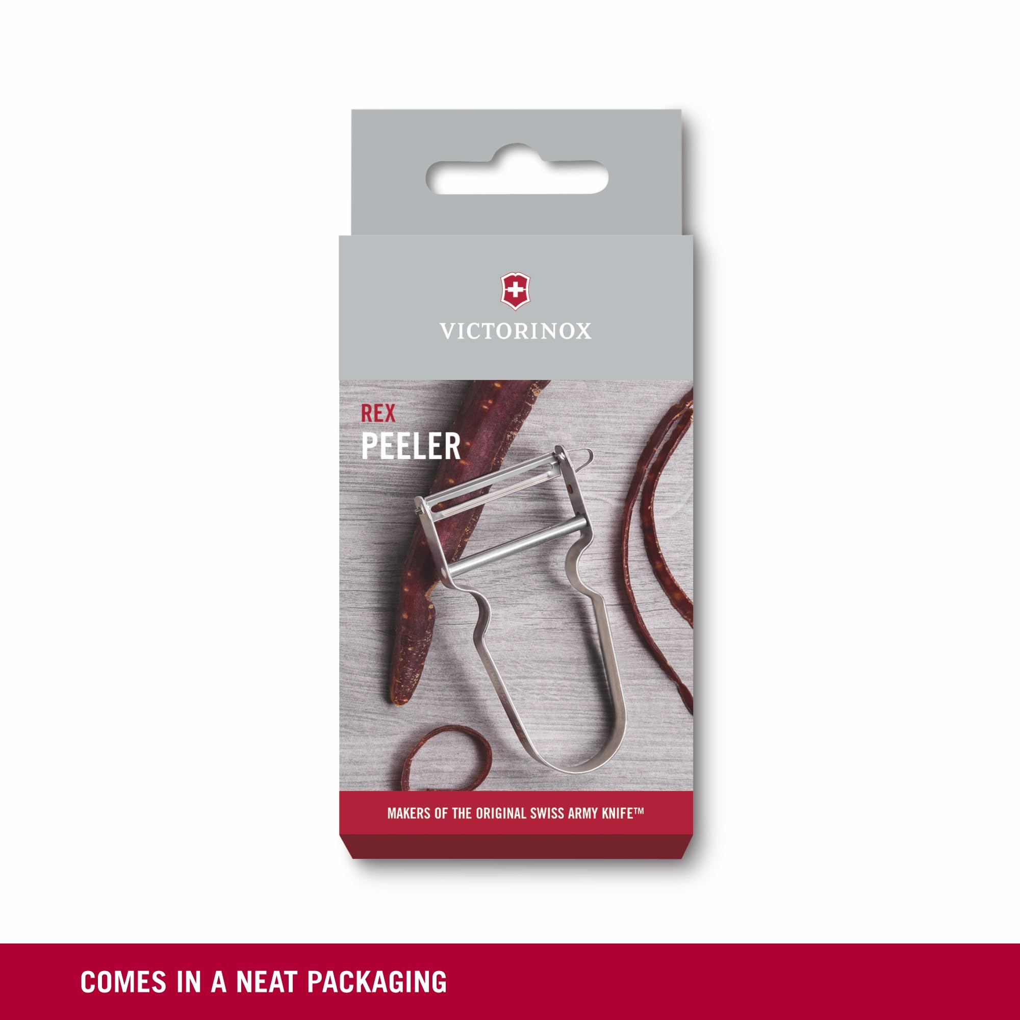 Seit 1947 hilft der ikonische REX Sparschäler Hobbyköchen beim schnellen und sicheren Arbeiten in der Küche. Dank extra scharfer Klinge und ergonomischem Griff gleitet er durch alle Lebensmittel und liegt bequem in der Hand. Und weil er so nah an der Haut schneidet, bleiben die Vitamine in Obst und Gemüse erhalten. Wir freuen uns, dem REX mit seiner glorreichen Vergangenheit eine aufregende Zukunft bei Victorinox schenken zu können. Hauptmerkmale: - Leichter Schäler mit ikonischem Design - Ergonomische Form für leichtes Arbeiten und maximalen Komfort - Extra scharfe Klinge für einfaches Schälen