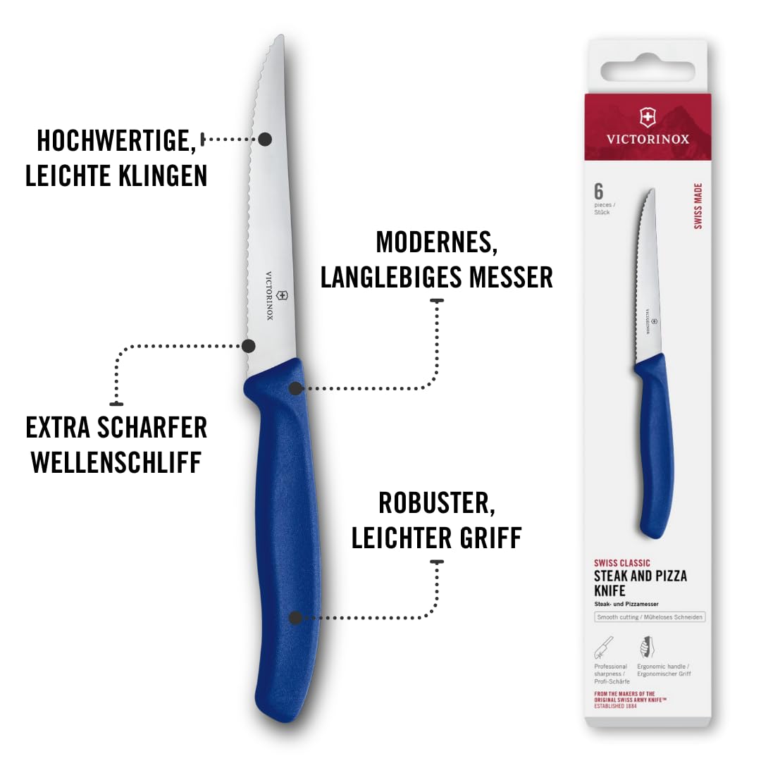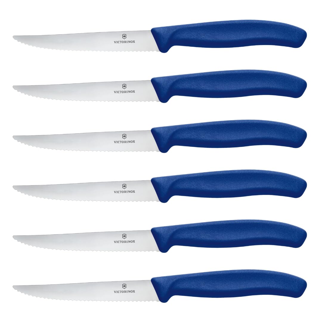 Victorinox Swiss Classic Profi Steak- und Pizzamesser-Set, 6-teilig, Tafelmesser, Wellenschliff, Scharfe Klingen, 11 cm, Robuste Kunststoffgriffe, Blau