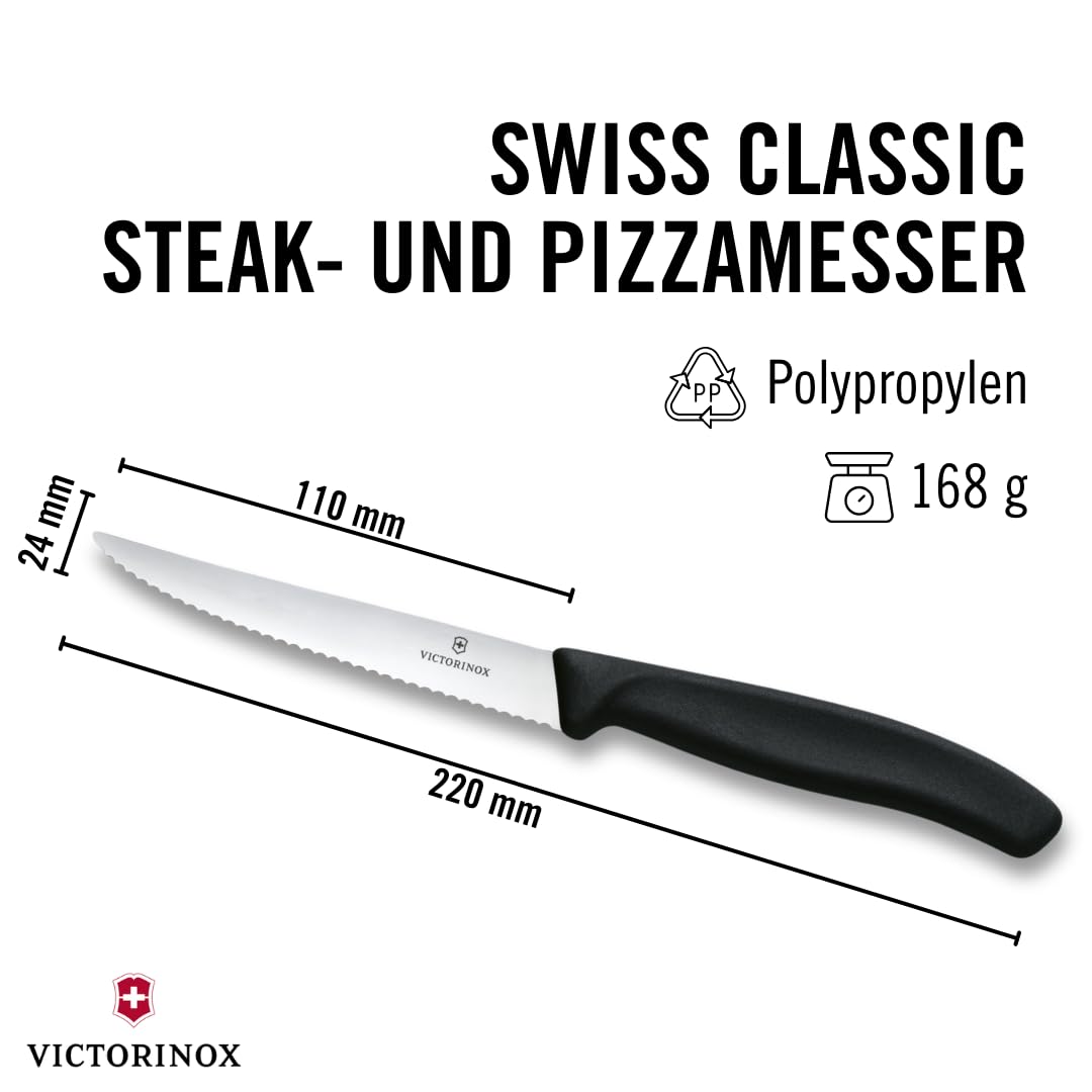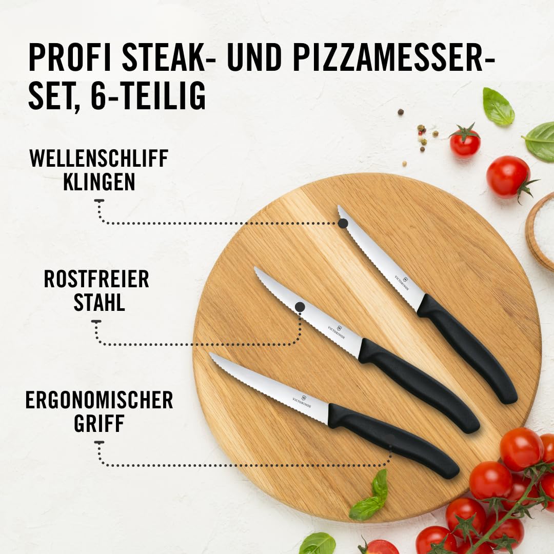 Victorinox Swiss Classic Profi Steak- und Pizzamesser-Set, 6-teilig, Tafelmesser, Wellenschliff, Scharfe Klingen, 11 cm, Robuste Kunststoffgriffe, Schwarz