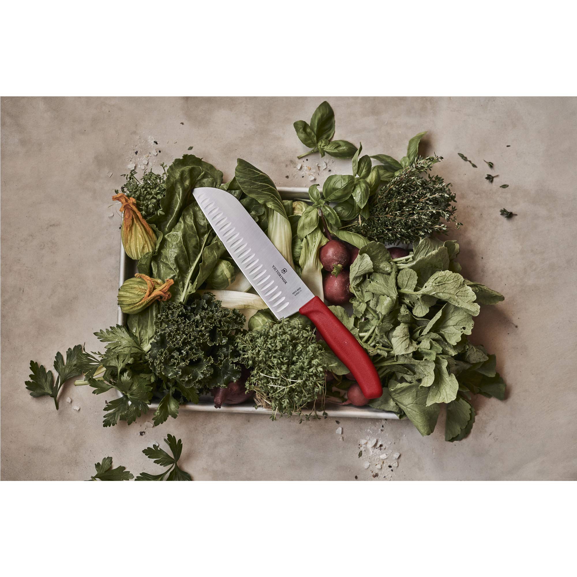 Victorinox Swiss Classic Santokumesser, Messer Asiatischer Art, Extra Scharfe Klinge, Kullenschliff, 17 cm, Rostfreier Stahl, Geschenkverpackung, Rot