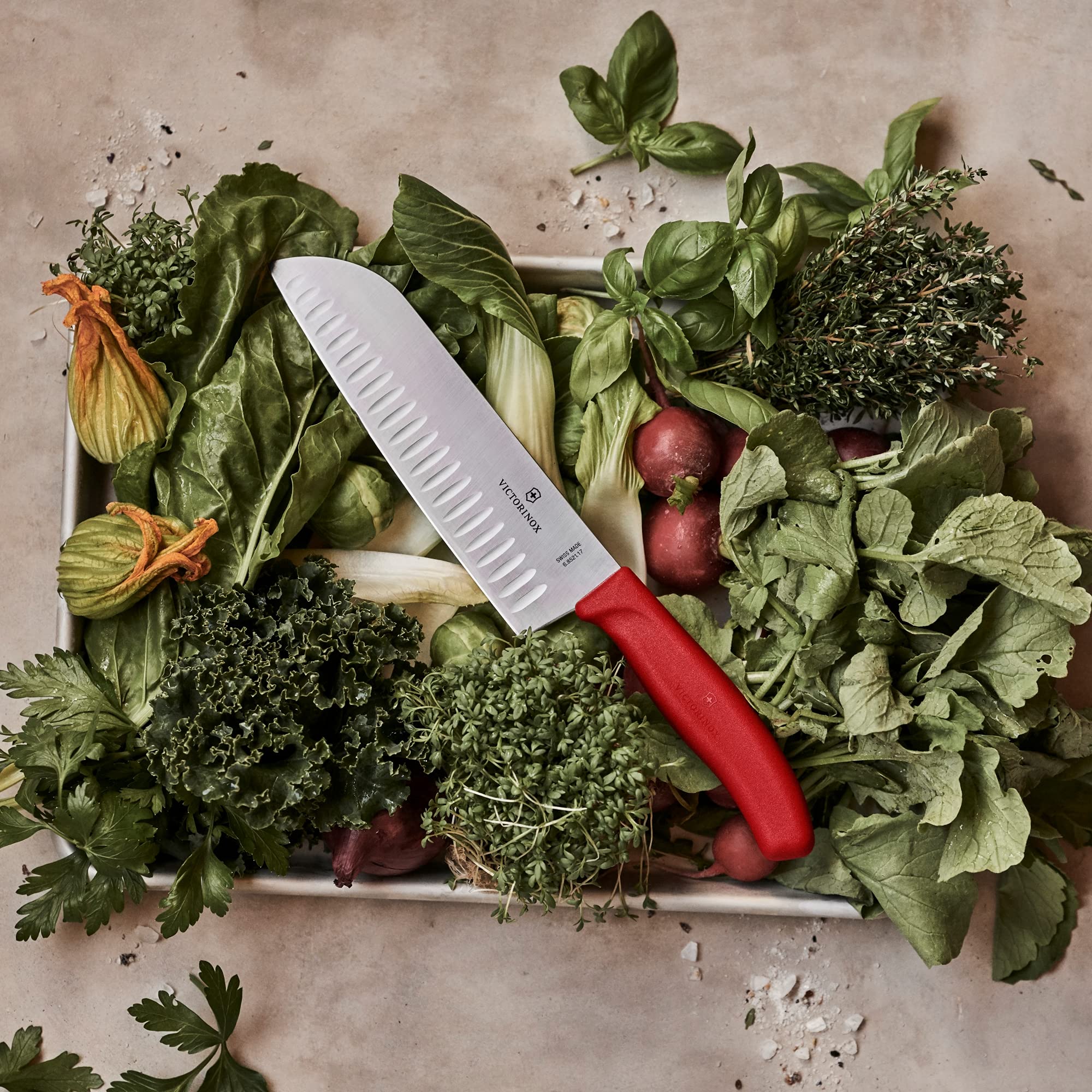 Mindestanzahl für die Bestellung von "Victorinox Swiss Classic Santokumesser, Messer Asiatischer Art, Extra Scharfe Klinge, Kullenschliff, 17 cm, Rostfreier Stahl, Blister, Rot" ist 1.