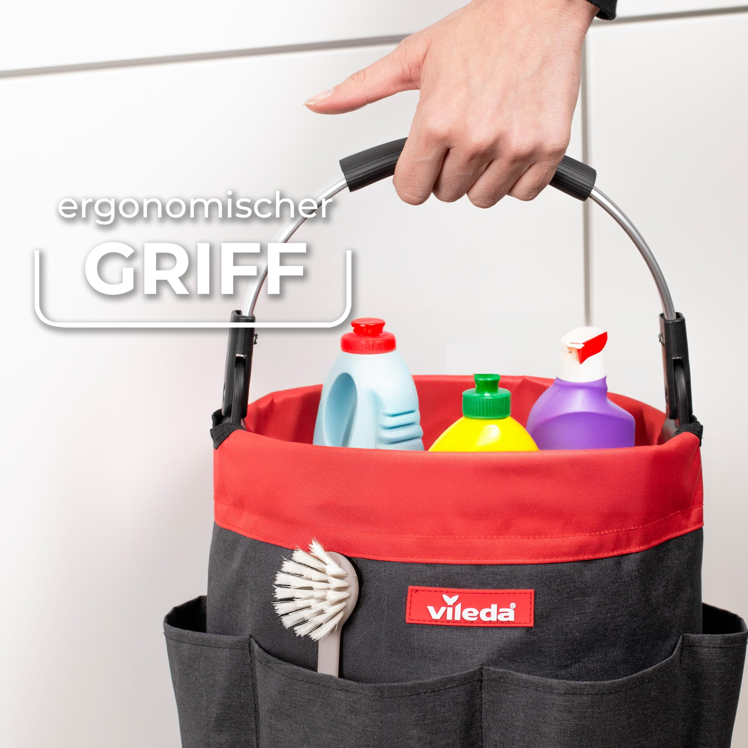 Mit dem Vileda Cleaning Caddy bewahrst du deine Reinigungsutensilien jederzeit ordentlich und griffbereit auf. Die praktische Organizer-Tasche bietet 6 Fächer für Schwämme, Reinigungsmittel, Bürsten oder Tücher. Das wasserfeste, reissfeste Material schützt zuverlässig vor Auslaufen und Nässe. Der ergonomische Softgriff sorgt auch bei voller Beladung für angenehmes Tragen – kein Einschneiden, kein Umkippen. Dank der erhöhten Bodenfüsse bleibt der Organizer hygienisch sauber und hat keinen Kontakt zum feuchten Untergrund. Nach Gebrauch einfach zusammenklappen – perfekt für platzsparende Aufbewahrung in kleinen Haushalten, Campern oder Vorratsschränken. Der ideale Begleiter für die Reinigung im Haushalt, Auto oder Büro.