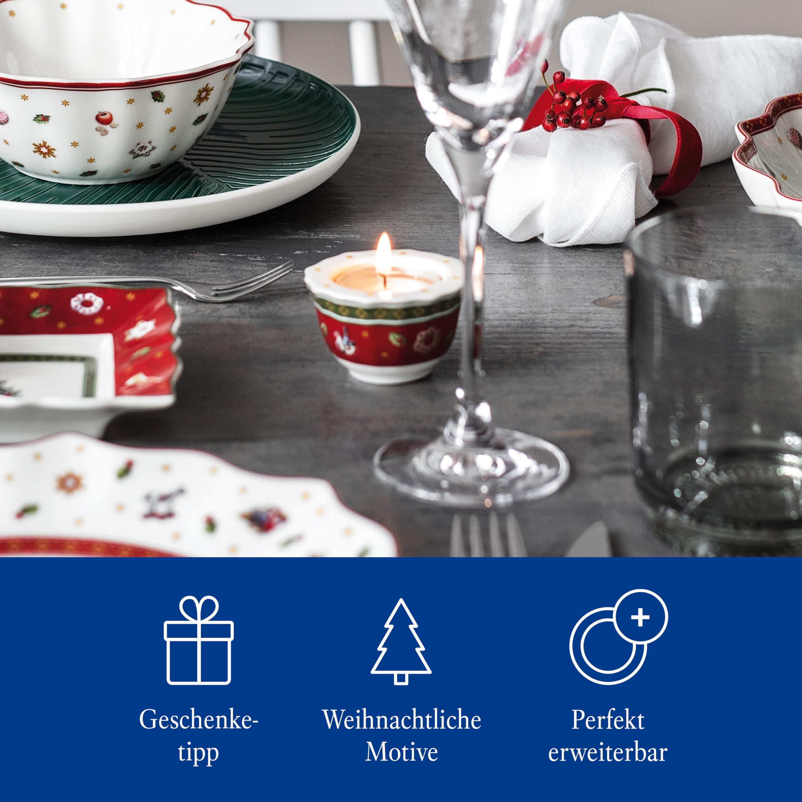 Eine festlich gedeckte Weihnachtstafel verleiht dem Zuhause ein besonderes Flair. Egal ob der Tisch ganz in Weiss, klassisch im rot-grünen Look oder farbenfroh und individuell gedeckt wird – mit der Kollektion Toy’s Delight gibt es freie Wahl. Das Beste: Alle Motive und Farben lassen sich einfach untereinander kombinieren. So entstehen immer wieder interessante und abwechslungsreiche Tischdekorationen.