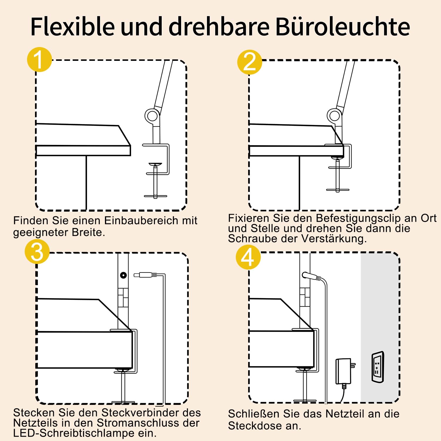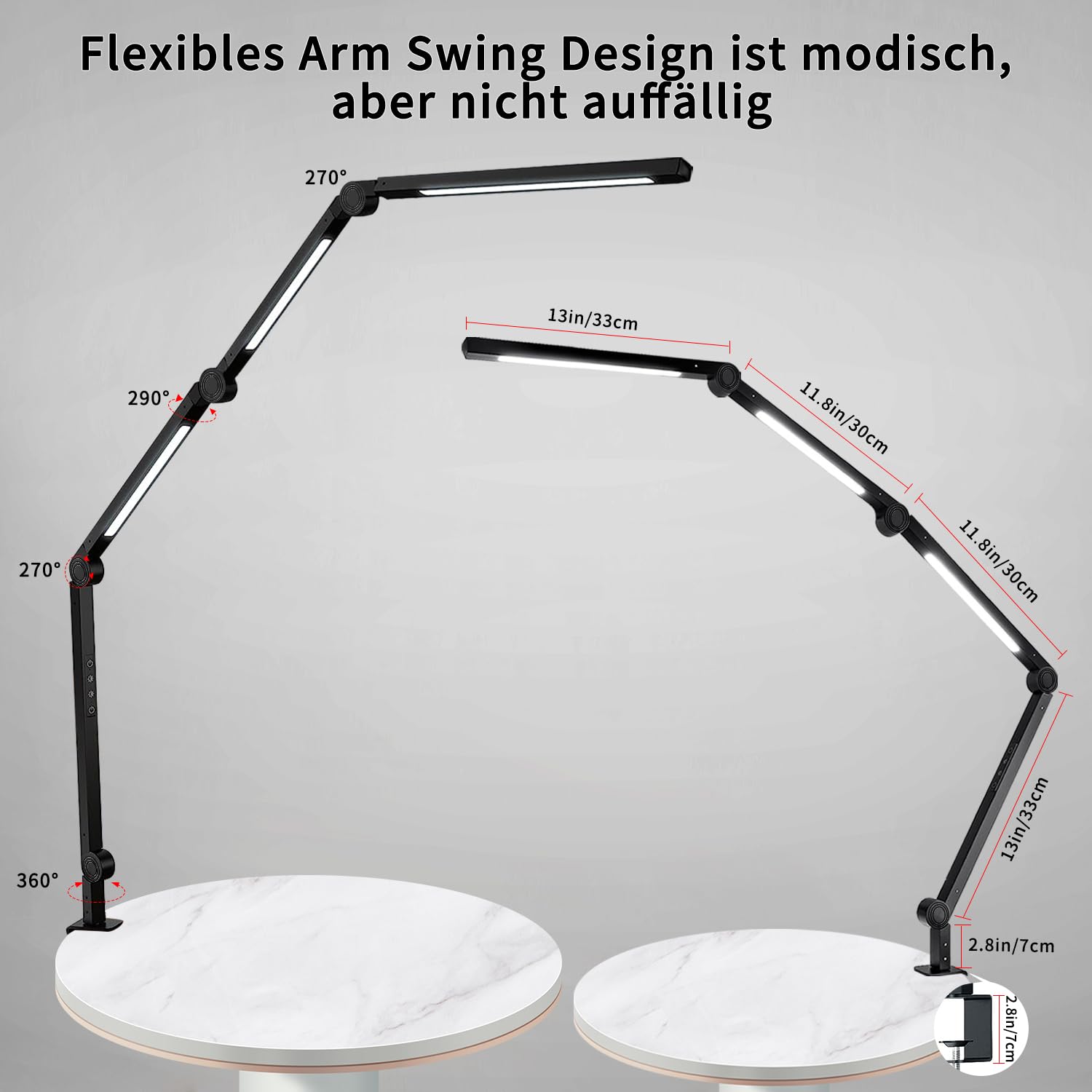 Die LED-Schreibtischlampe von vimeepro bietet vier verschiedene Farbtemperaturen (3500 K bis 6000 K) mit fünf Helligkeitsstufen für jeden Farbmodus (20 % bis 100 %). Die sanfte Beleuchtungsoption soll einer Ermüdung der Augen vorbeugen. Die LED-Schreibtischlampe verfügt über eine Memory-Funktion, die sich Ihre zuletzt verwendeten Einstellungen merkt, sodass sie sich bei Ihrer nächsten Verwendung mit diesen Einstellungen einschaltet. Diese verstellbare Klemmlampe ist eine ideale Wahl zum Lernen, Lesen und Arbeiten. Verstellbare Schreibtischlampe mit LED: Die superflexible Schreibtischlampe ist klemmbar und ermöglicht es Ihnen, das Licht in jede gewünschte Richtung zu positionieren. Es verfügt über 3 Lichtleisten, die um 290° gedreht werden können, 4 stabile Drehpunkte, die sich um bis zu 270° bewegen lassen, und einen Klemmfuss, der um 360° gedreht werden kann. Sie können die Tischleuchte mühelos an den gewünschten Ort richten, um eine stimmungsvolle Beleuchtung zu schaffen. Nutzungssicherheit: Der hochwertige Lampenkörper aus Aluminium von vimeepro sorgt für eine hervorragende Wärmeableitung und verlängert die Lebensdauer der LED-Schreibtischlampe auf bis zu 50.000 Stunden. Ausserdem verfügt es über eine Metallklemme und stabile Gelenke, die es stabil machen und ein Herunterfallen verhindern. Dieses benutzerfreundliche Erlebnis bei der Verwendung für Ihr Heimbüro. Touch-Bedienelemente, Speicherfunktion und einfache Bedienung: Die Helligkeit und Farbtemperatur der LED-Schreibtischlampen von vimeepro werden angepasst Lässt sich leicht mit den verstellbaren berührungsempfindlichen Tasten an der Vorderseite kombinieren. Schreibtischlampe mit Memory-Funktion kann den zuletzt verwendeten Modus und die Helligkeit beibehalten. Schliessen Sie nach der Installation mit einem Metallmontageclip das Netzteil an und klicken Sie dann auf den Berührungsschalter. Ausgezeichnet: Wir versprechen 100 %. Wenn Sie mit unserer vimeepro LED-Schreibtischlampe nicht zufrieden sind, wenden Sie