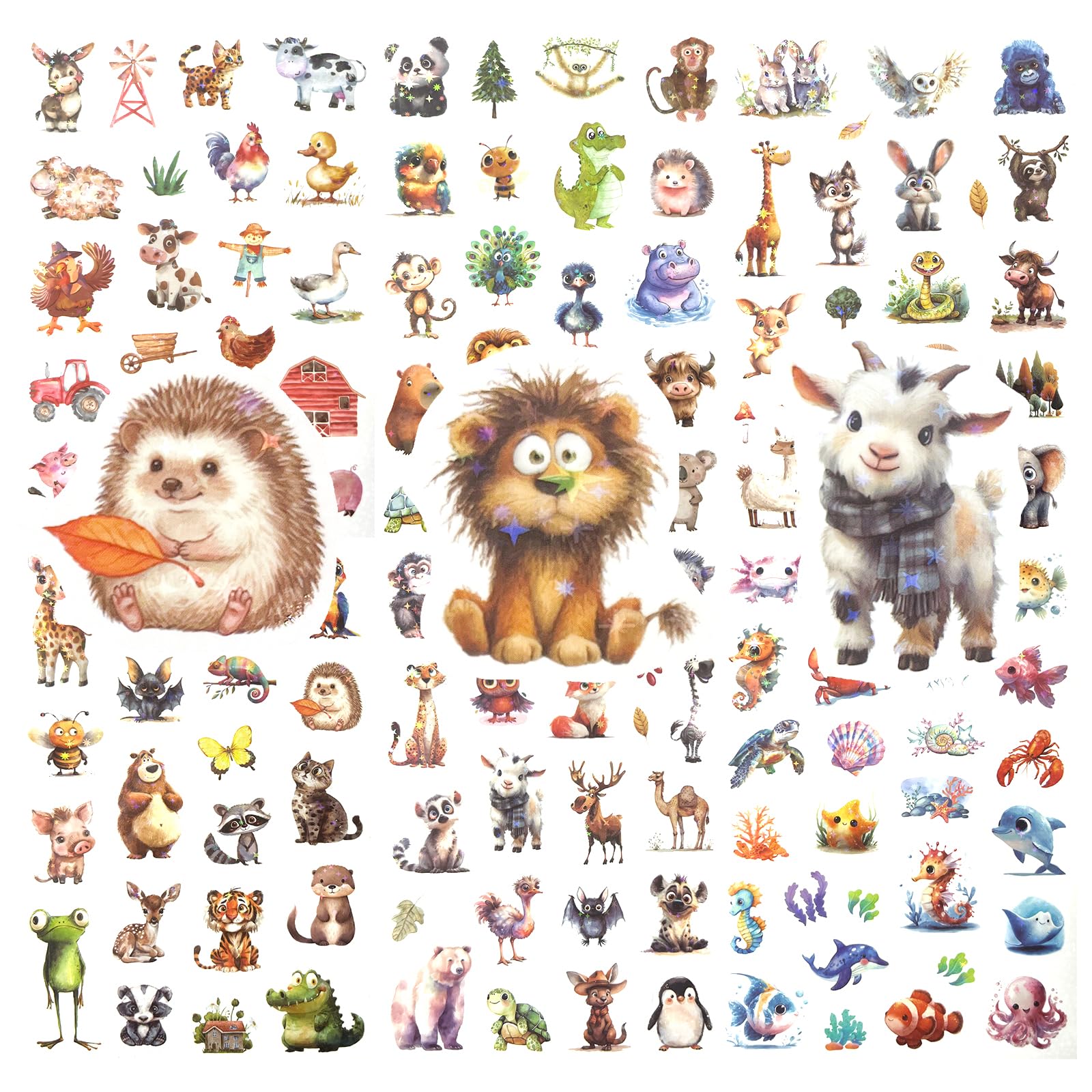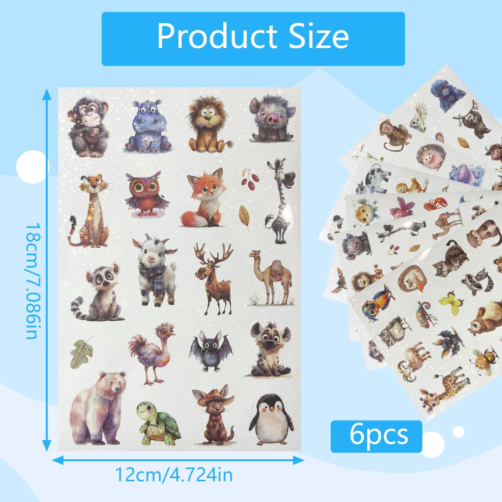 6 Bögen Tier Glitzer Sticker Kinder, Tiere Sticker Glitzer Aufkleber Kinder, Holografische Aufkleber Wasserfest Tiersticker für Skateboard Helme Kühlschränke Tischplatten Basteln Tieraufkleber