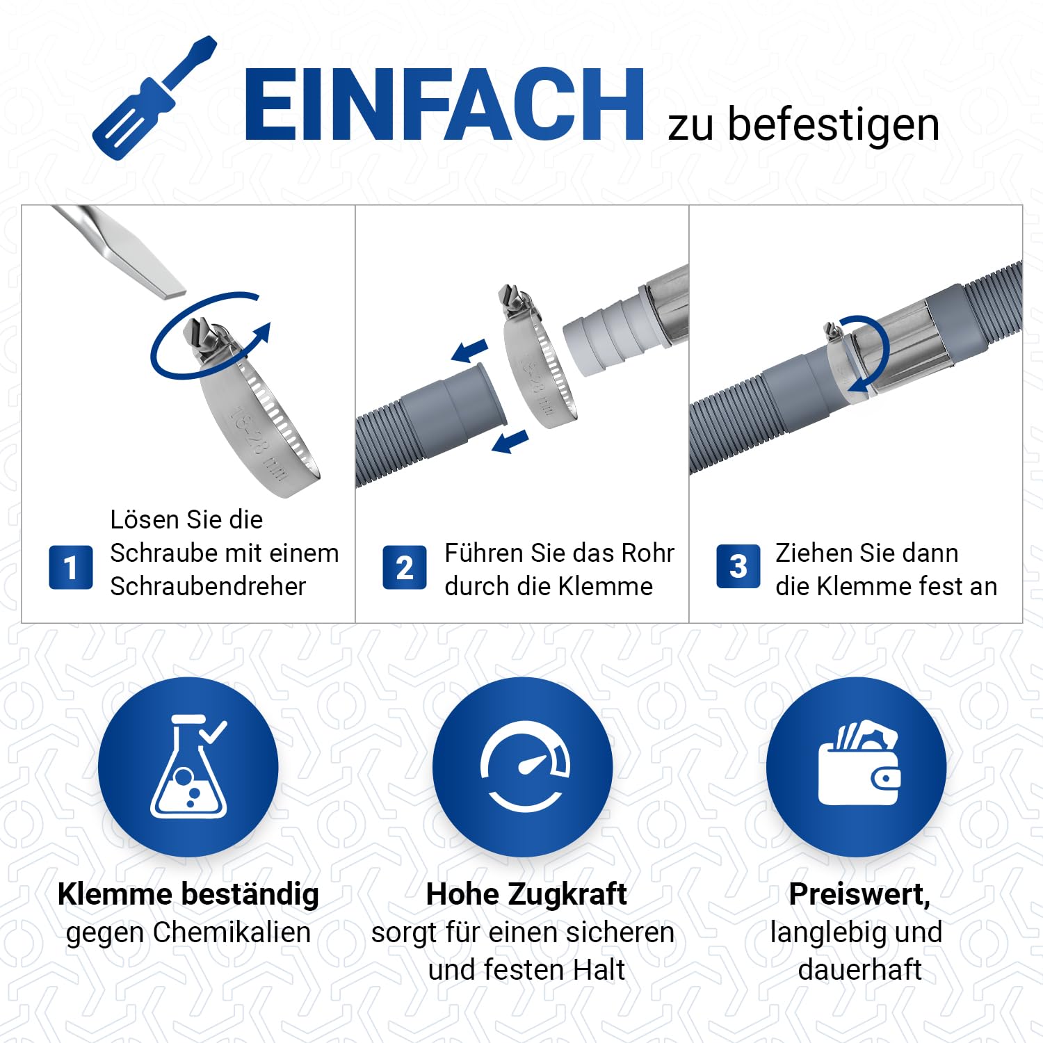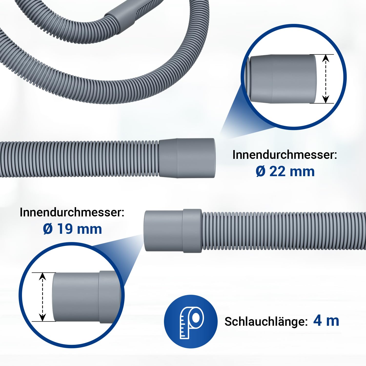 VIOKS Set Flexibler Abwasserschlauch Spülmaschine 4 Meter 19/22mmØ + 2x Klemmen Schlauchschellen Edelstahl 18-28mmØ + 1x Schlauch Verbindungsstück + 1x Haltebogen - Ablaufschlauch Waschmaschine Set