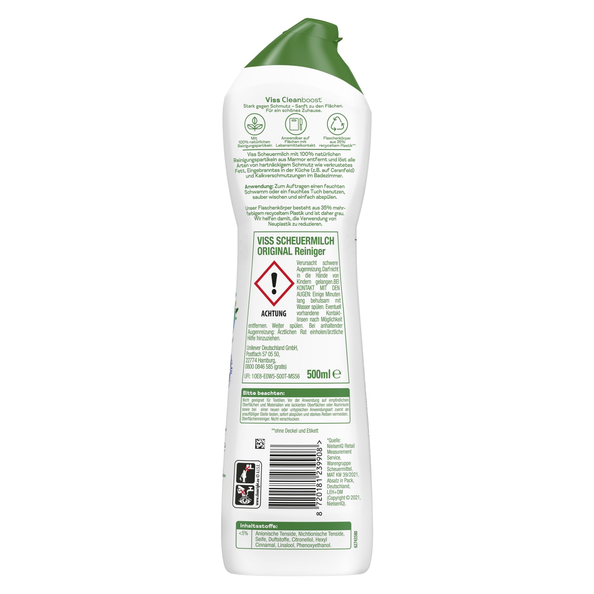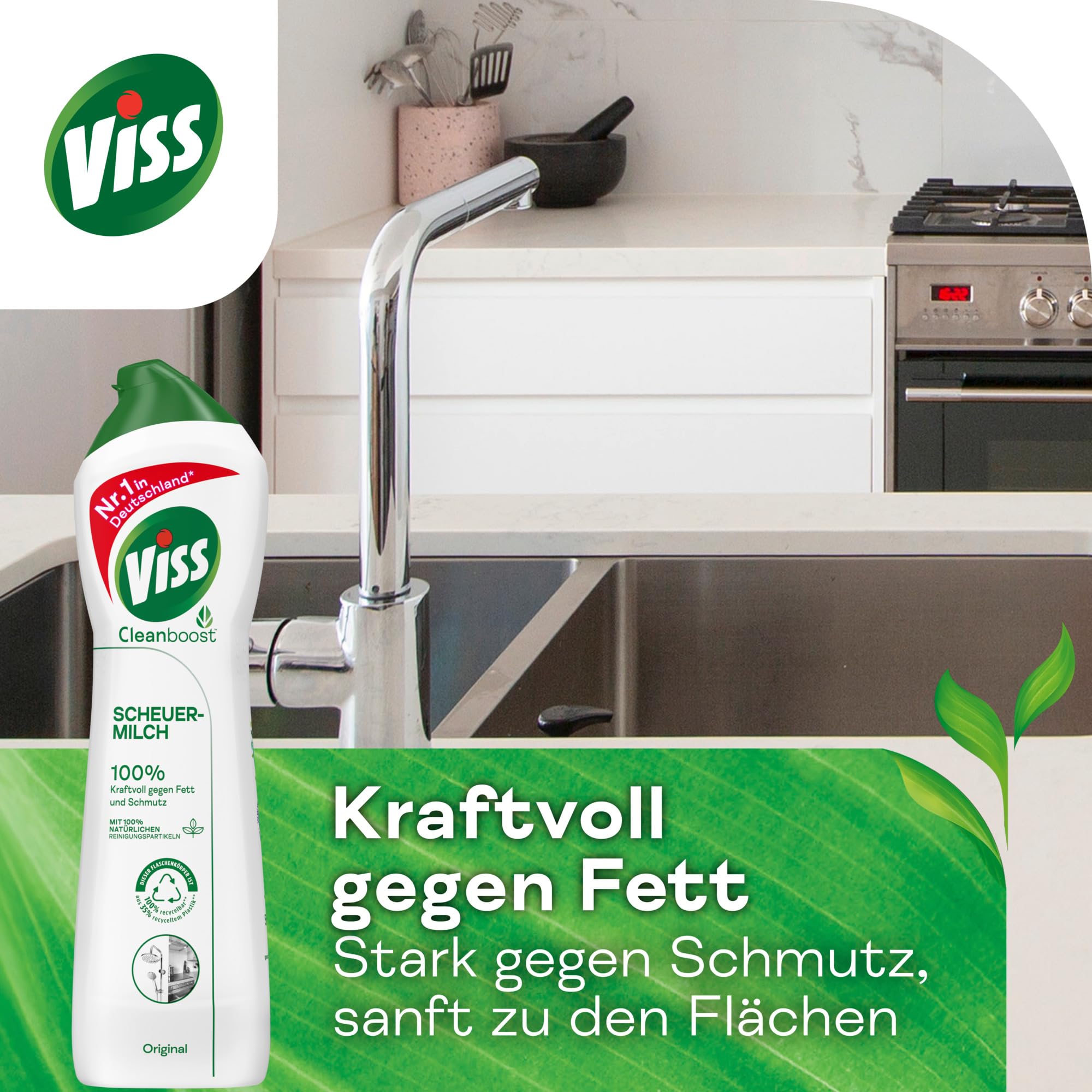 Die Viss Scheuermilch Original bietet eine unglaubliche Reinigungskraft für jeden Zweck. Millionen von 100% natürlichen Reinigungspartikeln in jedem Tropfen reinigen Küchen, Bäder und mehr. Das vielseitige Produkt entfernt Schmutz sowie Fett zu 100% und sorgt für Glanz und makellose Sauberkeit – jeden Tag. Die Scheuermilch pflegt die Oberflächen und entfernt auch den hartnäckigsten Schmutz zu 100% – mit Hilfe von natürlichen Reinigungspartikeln, die Verunreinigungen einfach abheben. Damit kann sie quasi auch als Hygiene Reiniger verwendet werden. Die Viss Scheuermilch bietet strahlenden Glanz für Keramik, Edelstahl, Emaille, Kunststoff und Glaskeramik, und der angenehme Meeresbrise-Duft der Viss Scheuermilch Original sorgt für ein langanhaltendes Frische-Erlebnis im ganzen Haus. Viss ist der Putz-Profi in Küche, Bad und im ganzen Haushalt, ob als Bodenreiniger, Badreiniger oder Küchenreiniger. Das kraftvolle Reinigungsmittel entfernt Schmutz sowie Kalk- und Fettablagerungen schnell und sichtbar. Der Flaschenkörper der Scheuermilch besteht zu 35% aus recyceltem Plastik (ohne Deckel und Etikett) und ist zu 100% recycelbar. Die Viss Scheuermilch Original enthält Millionen von natürlichen Reinigungspartikeln aus Marmor, die hartnäckigen Schmutz wie verkrustetes Fett, angebrannte Essensreste und Kalkrückstände entfernen. Die Anwendung des Produkts zum Beispiel als Küchenreiniger oder Badreiniger ist leicht, denn dank der einzigartigen Formel lässt sich die Viss Scheuermilch leicht und mit weniger Wasser abspülen. Zum Auftragen einen feuchten Schwamm oder Reinigungstücher benutzen, sauber wischen und einfach abspülen. Die Viss Scheuermilch gibt es mit verschiedenen, weiteren Duftrichtungen, passend für jedes Zuhause: Viss Scheuermilch Citrus mit frischem Zitronenduft, Viss Scheuermilch Frühlingsblüten oder Viss Scheuermilch mit Aktivbleiche. Alle sind einfach anzuwenden und sorgen für Sauberkeit und Glanz im ganzen Haus. Unsere vielseitige Scheuermilch ist die Nr. 1 in Deutschland*. Sie entfernt Schmutz zu 100% und sorgt für Glanz und makellose Sauberkeit. Seit den 70er-Jahren ist Viss ein verlässlicher Partner in der Haushaltsreinigung. * Quelle: NielsenIQ Retail Measurement Service, Warengruppe Scheuermittel, MAT KW 39/2021, Absatz in Pack, Deutschland, LEH+DM (Copyright © 2021, NielsenIQ).