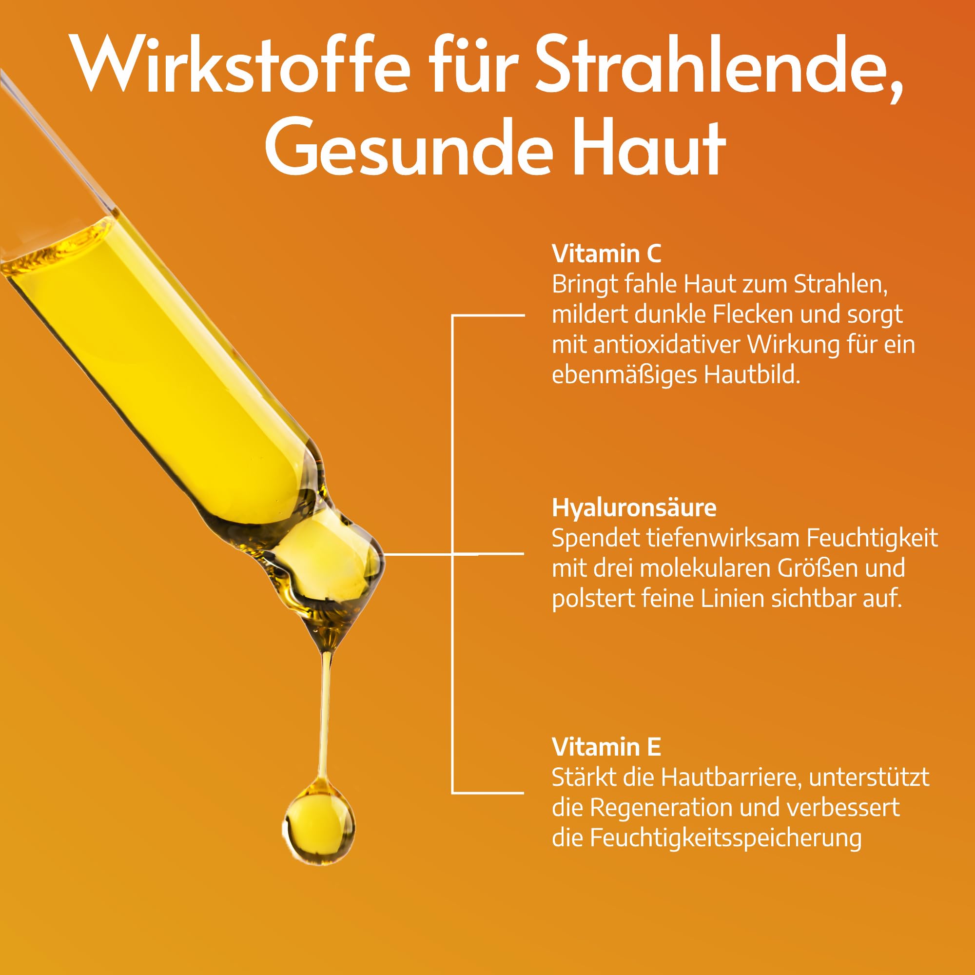 Vitamin C unterstuetzt die Kollagenproduktion, wirkt antioxidativ und hilft, Pigmentflecken, Akneflecken und uneinheitlichen Hautton sichtbar zu reduzieren. Hyaluronsaeure versorgt die Haut intensiv mit Feuchtigkeit, polstert sie auf und verleiht ein frisches, pralles Hautgefuehl. Vitamin E schuetzt die Haut vor freien Radikalen, staerkt die Hautbarriere und unterstuetzt die Regeneration.