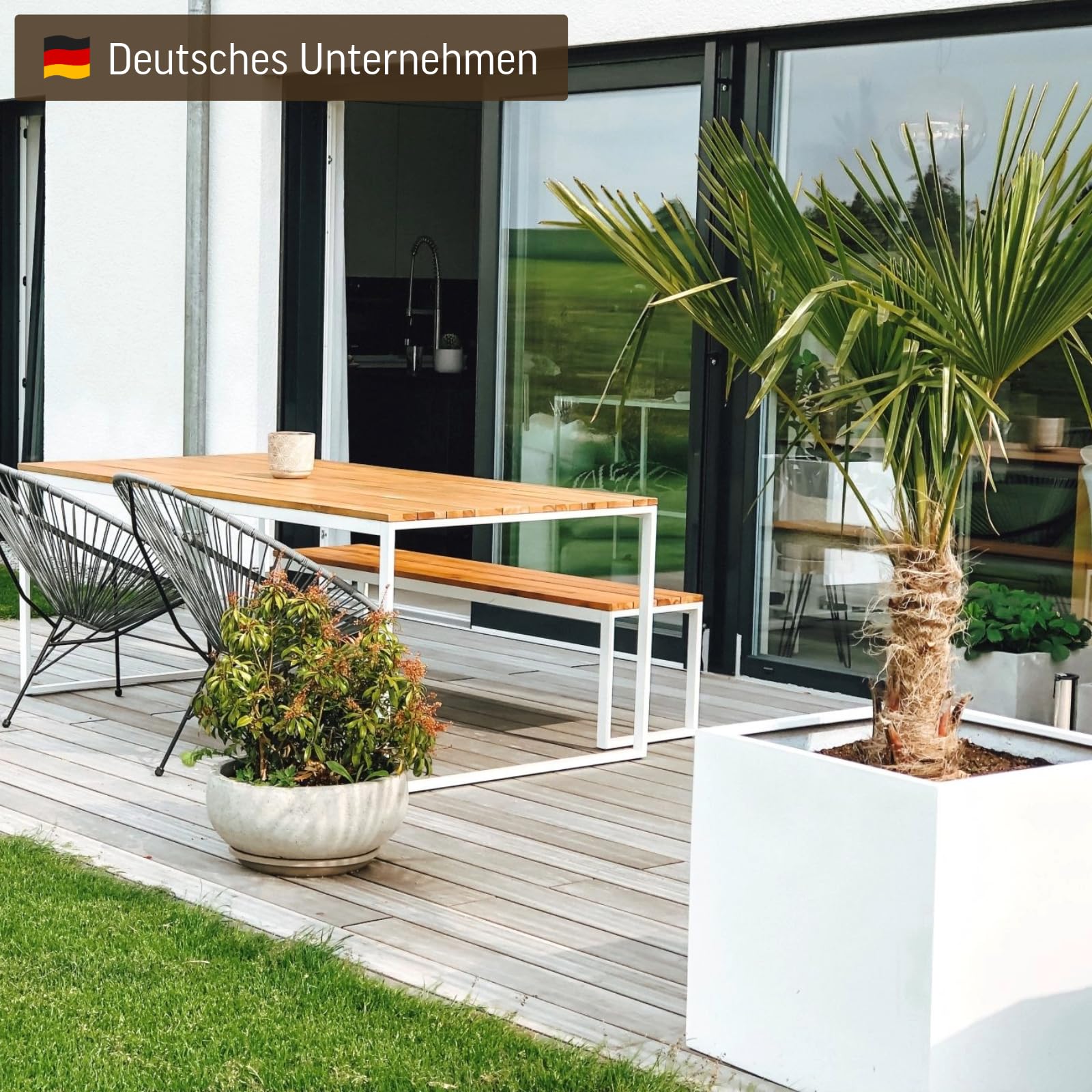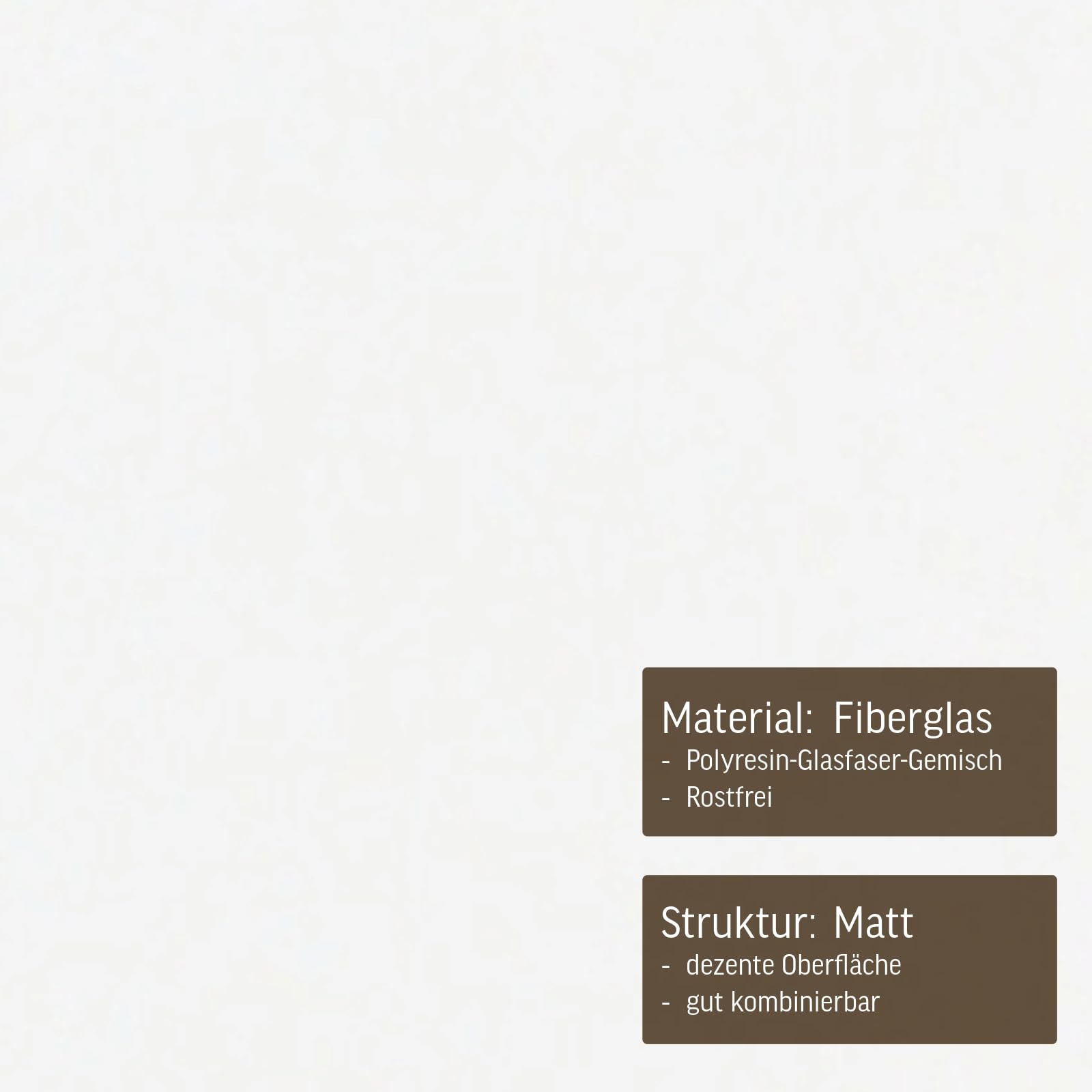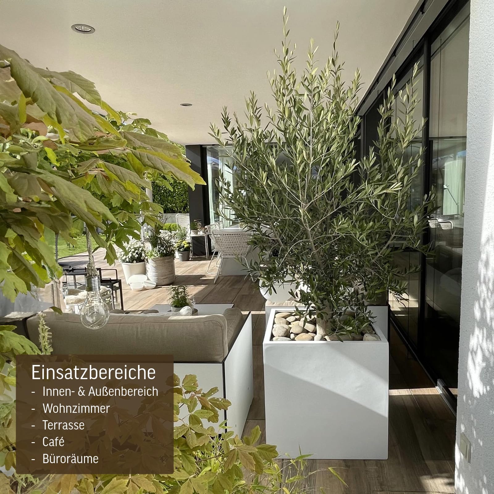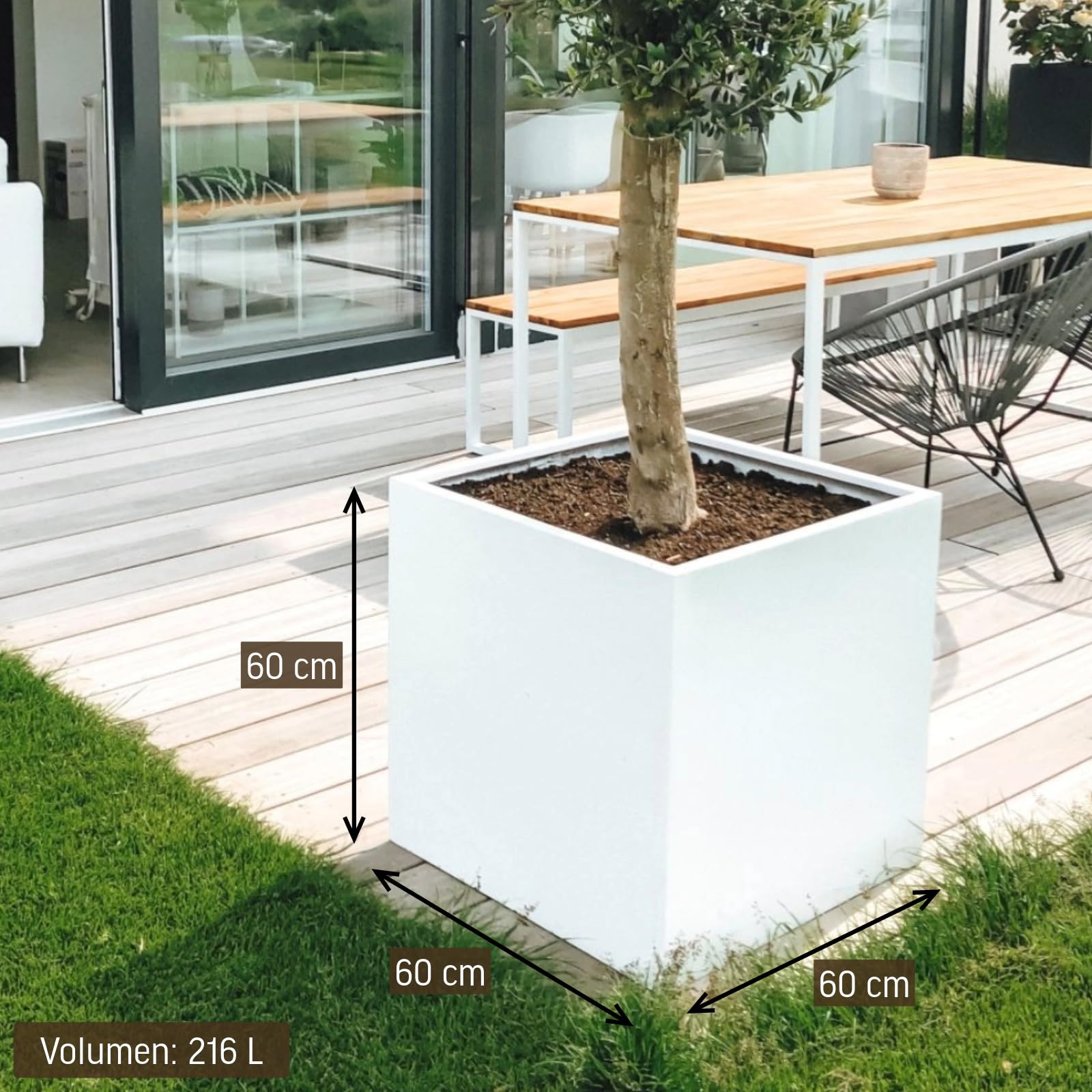 Dieser schöne Blumenkübel in der beliebten " Block " Form ist etwas Besonderes für Ihren Garten, Terrasse und Eingangsbereich. Die Kübel sind absolut wetterfest. Obwohl der Kübel besonders für den Aussenbereich entwickelt wurde, ist er natürlich auch im Innenbereich ein Blickfang. Das klassische schlichte Design ist im Moment sehr aktuell und beliebt. Durch die grossen Abmasse und mit hoher Bepflanzung können auch grössere Flächen optisch attraktiv gestaltet werden. Die weisse Oberfläche verleiht diesem Kübel einen besonders edlen Reiz. Als Material wurde Fiberglas mit Kunstharz ohne Gesteinsbeimischung verwendet, wodurch ein Aufsaugen von Feuchtigkeit verhindert wird. Der Kübel ist dadurch wiederum vor Frostschäden geschützt. Durch die kompakten Abmasse wird dieser Kübel auch in Hotels, Restaurants und Firmeneingängen verwendet. Standardmässig wird der Kübel ohne Löcher im Boden geliefert, um ihn auch für den Innenbereich nutzen zu können. Bei Aussenaufstellung bitte Löcher in den Boden bohren, um unnötige Staunässe zu verhindern. Der Kübel kann direkt bepflanzt werden. Kübelgrösse:(Höhe*Breite*Breite in cm ) * 60*60*60cm Für den Aussenbereich empfehlen wir ein paar Löcher in den Boden zu bohren mit einem Steinbohrer.