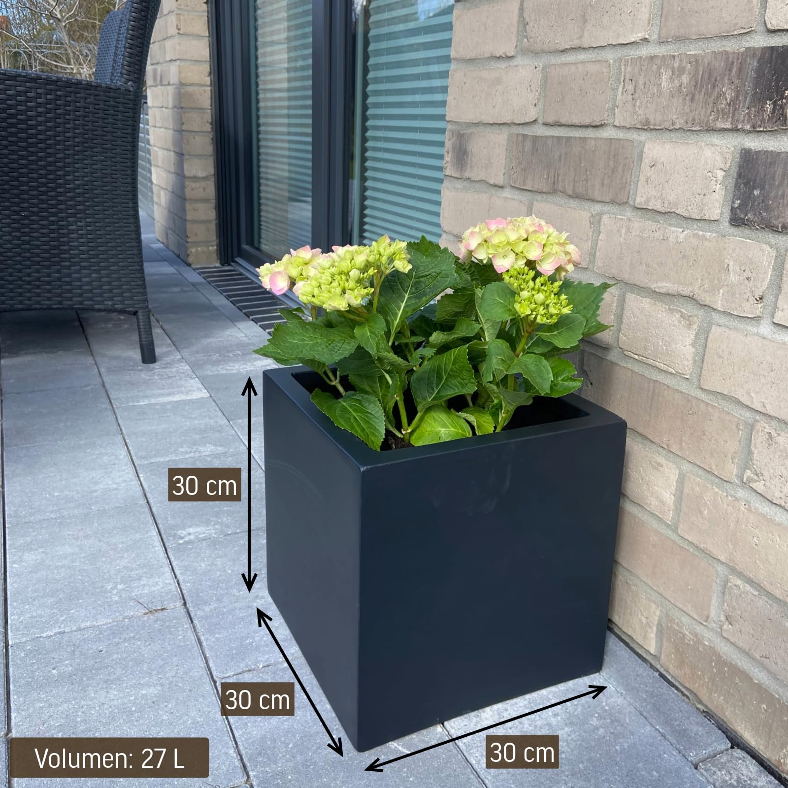 Erleben Sie die aussergewöhnlichen Eigenschaften unseres Pflanzkübels aus hochwertigem Fiberglas – einem beständigen Material, das nicht nur wetterfest, sondern auch frostsicher ist. Geben Sie Ihrem Outdoor-Bereich das ganze Jahr über eine stilvolle Note! Dieser Pflanzkübel, speziell für den Aussenbereich entwickelt, verschönert nicht nur Ihre Terrasse, sondern auch Ihren Garten oder Balkon und setzt elegante Akzente zu jeder Jahreszeit. Die schlichte Würfel-Form in Anthrazit Matt macht diesen Pflanzkübel nicht nur im Freien, sondern auch in Ihrem Innenbereich zu einem zeitlosen Blickfang. Das matte Anthrazit fügt sich harmonisch in unterschiedlichste Raumkonzepte ein und verleiht Ihrem Wohnraum eine moderne Eleganz. Mit einem kompakten Fassungsvermögen von etwa 27 Litern bietet dieser Blumenkübel vielfältige Gestaltungsmöglichkeiten. Platzieren Sie Ihre bevorzugten Pflanzen oder Blumen und schaffen Sie eine charmante grüne Oase, die Ihrem Garten oder Wohnraum eine frische Atmosphäre verleiht. Die optimalen Masse von 30 x 30 x 30 cm (Höhe x Breite x Tiefe) machen diesen Pflanzkübel äusserst vielseitig einsetzbar. Egal, ob als dekoratives Einzelstück oder in Kombination mit anderen Elementen – er wird zum zentralen Gestaltungselement, das Ihren Aussen- oder Innenbereich bereichert. Für den Aussenbereich empfehlen wir ein paar Löcher in den Boden zu bohren mit einem Steinbohrer.