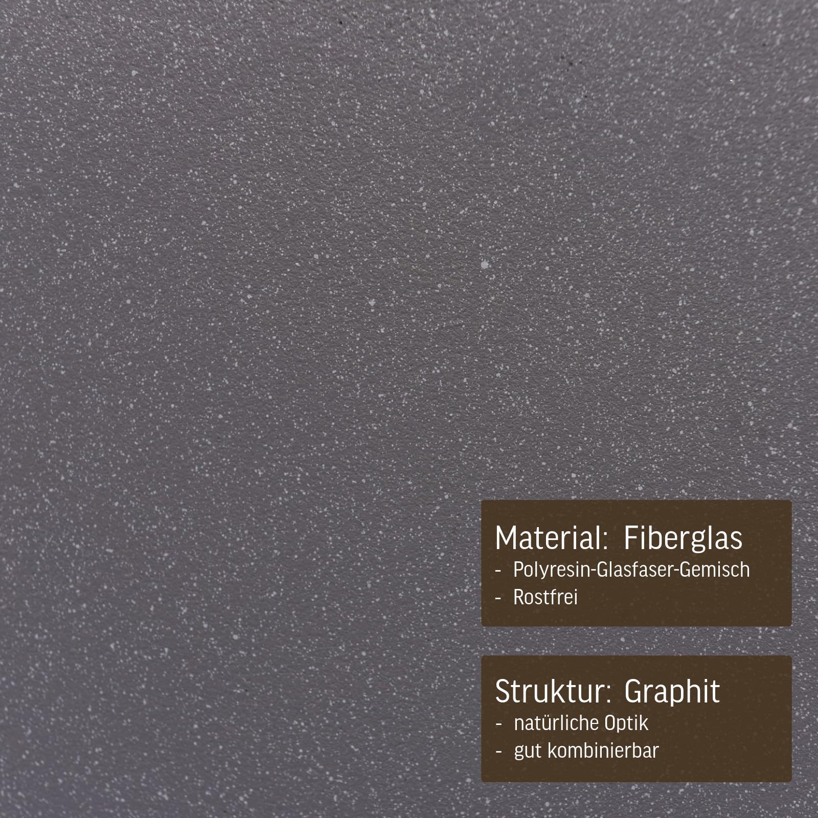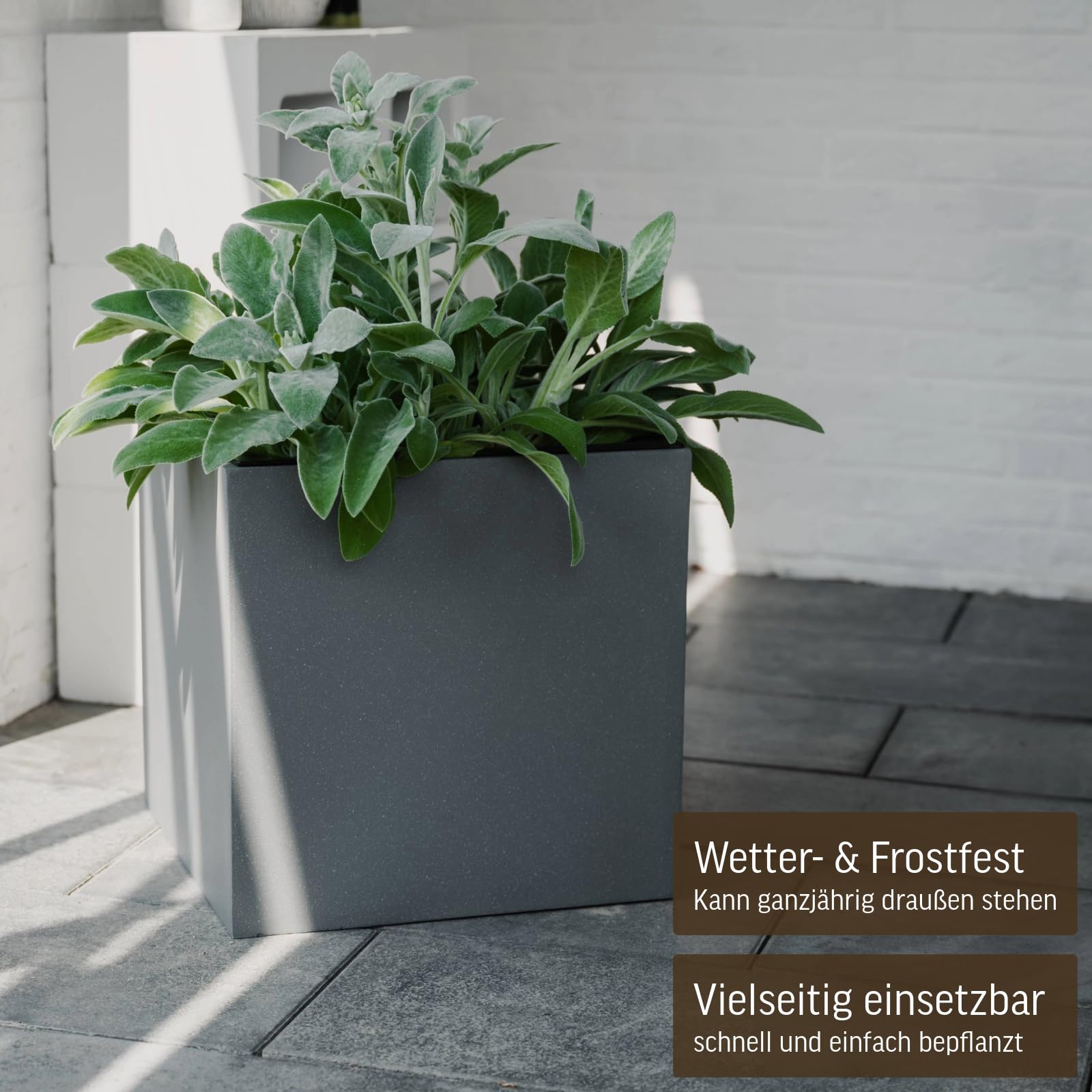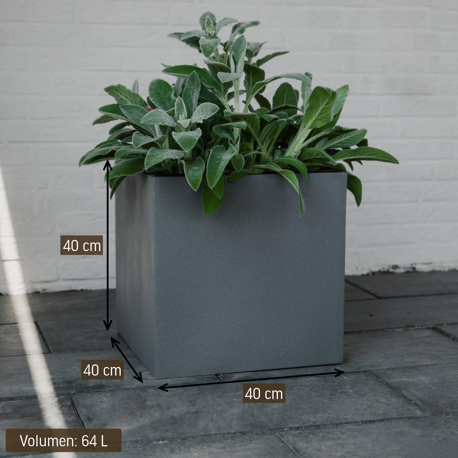 Verleihen Sie Ihrem Aussen- oder Innenbereich eine zeitlose Eleganz mit unserem hochwertigen Pflanzkübel aus strapazierfähigem Fiberglas, einem Material, das nicht nur wetterfest, sondern auch frostsicher ist. Der Pflanzkübel ist mehr als nur ein dekoratives Element – er ist eine robuste Lösung für jede Umgebung. Dank des wetterbeständigen Fiberglases eignet er sich perfekt für den Outdoor-Bereich und kann das ganze Jahr über Ihre Terrasse, Ihren Garten oder Balkon verschönern. Diese schlichte Würfel-Form in edlem Graphitgrau macht den Pflanzkübel auch für den Innenbereich zu einer idealen Wahl. Die zeitlose Ästhetik fügt sich nahtlos in verschiedene Raumkonzepte ein und verleiht Ihrem Zuhause eine besondere Note. Mit einem beeindruckenden Fassungsvermögen von etwa 64 Litern bietet unser Blumenkübel ausreichend Platz für eine vielseitige Bepflanzung. Setzen Sie Ihre Lieblingsblumen, Sträucher oder sogar kleine Bäume in Szene und gestalten Sie Ihren Aussen- oder Innenbereich nach Ihren individuellen Vorstellungen. Die perfekte Grösse von 40 x 40 x 40 cm (Höhe x Breite x Tiefe) macht diesen Pflanzkübel zu einem vielseitigen Element, das sowohl als Einzelstück als auch in Kombination mit anderen Elementen Ihre persönliche grüne Oase gestaltet. Entdecken Sie die Fusion von Funktionalität und Ästhetik in einem Pflanzkübel, der nicht nur Ihre Pflanzen optimal zur Geltung bringt, sondern auch Ihren Wohnraum oder Garten mit zeitloser Schönheit bereichert. Für den Aussenbereich empfehlen wir ein paar Löcher in den Boden zu bohren mit einem Steinbohrer.