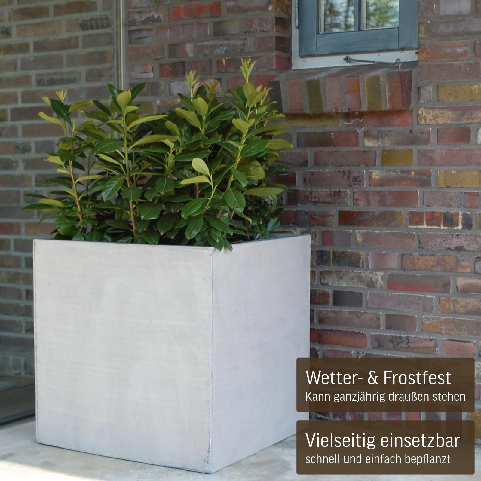 Grosser Quadratischer Fiberglas-Pflanzkübel "Block" 60x60x60 cm, Beton-DesignDer Pflanzkübel "Block" in seiner quadratischen Form 60x60x60 cm bietet sich für verschiedenartigste Pflanzen an, die ein grosses Wurzelwerk besitzen. In diesem Blumenkübel bringen Sie grosse Pflanzen unter und sorgen für einen schönen Anblick, der vor allem in Verbindung mit modernen Elementen und Baustilen hervorragend harmoniert. Im Beton-Design sieht der Pflanzkübel besonders modern und schick aus. Grau ist dabei eine Farbe, die sich nahezu allen Farben ideal anpasst. Durch die Herstellung aus Fiberglas ist der Pflanzkübel ganzjährig im Freien einsetzbar und absolut wetterfest. Natürlich darf der "Block" auch im Innenbereich eingesetzt werden und hebt sich hier durch seine voluminöse Grösse von seinem Umfeld ab. Fiberglas gibt dem Pflanzkübel die Eigenschaft absolut wetterbeständig zu sein. Selbst im Winter überzeugt der Blumenkübel im Aussenbereich auf der Terrasse oder im Garten. Stellen Sie grosse und kleine "Block" nebeneinander auf und schaffen ein individuelles Erscheinungsbild. Sie können beispielsweise ein geschmackvolles stufenartiges Blumenkübelarrangement erstellen. Drinnen erzeugt der Blumenkübel mit seinem wuchtigen Aussehen eine einmalige Atmosphäre. Standardmässig wird der Kübel ohne Löcher im Boden geliefert, damit er auch für den Innenbereich genutzt werden kann. Bei Aussenaufstellung empfehlen wir Löcher in den Boden zu bohren, um unnötige Staunässe zu verhindern. Der Kübel kann direkt bepflanzt werden. Kübelgrösse (Höhe*Breite*Tiefe): 60*60*60 cm Für den Aussenbereich empfehlen wir ein paar Löcher in den Boden zu bohren mit einem Steinbohrer.