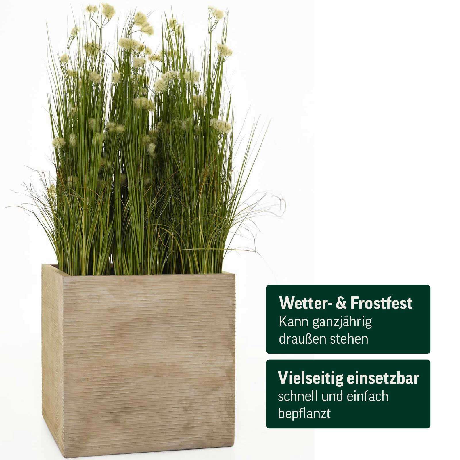 Erleben Sie zeitlose Eleganz und bemerkenswerte Beständigkeit mit unserem exklusiven Pflanzkübel aus hochwertigem Fiberglas – einem Material, das nicht nur wetterfest, sondern auch frostsicher ist. Verleihen Sie Ihrem Outdoor-Bereich zu jeder Jahreszeit einen Hauch von Naturschönheit! Unser Pflanzkübel, speziell für den Aussenbereich entwickelt, verschönert Ihre Terrasse, Ihren Garten oder Balkon und setzt stilvolle Akzente ganzjährig. Die schlichte Würfel-Form in edlem Gestreift Beige macht diesen Pflanzkübel nicht nur im Freien, sondern auch im Innenbereich zu einem zeitlosen Blickfang. Die dezente Farbgebung fügt sich harmonisch in verschiedene Raumkonzepte ein und verleiht Ihrem Wohnraum eine moderne Eleganz. Mit einem beeindruckenden Fassungsvermögen von etwa 125 Litern bietet dieser Blumenkübel vielfältige Gestaltungsmöglichkeiten. Platzieren Sie Ihre bevorzugten Pflanzen oder kleine Bäume und schaffen Sie eine individuelle grüne Oase, die Ihren persönlichen Stil widerspiegelt. Die grosszügigen Masse von 50 x 50 x 50 cm (Höhe x Breite x Tiefe) machen diesen Pflanzkübel äusserst vielseitig einsetzbar. Ob als imposantes Einzelstück oder in Kombination mit anderen Elementen – er wird zum zentralen Gestaltungselement in Ihrem Garten oder Wohnraum. Erleben Sie die harmonische Verbindung von Funktionalität und Ästhetik mit unserem Fiberglas-Pflanzkübel. Nicht nur eine Bereicherung für Ihre Pflanzen, sondern auch ein stilvolles Möbelstück, das Ihrem Zuhause eine zeitlose Note verleiht. Für den Aussenbereich empfehlen wir ein paar Löcher in den Boden zu bohren mit einem Steinbohrer.