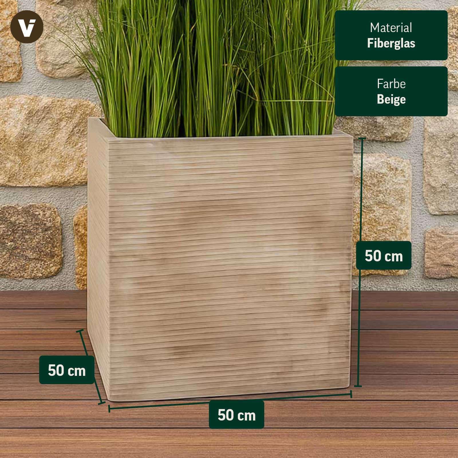 VIVANNO Pflanzkübel Fiberglas Block Frostsicher - 50x50x50 cm - Gestreift Beige - Blumenkübel Quadratisch für Draussen und Drinnen