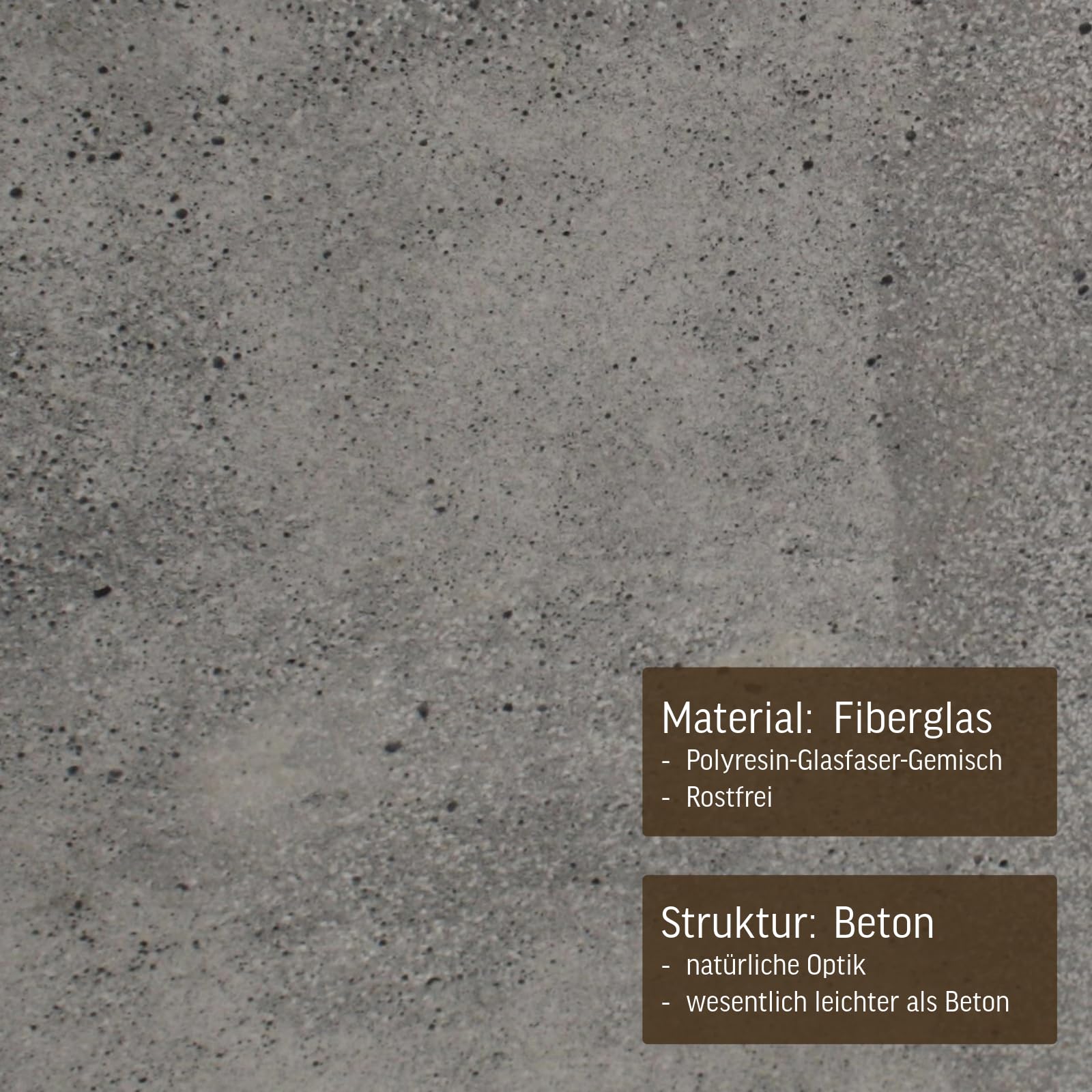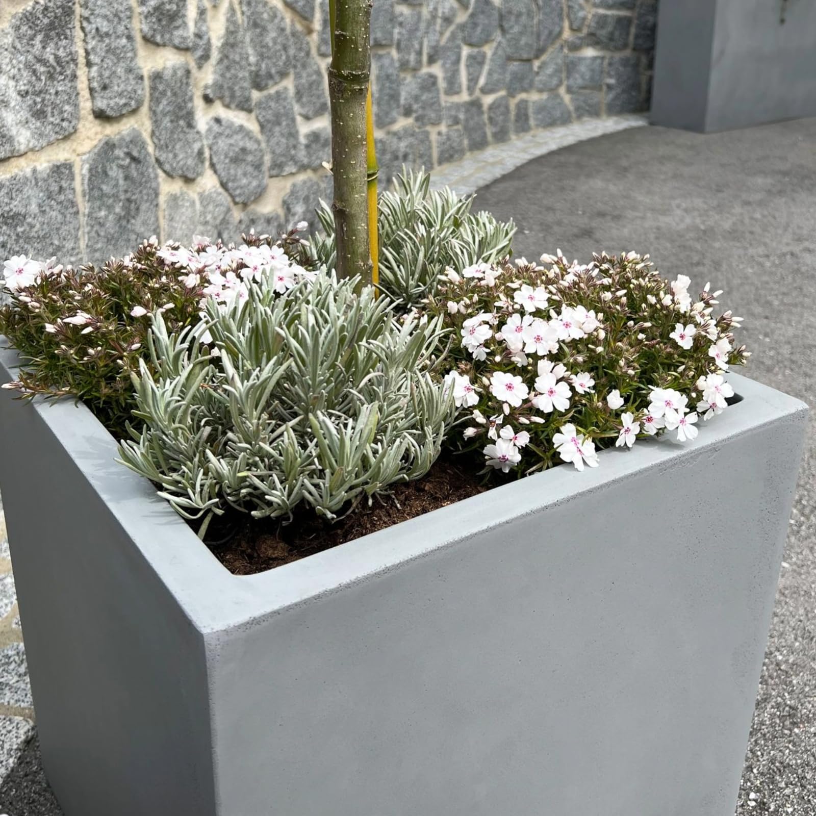 Quadratischer Pflanzkübel Blumenkübel "Block" 40x40x40 cm, Beton-DesignDas quadratische Design des "Block" mit dem Mass 40x40x40 cm bietet Spielraum für die Bepflanzung mit hohen oder flachen und rankenden Pflanzen und Gewächsen. Gleichzeitig sind die geradlinige Form und die Farbe Grau nahezu unbegrenzt kombinierbar. Insbesondere das Beton-Design verleiht dem "Block" das gewisse Etwas mit einer einmaligen Oberflächenstruktur. Aufgrund der Herstellung des Pflanzkübels aus dem hochwertigen Material Fiberglas entsteht ein robuster und stabiler Korpus. Dadurch wird sichergestellt, dass der wetterfeste Pflanzkübel auch bei widrigen Wetterverhältnissen draussen stehen bleiben darf. Harte Winter mit eisigen Temperaturen hält der "Block" aus Fiberglas im Beton-Design stand. Stellen Sie grosse und kleine "Block" nebeneinander auf und schaffen ein individuelles Erscheinungsbild. Sie können beispielsweise ein geschmackvolles stufenartiges Blumenkübelarrangement erstellen. Drinnen stellen Sie mit dem Blumenkübel Ihre Blumen dekorativ zur Schau. Standardmässig wird der Kübel ohne Löcher im Boden geliefert, damit er auch für den Innenbereich genutzt werden kann. Bei Aussenaufstellung empfehlen wir Löcher in den Boden zu bohren, um unnötige Staunässe zu verhindern. Der Kübel kann direkt bepflanzt werden. Für einen einfacheren Bepflanzungsvorgang empfehlen wir den 39er Einsatz. Sie müssen dann nicht den gesamten Kübel füllen. Der Einsatz kann direkt bepflanzt werden. Einsätze müssen extra bestellt werden! Kübelgrösse (Höhe*Breite*Tiefe): 40*40*40 cm Für den Aussenbereich empfehlen wir ein paar Löcher in den Boden zu bohren mit einem Steinbohrer.