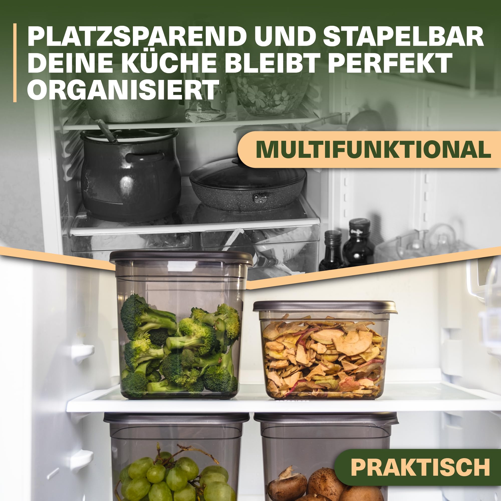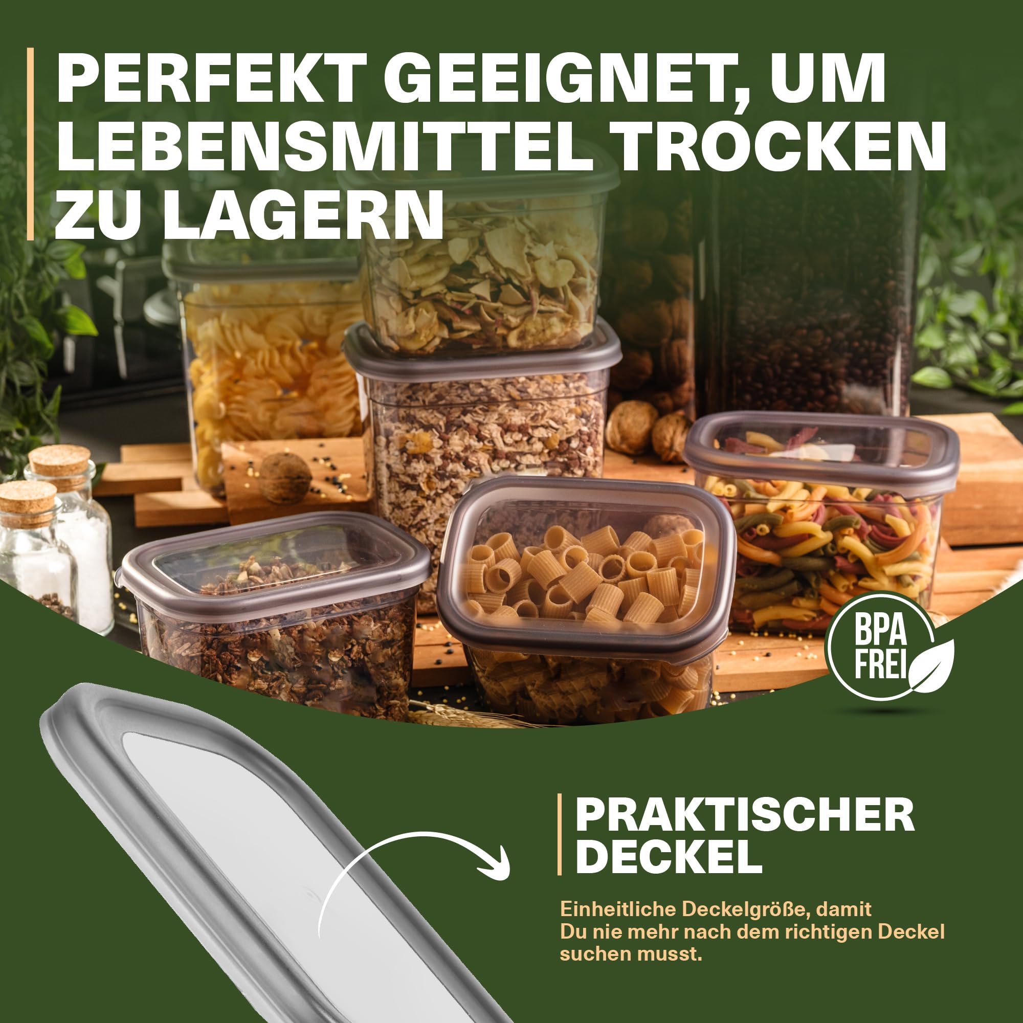 Mit den Vorratsdosen Set organisierst du deine Küche stilvoll und besonders ordentlich! Gewürze und Lebensmittel richtig aufbewahren! Damit der Geschmack und das Aroma von Gewürzen, Trockenfrüchten, Müslis und vielen anderen Lebensmitteln erhalten bleiben, solltest du sie immer luftdicht und trocken verschliessen. Denn in herkömmlichen Verpackungen geht der köstliche Geschmack einmal geöffnet schnell verloren. Zudem sieht das unübersichtliche Tütenchaos in den Küchenschränken nicht besonders schön aus. In unseren hochwertigen Vorratsdosen mit Deckel sind deine Lebensmittel sicher und gut organisiert aufgehoben! 20er Vorratsdosen Set in 4 praktischen Grössen!Ob Nudeln, runde Nüsse oder feines Mehl! Unser Vorratsdosen Set enthält genau die passende Grösse für sämtliche Leckereien und für vieles mehr! 5 x grosse Grösse: 19cm x 14cm x 10cm5 x mittlere Grösse: 14cm x 14cm x 10cm5 x kleine Grösse: 10cm x 14cm x 10cmHochwertig und spülmaschinenfest!Unsere Lebensmittel Vorratsdosen aus robustem Material können sowohl in der Spülmaschine als auch per Hand gereinigt werden. Der praktische Deckel ist mit nur einer Hand zu öffnen und verschliesst deine Lebensmittel luftsicher und schützt sie zudem vor Feuchtigkeit! Die Vorratsdosen können auch in der Mikrowelle verwendet werden (ohne Deckel).Passend für alle herkömmlichen Küchenschränke! Die eckige Form kann besonders platzsparend aneinandergereiht oder gestapelt werden. Die 4 Standardgrössen passen in den meisten Küchenschränken und Schubladen. Von deutschem Unternehmen! Die Marke VIWARES gestaltet schlichte und zeitlose Haushalts- und Küchenartikel - der Kernpunkt hierbei ist es; innovative und einfache Lösungen zu schaffen aus hochwertigen Materialien und durch erstklassige Verarbeitung!