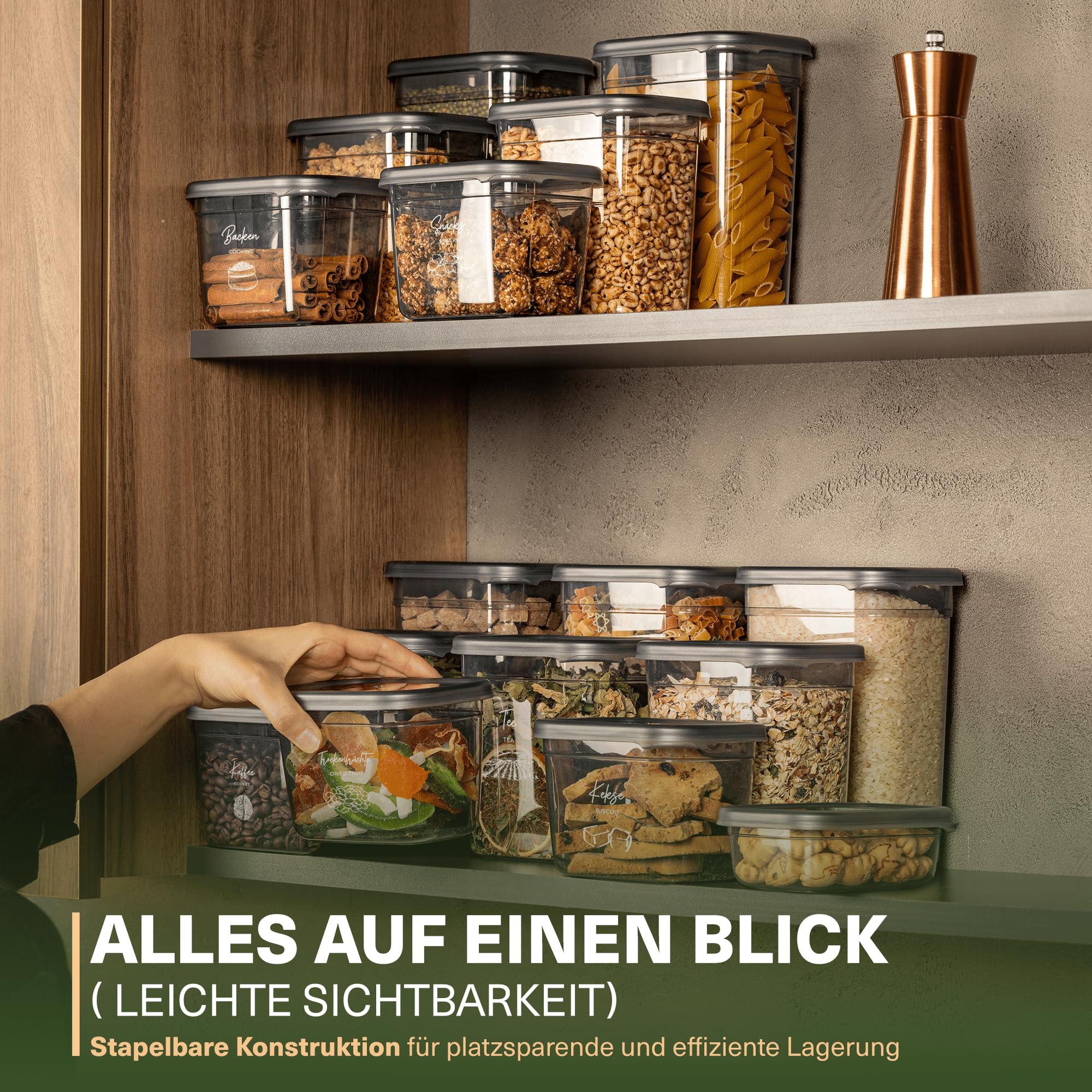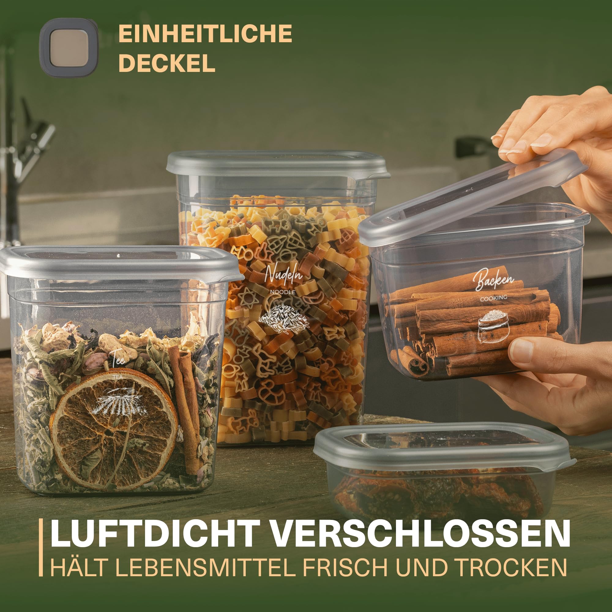 Mit den Vorratsdosen Set organisierst du deine Küche stilvoll und besonders ordentlich! Gewürze und Lebensmittel richtig aufbewahren! Damit der Geschmack und das Aroma von Gewürzen, Trockenfrüchten, Müslis und vielen anderen Lebensmitteln erhalten bleiben, solltest du sie immer luftdicht und trocken verschliessen. Denn in herkömmlichen Verpackungen geht der köstliche Geschmack einmal geöffnet schnell verloren. Zudem sieht das unübersichtliche Tütenchaos in den Küchenschränken nicht besonders schön aus. In unseren hochwertigen Vorratsdosen mit Deckel sind deine Lebensmittel sicher und gut organisiert aufgehoben! 20er Vorratsdosen Set in 4 praktischen Grössen!Ob Nudeln, runde Nüsse oder feines Mehl! Unser Vorratsdosen Set enthält genau die passende Grösse für sämtliche Leckereien und für vieles mehr! 5 x grosse Grösse: 19cm x 14cm x 10cm5 x mittlere Grösse: 14cm x 14cm x 10cm5 x kleine Grösse: 10cm x 14cm x 10cmHochwertig und spülmaschinenfest!Unsere Lebensmittel Vorratsdosen aus robustem Material können sowohl in der Spülmaschine als auch per Hand gereinigt werden. Der praktische Deckel ist mit nur einer Hand zu öffnen und verschliesst deine Lebensmittel luftsicher und schützt sie zudem vor Feuchtigkeit! Die Vorratsdosen können auch in der Mikrowelle verwendet werden (ohne Deckel).Passend für alle herkömmlichen Küchenschränke! Die eckige Form kann besonders platzsparend aneinandergereiht oder gestapelt werden. Die 4 Standardgrössen passen in den meisten Küchenschränken und Schubladen. Von deutschem Unternehmen! Die Marke VIWARES gestaltet schlichte und zeitlose Haushalts- und Küchenartikel - der Kernpunkt hierbei ist es; innovative und einfache Lösungen zu schaffen aus hochwertigen Materialien und durch erstklassige Verarbeitung!
