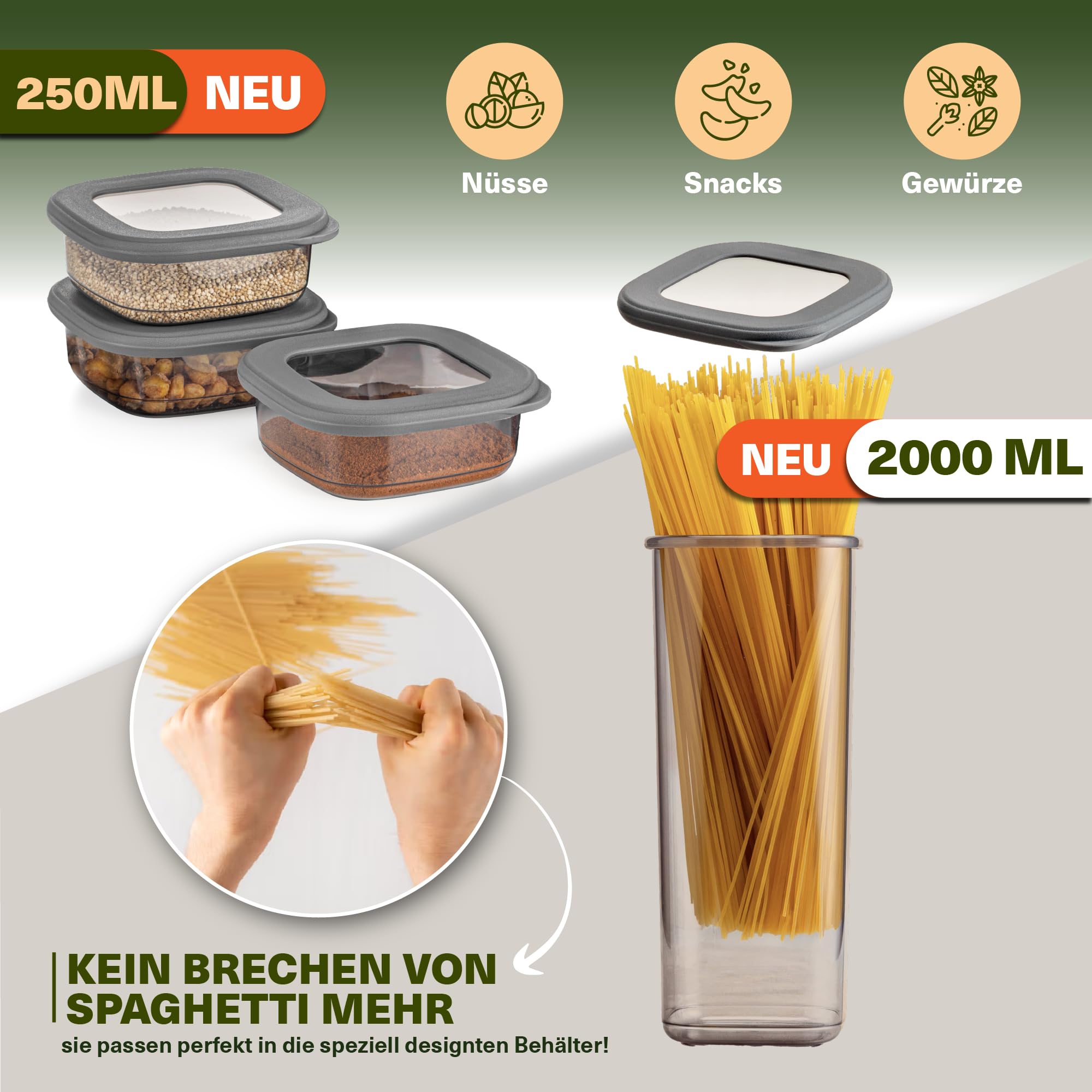 Küche Aufbewahrung & Organisation – mit Vorratsdosen luftdicht! Unsere Vorratsdosen mit Deckel luftdicht sind die perfekte Lösung für eine aufgeräumte Küche! Ob Mehlaufbewahrung, Müsli, Zucker, Reis oder Nudeln – diese Aufbewahrungsdosen mit Deckel halten deine Lebensmittel frisch und schützen sie vor Feuchtigkeit, Schädlingen und Gerüchen. Mit diesem Vorratsdosen-Set bringst du Struktur in deine Vorratshaltung. Die Food Storage Container sind ideal für die Organisation der Küche, egal ob im Schrank, der Speisekammer oder auf der Arbeitsplatte. Deine Vorteile: ✅ Luftdicht & Aromasicher – Die hochwertigen Vorratsbehälter mit Deckel schliessen fest und halten Lebensmittel länger frisch. Perfekt für Müsli-Aufbewahrung, Nudeln, Mehl, Zucker, Salz oder Backpulver. ✅ Platzsparendes Design – Die kitchen storage & organisation Lösung: Stapelbare Dosen mit Deckel, ideal für Schubladen oder Schränke. ✅ Vielseitige Nutzung – Perfekt als Cornflakes-Behälter, Mehlbehälter oder Süssigkeiten-Aufbewahrung. Auch für Gewürze, Kaffee, Tee oder Trockenfrüchte ideal. ✅ Robust & BPA-frei – Lebensmittelechte Plastikdosen mit Deckel, frei von Schadstoffen und sicher für deine Familie. ✅ Leichte Reinigung & Pflege – Die Frischhaltedosen mit Deckel sind spülmaschinenfest und für den Kühlschrank geeignet. Perfekt für: ✔ Organisation Küche & Vorratshaltung ✔ Pantry Organizer & Ordnungssystem Küche ✔ Küchenaufbewahrung in der ersten Wohnung ✔ Erste Wohnung - Küchenzubehör & Haushalt Lieferumfang: ✔ Vorratsgläser mit Deckel luftdicht (verschiedene Grössen) ✔ Plastikdosen mit Deckel für Essen ✔ Praktische Beschriftungsetiketten für deine Lebensmittelaufbewahrung Bringe mehr Ordnung und Frische in deine Küche – mit unseren Vorratsdosen-Sets!