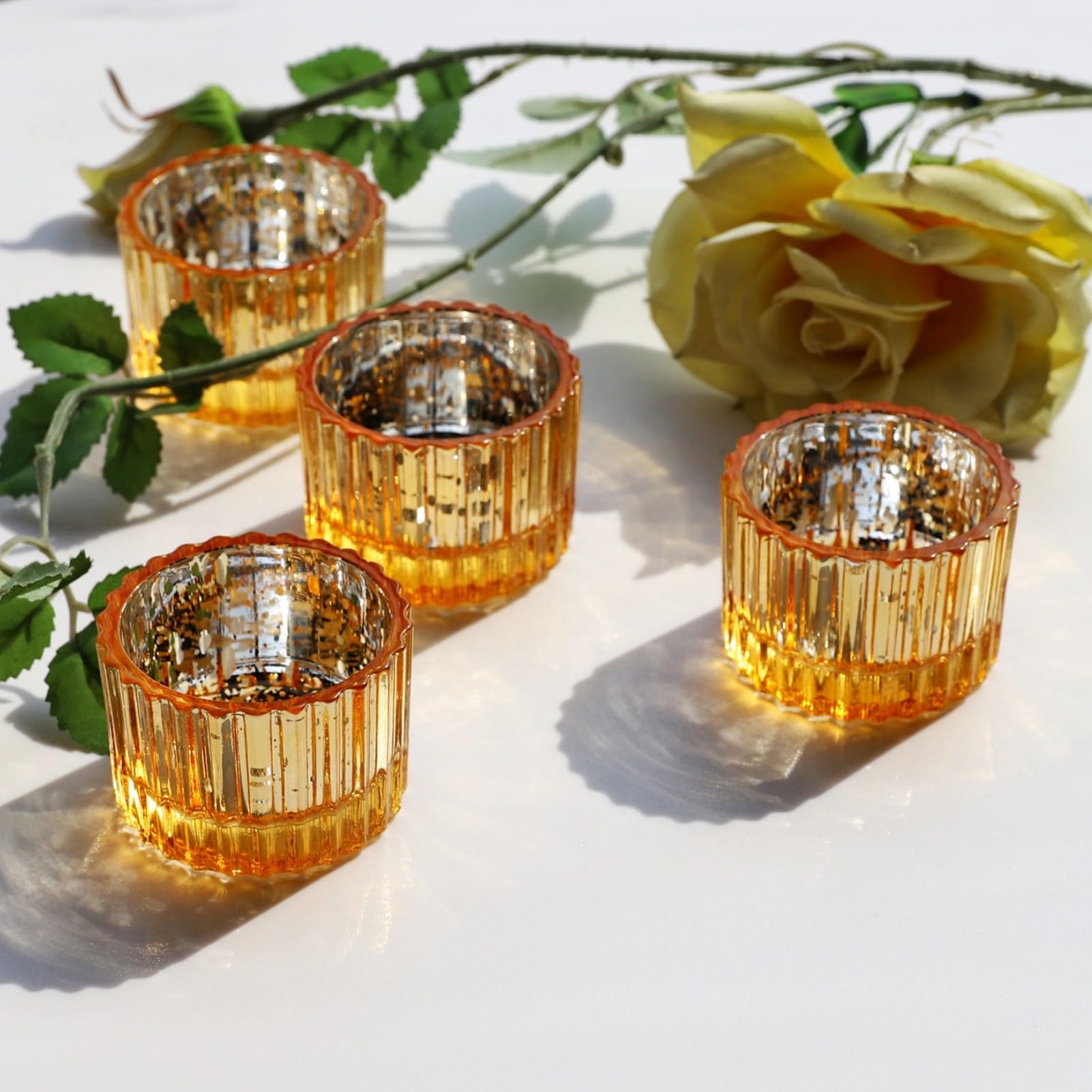 Vohocandle Gold Teelichthalter Glas – 12er Set für Hochzeiten, Teelichtgläser kleine für Windlichter Tischdeko, Teelichtglas für Weihnachten, Geburtstagsfeier, Urlaub, Party (5 × 3,5 cm, Gold)