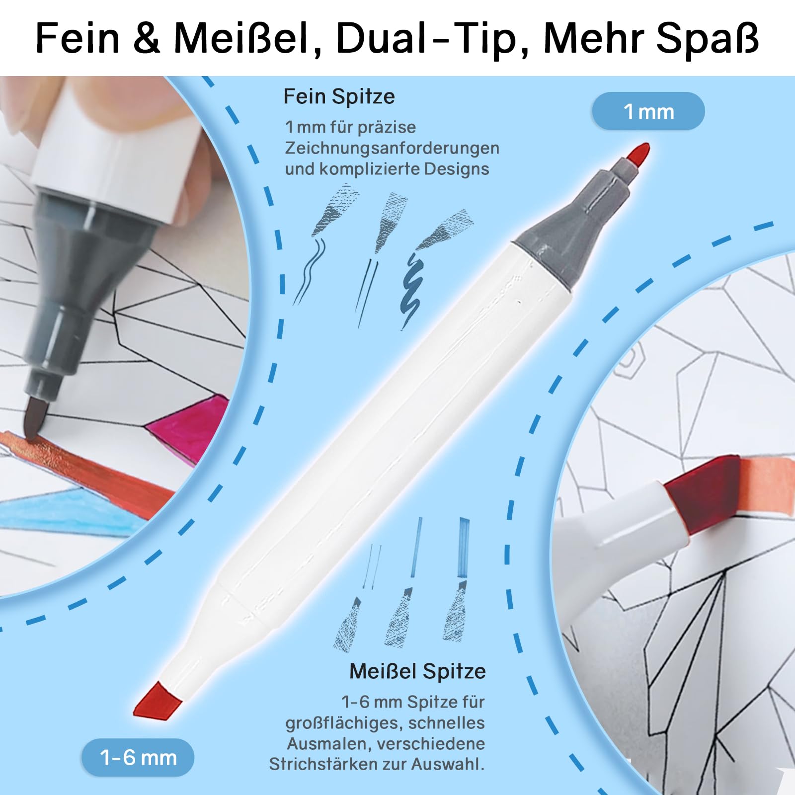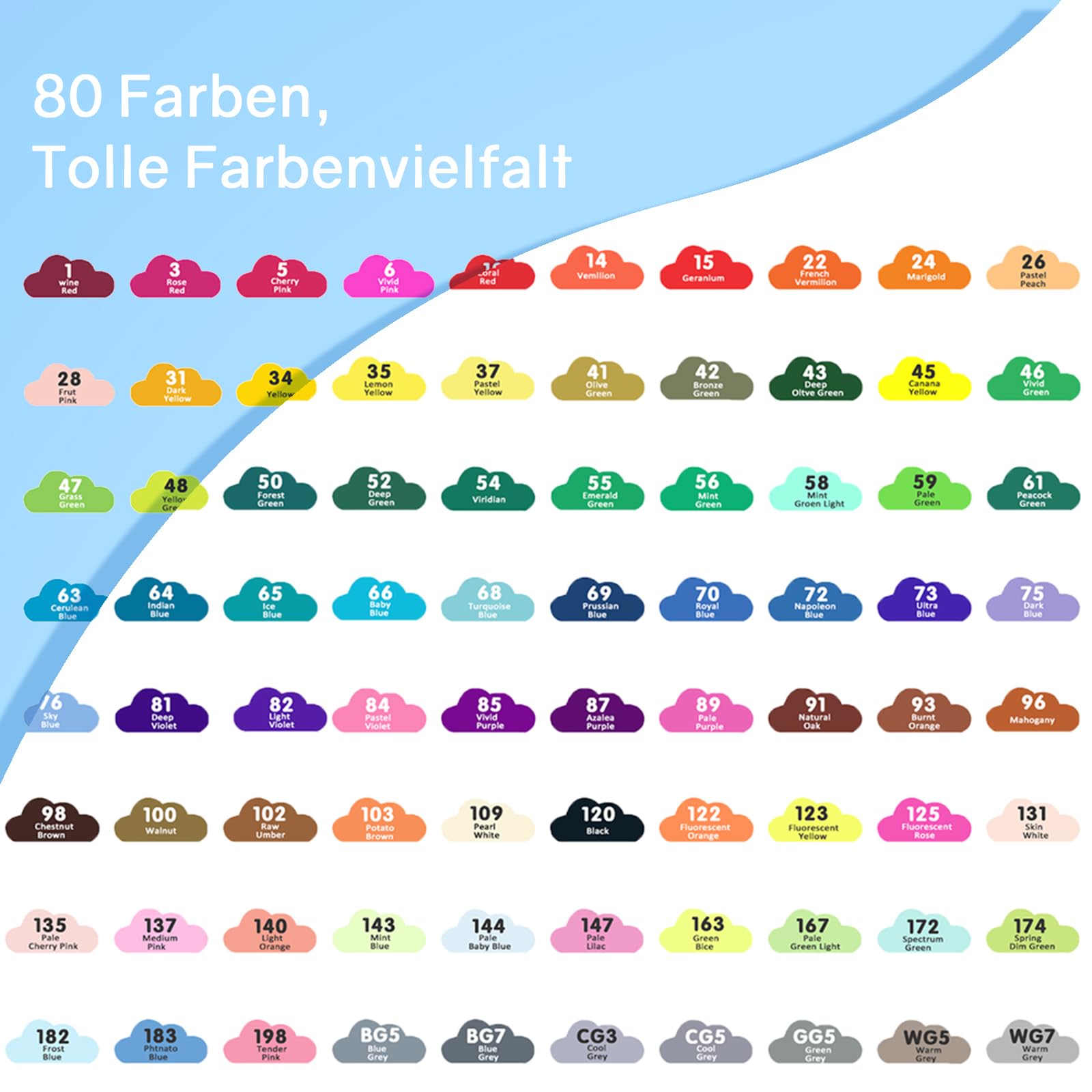 • 80 MARKIERER MIT LEUCHTENDEN FARBEN UND ZWEI SPITZEN – Der breite Meissel (1–7 mm) eignet sich ideal zum schnellen Einfärben grosser Bereiche, die feine Spitze (0,7 mm) für präzise Details. Die verschiedenen, schönen Farben mit schnell trocknender Tinte bieten viele kreative Möglichkeiten. Ideal für Designer und Künstler für Illustration, Design, Manga und mehr.