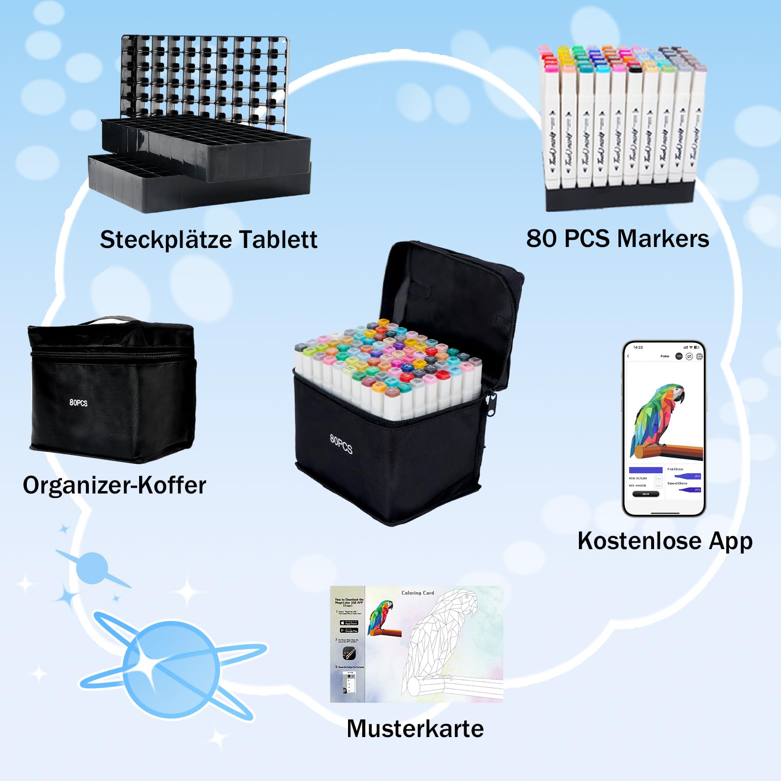 • Lieferumfang: 80 Filzstifte + 1 Farbreferenzblatt + Stiftetui + 1 Anwendung.