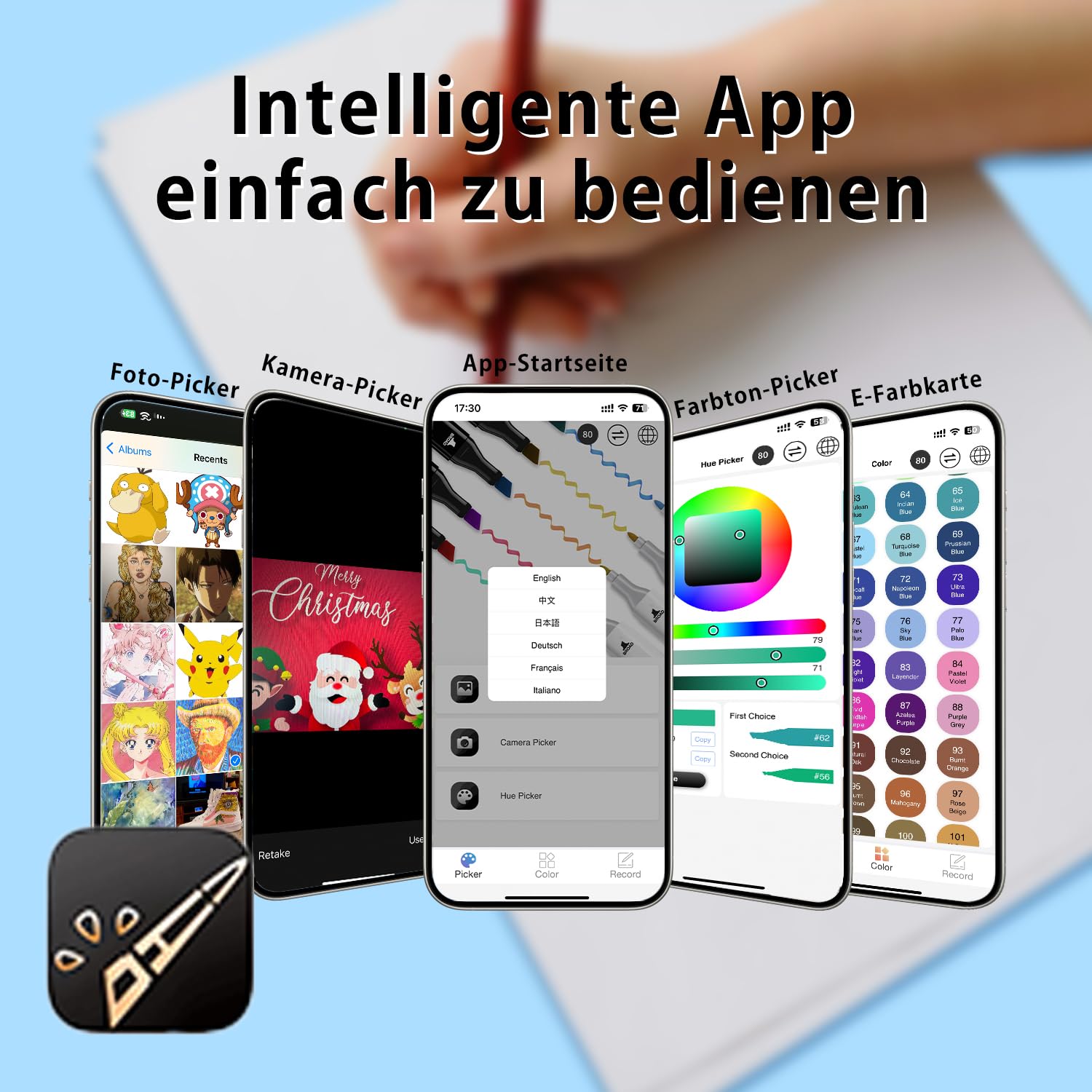 • Praktische APP, EINFACHE FARBGESTALTUNG – Diese App wird Kreativen Köpfen und Profis gleichermassen gefallen. Drei Modi (Fotoauswahl/Aufnahme/Farbton) helfen bei der Auswahl der passendsten Marker für Kunstwerke, indem Farbnummern vorgeschlagen werden. Die App kann auch ohne Internet funktionieren.