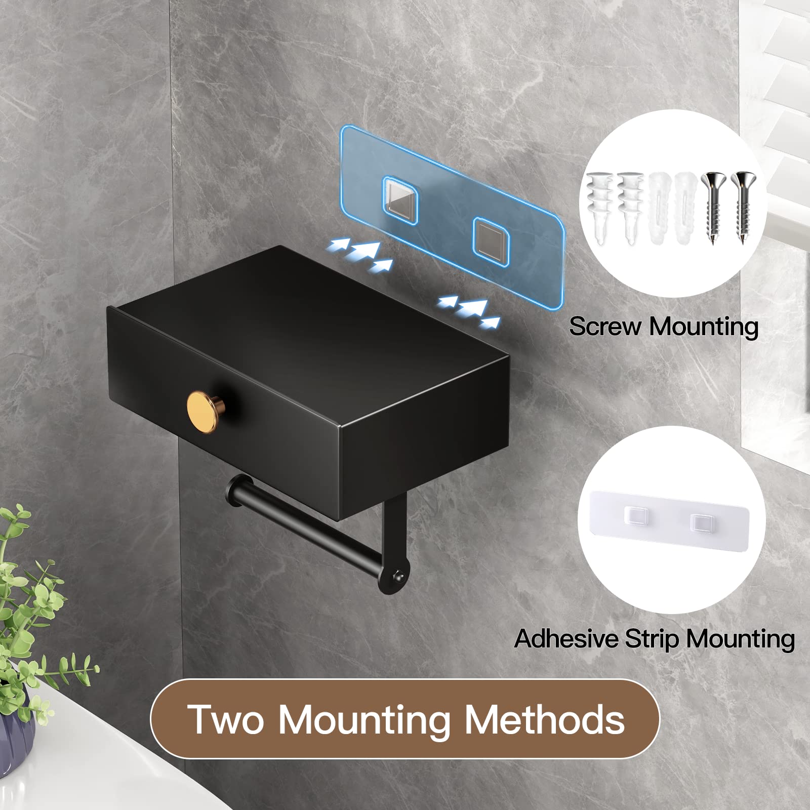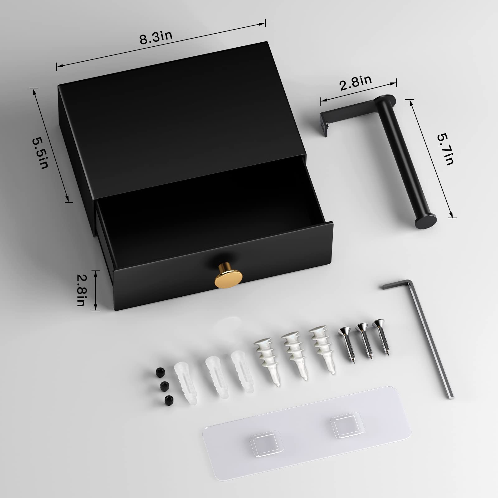 ERWEITERTER LAGERRAUM: Mit den Massen 8,3 x 5,5 x 2,8 Zoll ist unser Toilettenpapierhalter bisher der grösste seiner Art auf dem Markt. Es eignet sich nicht nur für Standard-Spültücher, sondern auch für grosse Baby-Feuchttuchpackungen. BEWAHREN SIE IHRE TÜCHER VERSTECKT: Es ist schön, Tücher und Damenprodukte neben der Toilette und der Schublade zu haben, um sie zu verstecken, und wir können die Oberseite als Telefonhalter verwenden. Bei anderen Modellen mit Deckel kann das Telefon nicht hineingelegt werden, wenn man die Tücher herausnimmt. Wir haben es zu einer Schubladenablage umgerüstet. Dadurch können wir unser Telefon und alles, was dazugehört, in die Schublade legen und dann die Schublade öffnen, um die Tücher zu holen. Befreien Sie unsere Hände völlig. SUPER EINFACH ZU INSTALLIEREN: Einfache Montage mit 2 verschiedenen Optionen. Es gibt eine Option zum Kleben/ohne Bohren; Trockenbauanker oder Schrauben für Wandpfosten. Einfach zusammenzubauen, Werkzeuge sind im Lieferumfang enthalten: 1 Klebestreifen, 2 Montageschrauben und 4 Anker (2 für Betonwände, 2 für Trockenwände). UMKEHRBARER TOILETTENPAPIERHALTER: Der Toilettenpapierhalter verfügt über eine schöne runde Stange zum Halten des Toilettenpapiers. Er kann auf der rechten oder linken Seite montiert werden, sodass Sie flexibel an die Gestaltung Ihres Badezimmers angepasst werden können. Da es aus dickerem Material besteht, sorgt es für ein sanftes und leises Ausrollen des Toilettenpapiers. ROSTFREI UND GLATTE OBERFLÄCHE: Das kleine Badezimmerregal besteht aus hochwertigem Edelstahl, der die Funktionen rostfrei, wasserdicht und hochtemperaturbeständig hat. Mattschwarzes Finish, keine scharfen Kanten. Beide Seiten der Schublade und die Schubladentür sind mit Gummi ausgekleidet, um die Geräusche beim Ziehen zu reduzieren