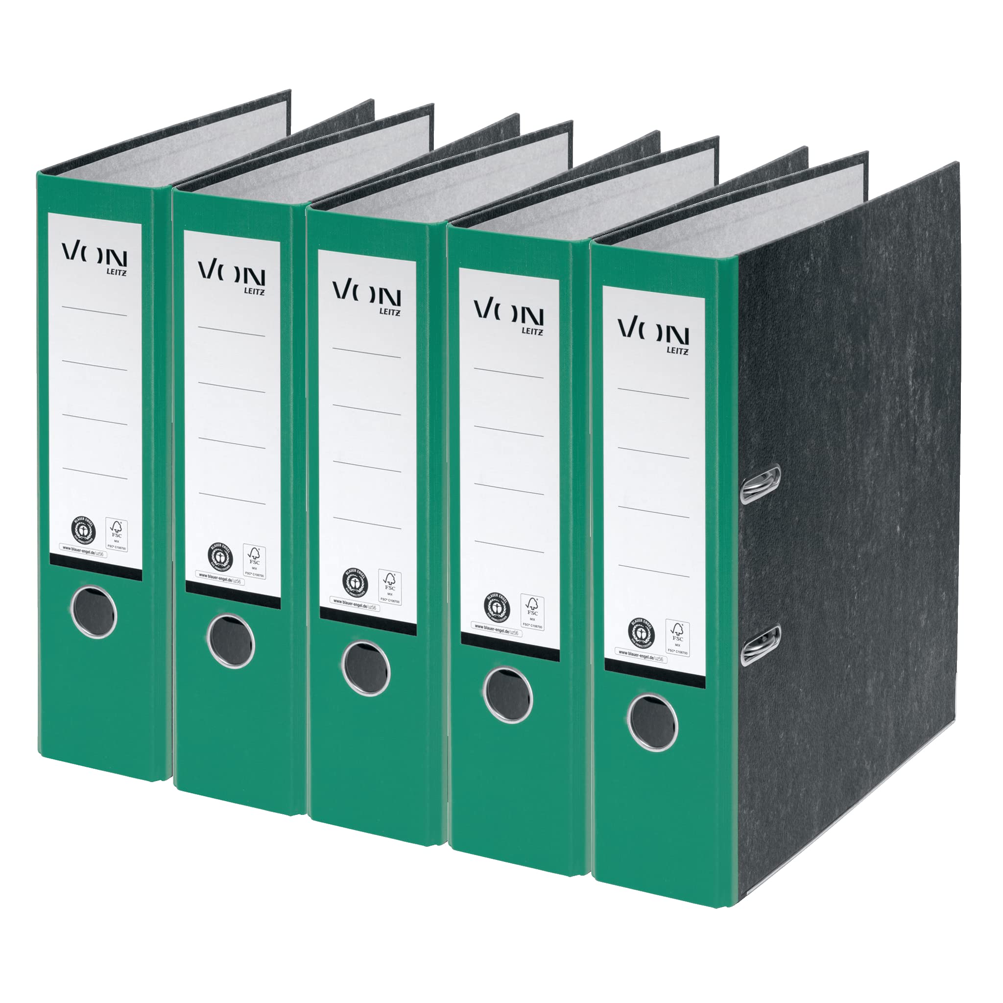 VON Leitz 5er Pack Ordner A4, 100 % Recyclingkarton, 80 mm Rückenbreite, Für 600 Blatt, Marmoriert, Blauer Engel & FSC-zertifiziert, Für Schule, Studium & Haushalt, Grün, 10531055