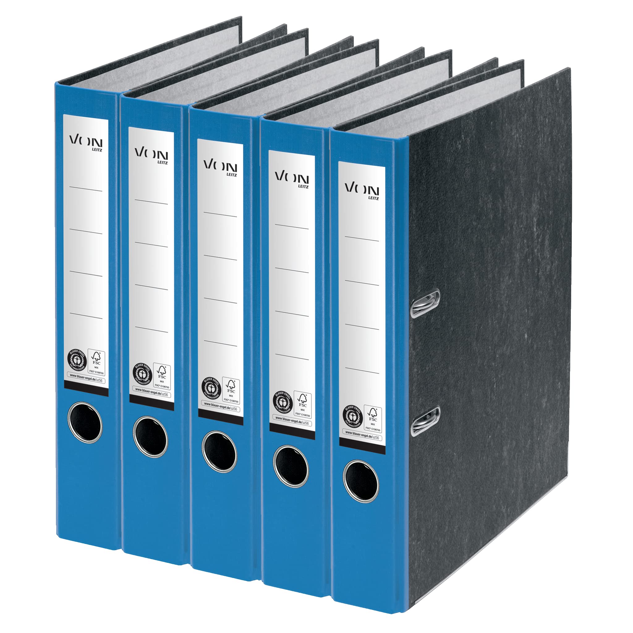 VON Leitz 5er Pack Ordner A4, 100 % Recyclingkarton, 50 mm Rückenbreite, Für 350 Blatt, Marmoriert, Blauer Engel & FSC-zertifiziert, Für Schule, Studium & Haushalt, Blau, 10541035