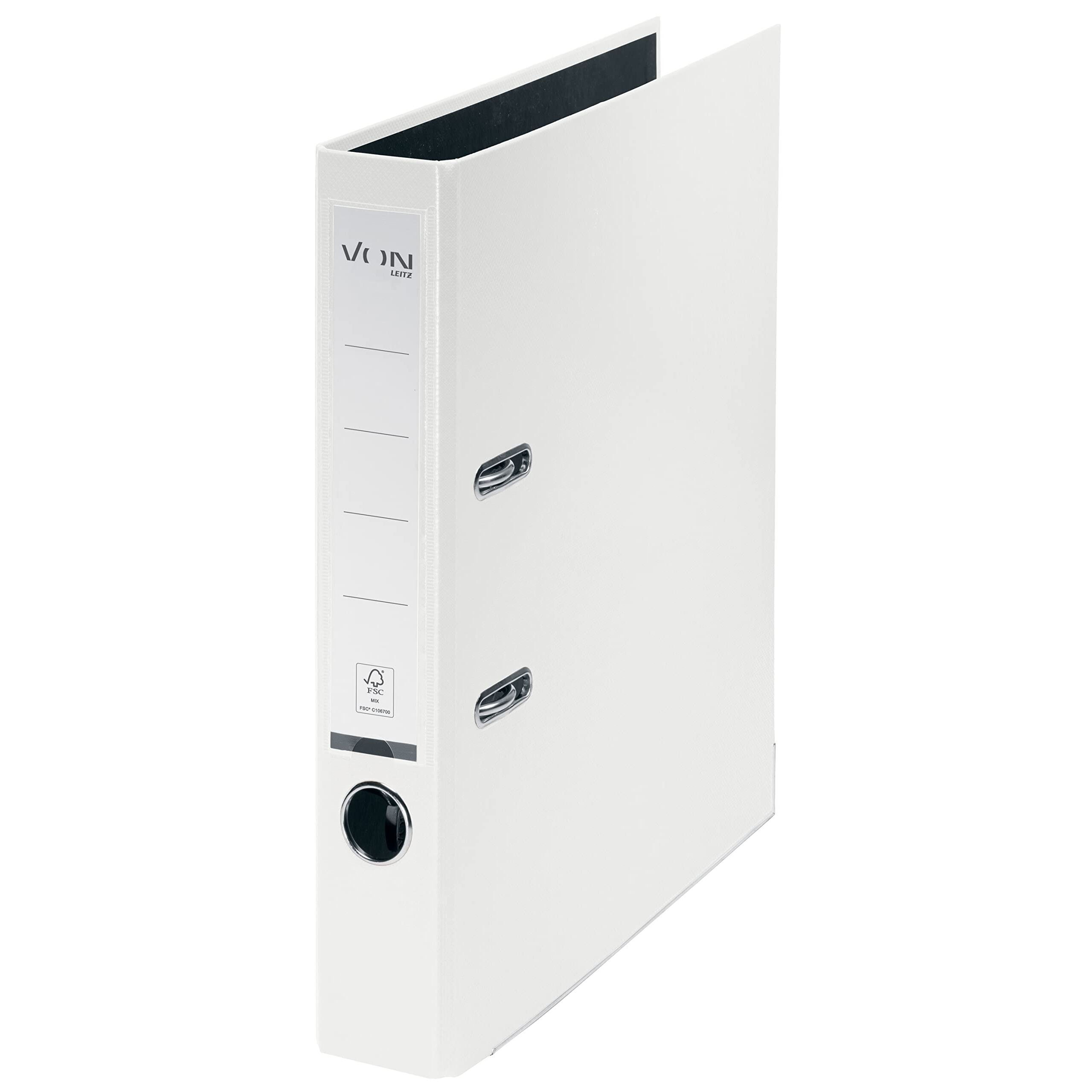 VON Leitz Ordner A4, Karton mit Kunststoffeinband, 50 mm Rückenbreite, Für 350 Blatt, Blauer Engel & FSC-zertifiziert, Für Schule, Studium & Zuhause, Weiss, 10560001