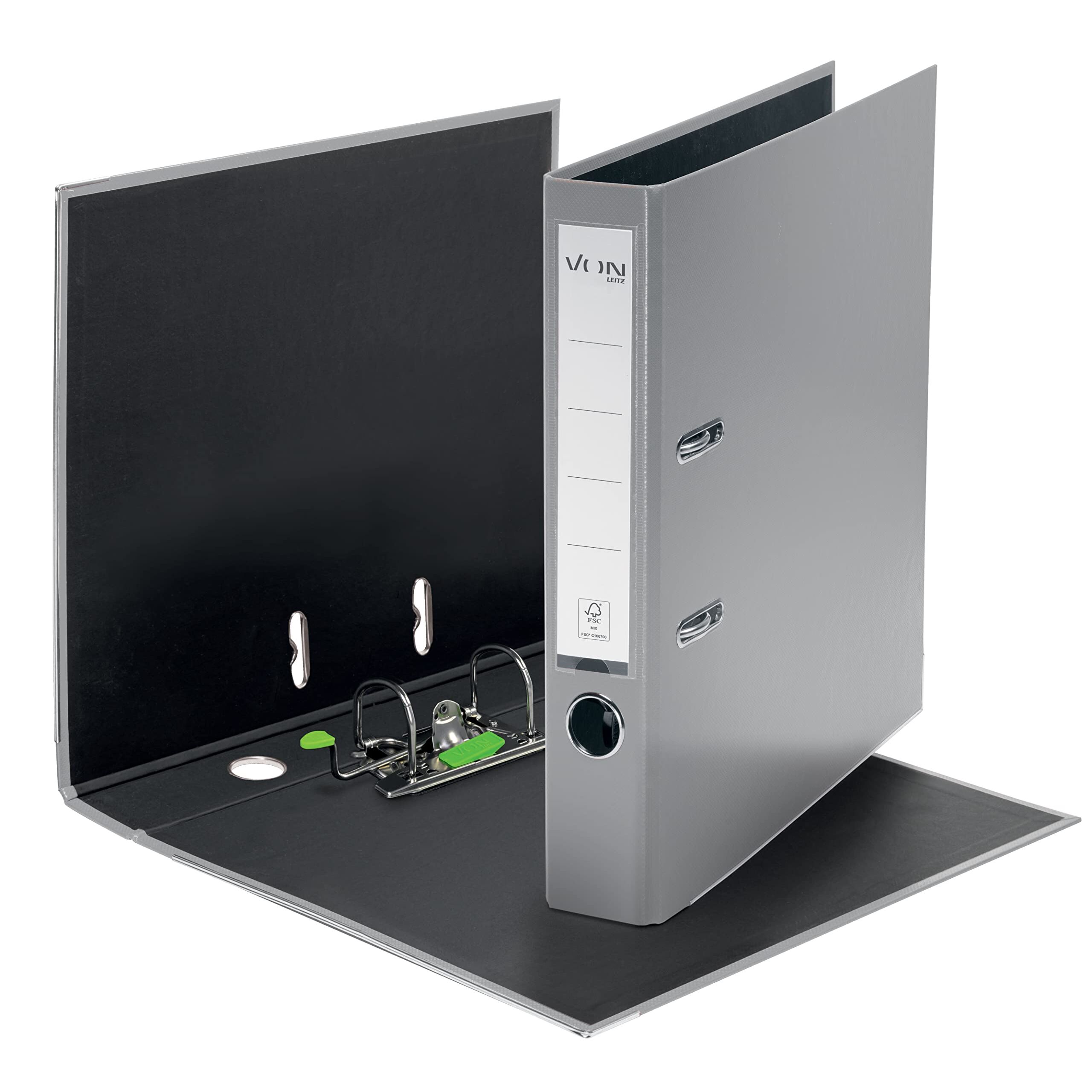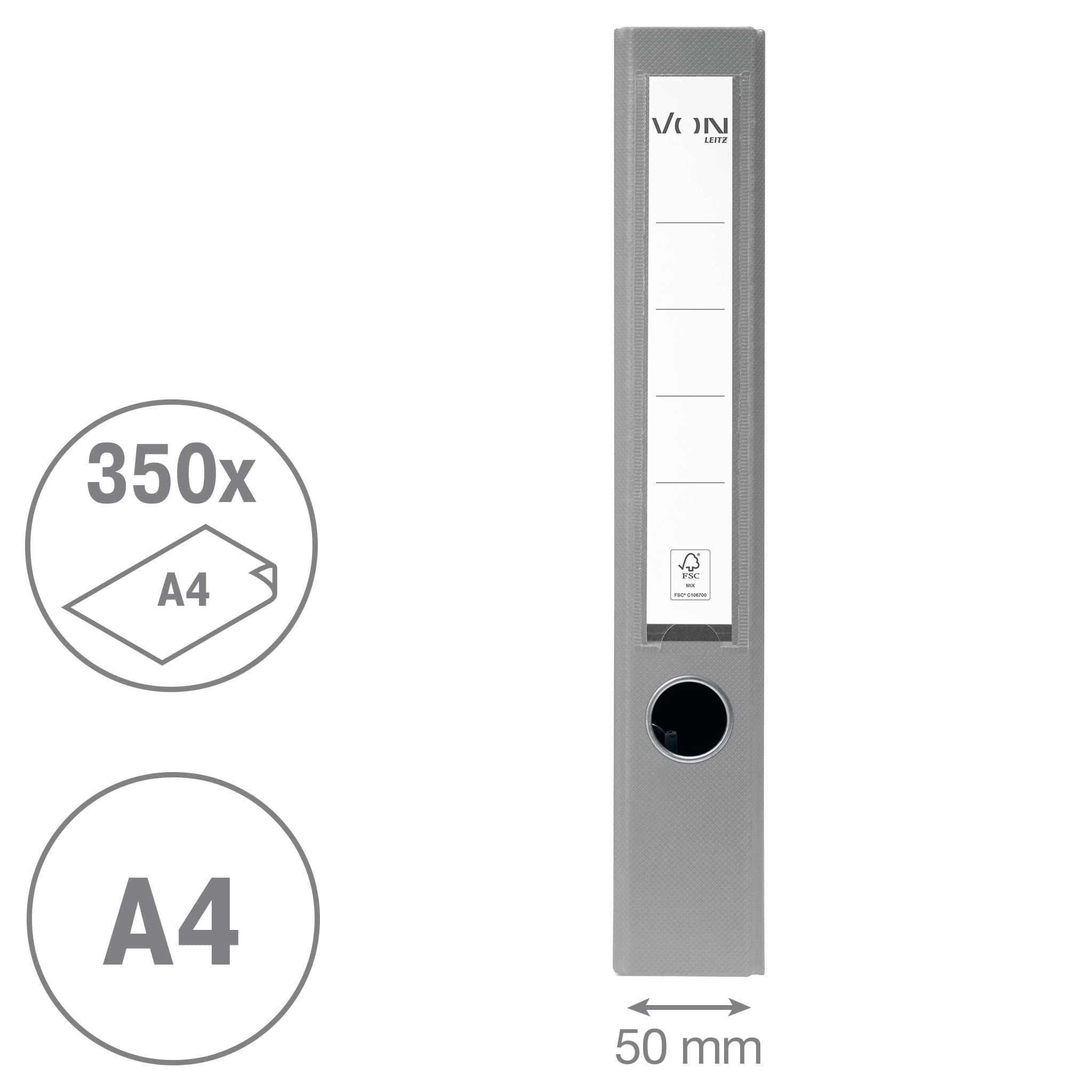 VON Leitz Ordner A4, Karton mit Kunststoffeinband, 50 mm Rückenbreite, Für 350 Blatt, Blauer Engel & FSC-zertifiziert, Für Schule, Studium & Zuhause, Grau, 10560085