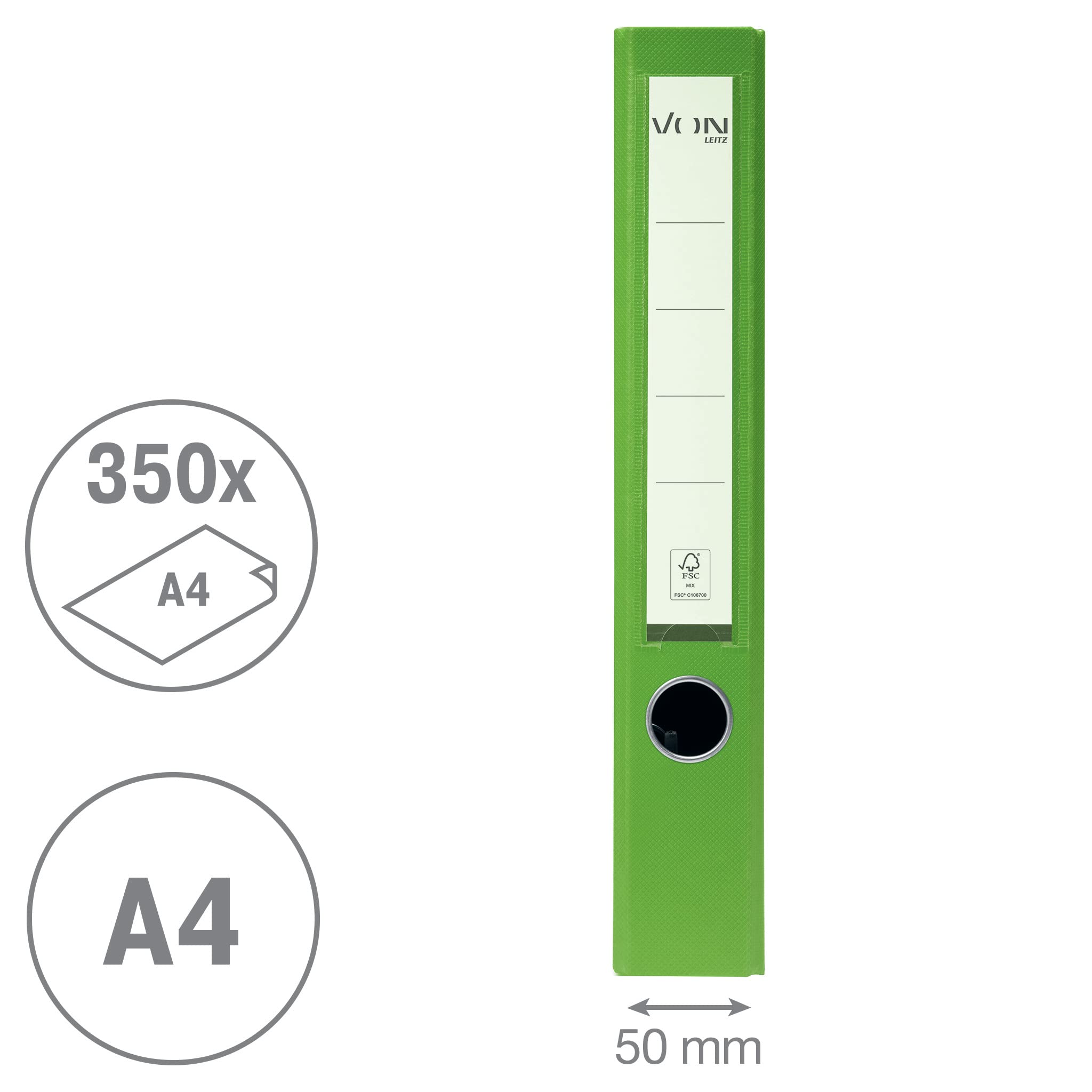 VON Leitz Ordner A4, Karton mit Kunststoffeinband, 50 mm Rückenbreite, Für 350 Blatt, Blauer Engel & FSC-zertifiziert, Für Schule, Studium & Zuhause, Grün, 10560055
