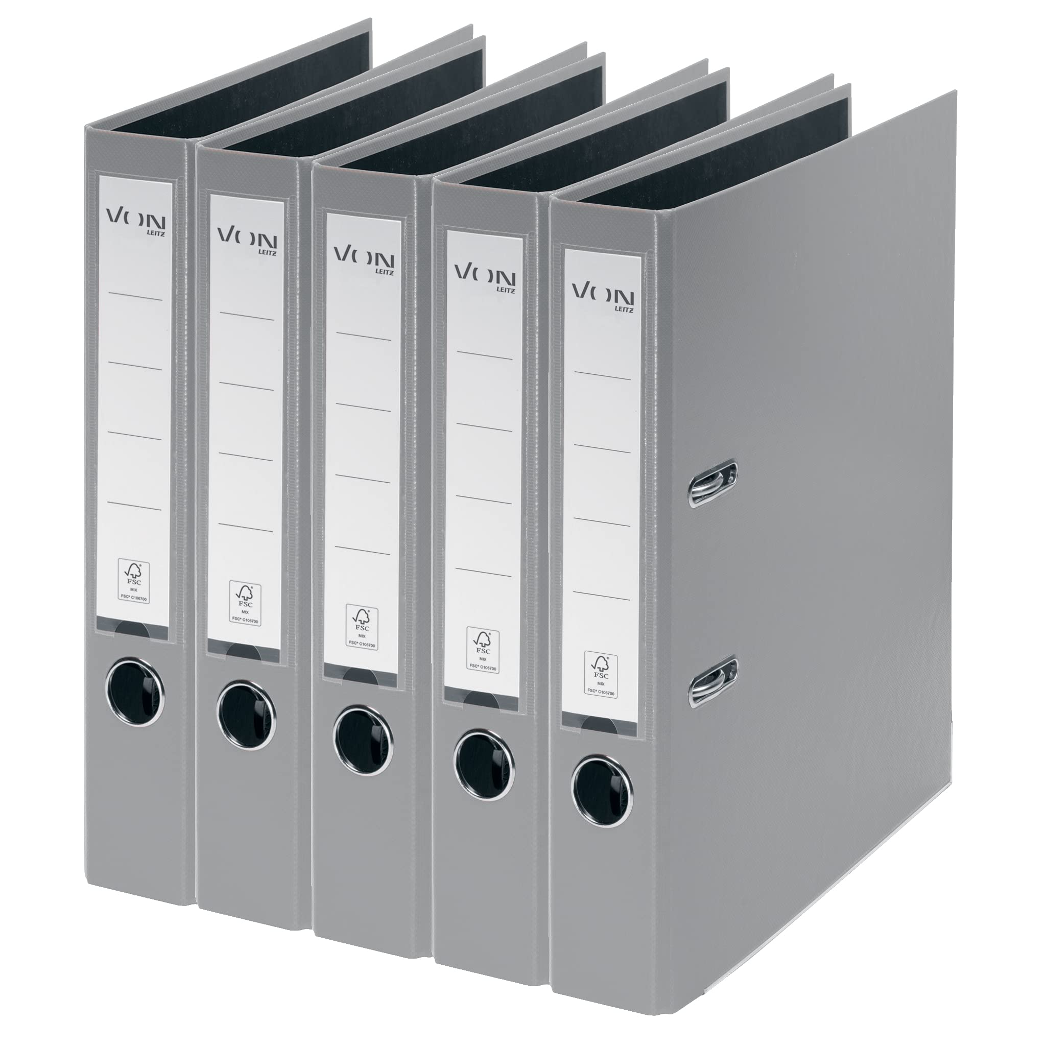 VON Leitz 5er Pack Ordner A4, Karton mit Kunststoffeinband, 50 mm Rückenbreite, Für 350 Blatt, FSC-zertifizierter Karton, Für Schule, Studium & Haushalt, Grau, 10561085
