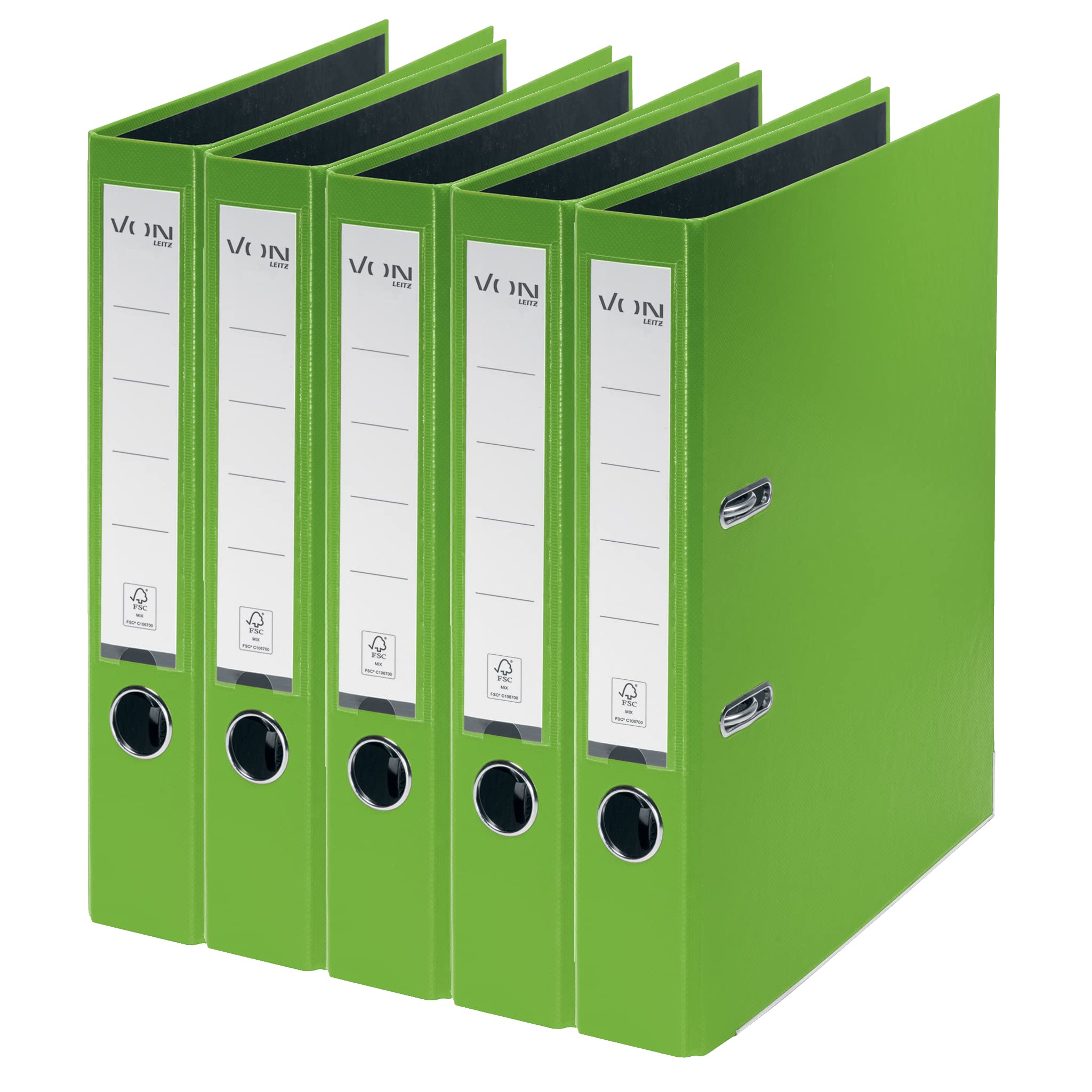 Der hochwertige Ordner bietet sich als ideale Aufbewahrungslösung an – ob im Studium, bei der Arbeit zu Hause, auf Reisen oder im Büro. Die stabile 2-Ring-Mechanik bewahrt Ihre Unterlagen sicher, organisiert und leicht zugänglich auf; ein Rückenschild sorgt für mehr Übersicht, ein Daumenloch und Rado-Ringe für Komfort und Ordnung. Mit seinem Einband aus leuchtendem Papier und dem farbigen Rücken, eignet sich der VON Aktenordner ideal für Ihre tägliche Ablage von Rechnungen, Rezepten, Briefen, Schulprojekten, Hausaufgaben, Forschungsarbeiten, Notizen, Rechnungen und Zeugnissen. Hergestellt aus robustem FSC-zertifiziertem Karton, garantiert er optimale Qualität und Effizienz. - A4-Ordner aus Karton mit Kunststoffeinband und Hebelmechanik - 5 Stück in Grün - Ideal für die Ablage sämtlicher Unterlagen - Ausgestattet mit der robusten VON Ordner-Mechanik für müheloses Abheften im Alltag - 80 mm Rückenbreite mit Platz für bis zu 350 A4-Blätter (80 g/m² Papier) - Hergestellt aus stabilem und haltbarem FSC-zertifiziertem Karton mit Kunststoffbeschichtung - Abwischbare Abdeckung aus Kunststoff in einer Auswahl leuchtender Farben - Ideal geeignet zur farblichen Sortierung - Rückentasche mit Etikett zur einfachen Identifizierung des Inhalts - Erhältlich in einer Auswahl von Farben mit dem modernen VON-Design