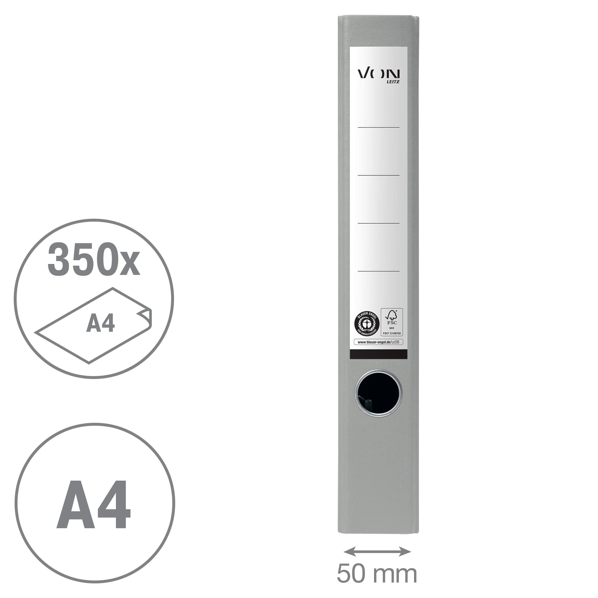 VON Leitz Ordner A4, 100 % Recyclingpapier, 50 mm Rückenbreite, Für 350 Blatt, Blauer Engel & FSC-zertifiziert, Für Schule, Studium & Zuhause, Grau, 10540085