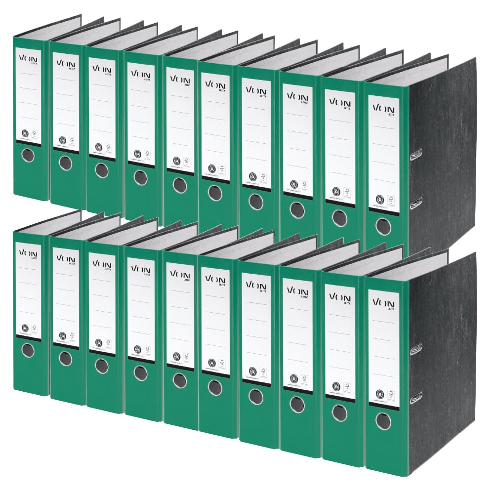 VON Leitz Ordner A4, 20er Pack, 100 % Recyclingpapier, 80 mm Rückenbreite, VON Leitz Leitz, Für 600 Blatt, Blauer Engel & FSC-zertifiziert, Für Schule, Studium & Zuhause, Grün, 10530055