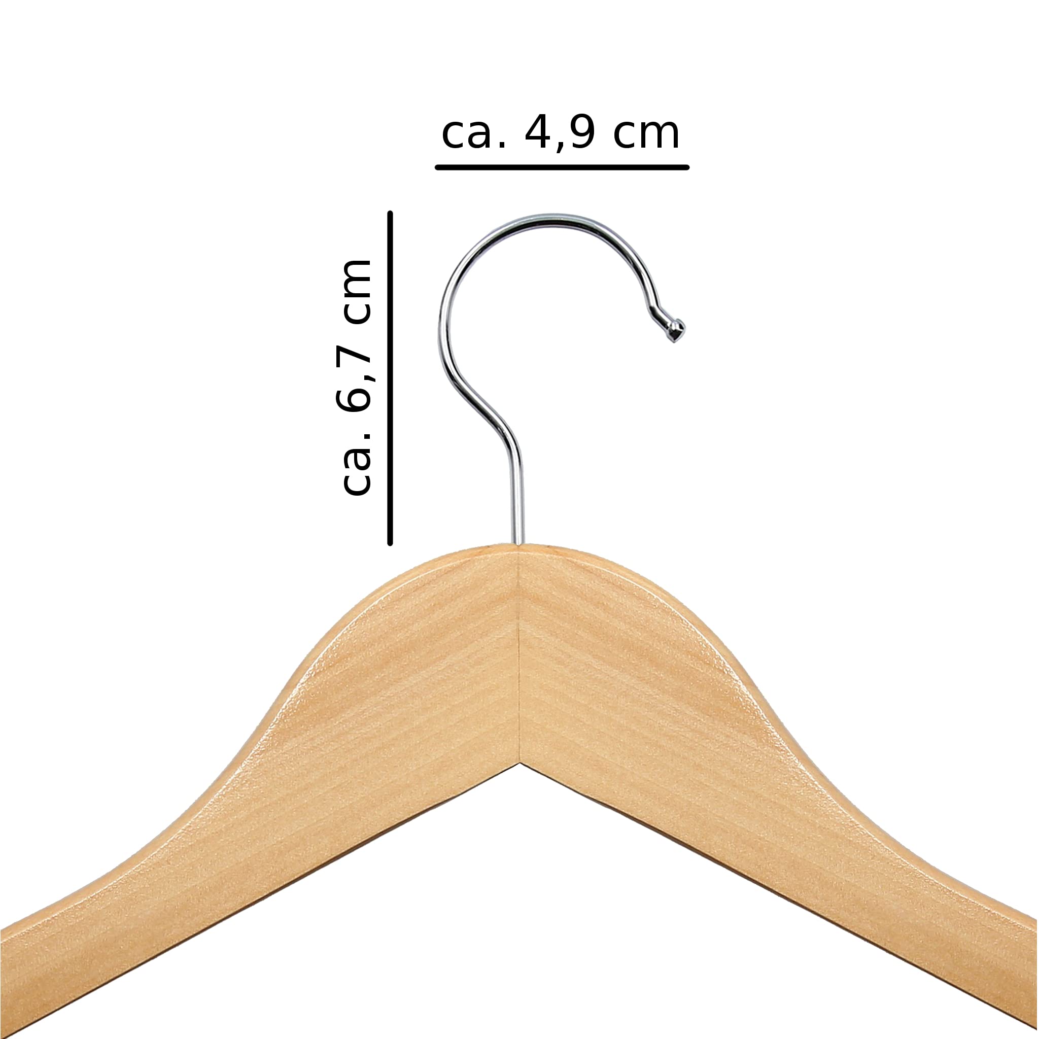 Material: Holz. Länge: ca. 44,5 x 22 cm. Farbe: naturfarben. Das moderne Design der Kleiderbügel ist für jede Garderobe und für jeden Kleiderschrank geeignet. Die Holzbügel sind vielseitig einsetzbar, denn sie besitzen sowohl einen Steg für Hosen als auch Kerben für Rock- und Hosenhänger oder für Träger von Oberteilen. Aufgrund der guten Stabilität der Holzkleiderbügel können auch mehrere Teile auf einem Bügel oder schwere Jacken aufgehängt werden. Die Form der Bügel sorgt dafür, dass sich zum Beispiel der Schulterbereich Ihrer Hemden nicht mehr ausbeult. Der um 360 Grad drehbare Haken ermöglicht ein Wenden der Kleidung im Schrank.