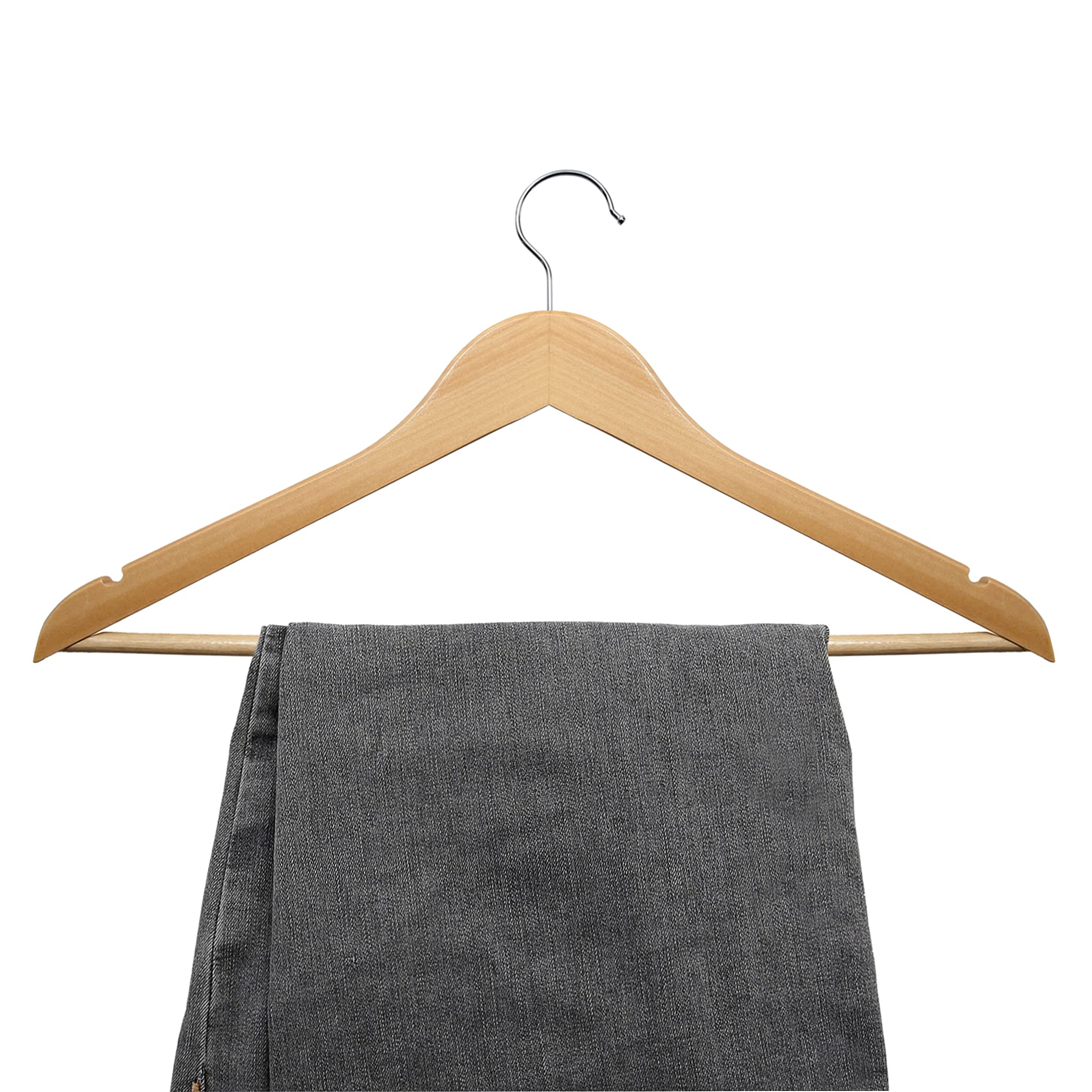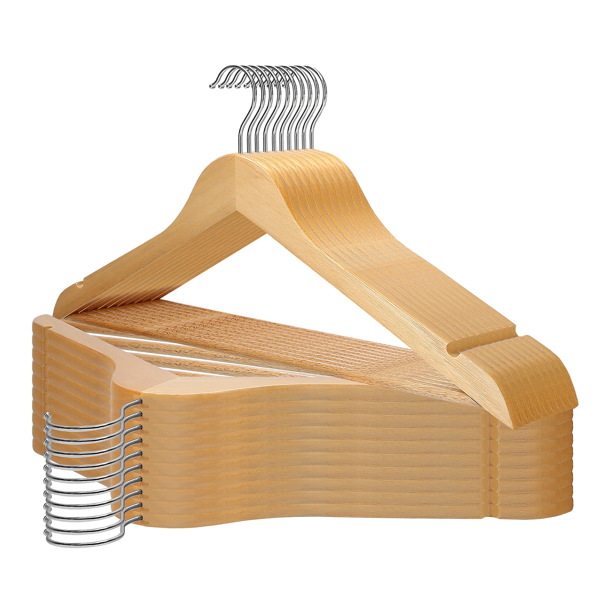 Material: Holz. Länge: ca. 44,5 x 22 cm. Farbe: naturfarben. Das moderne Design der Kleiderbügel ist für jede Garderobe und für jeden Kleiderschrank geeignet. Die Holzbügel sind vielseitig einsetzbar, denn sie besitzen sowohl einen Steg für Hosen als auch Kerben für Rock- und Hosenhänger oder für Träger von Oberteilen. Aufgrund der guten Stabilität der Holzkleiderbügel können auch mehrere Teile auf einem Bügel oder schwere Jacken aufgehängt werden. Die Form der Bügel sorgt dafür, dass sich zum Beispiel der Schulterbereich Ihrer Hemden nicht mehr ausbeult. Der um 360 Grad drehbare Haken ermöglicht ein Wenden der Kleidung im Schrank.