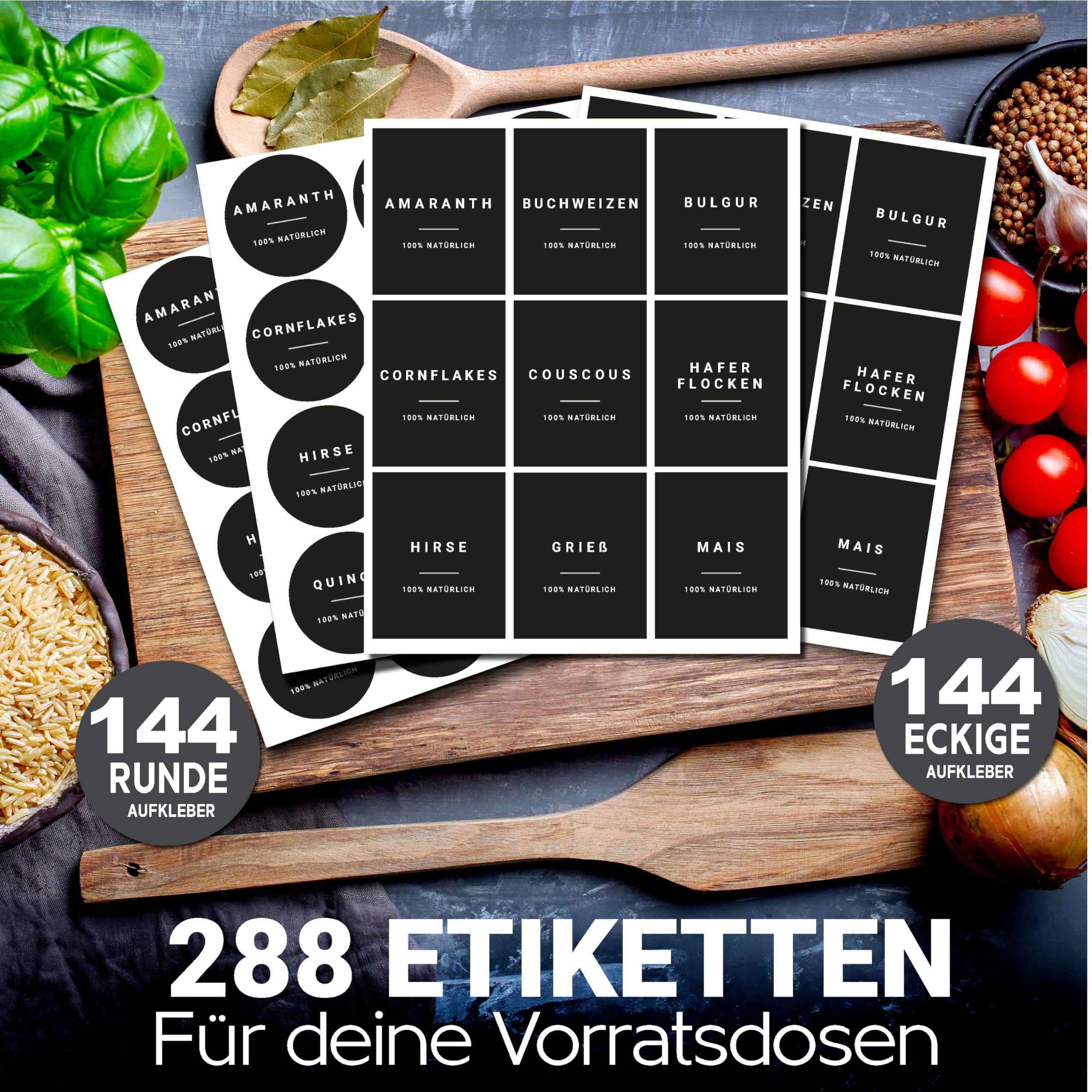 Vorratsetiketten - Küchen XXL Set Schwarz - selbstklebend (288 Stück) - Aufkleber rund minimalistisch - wasserfest