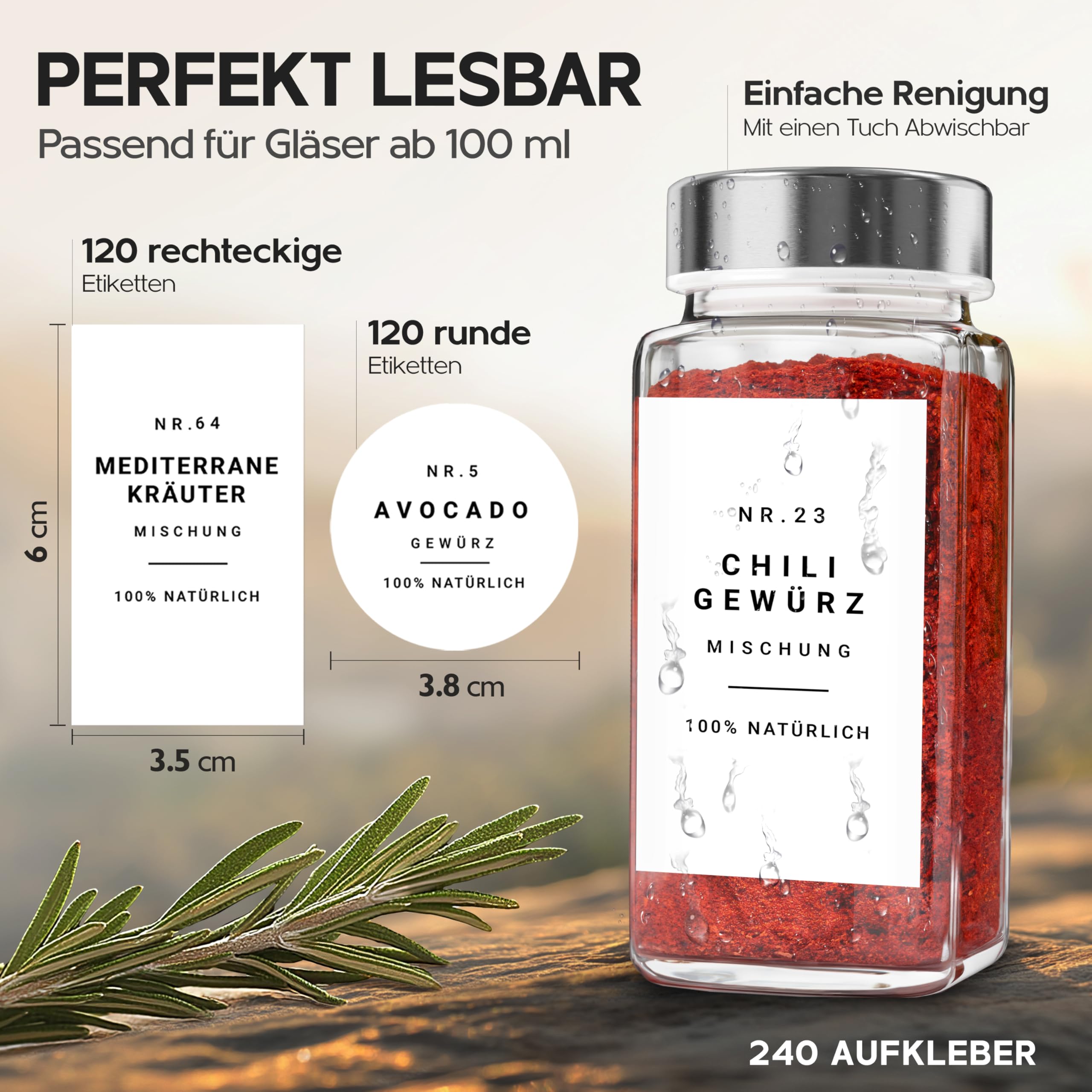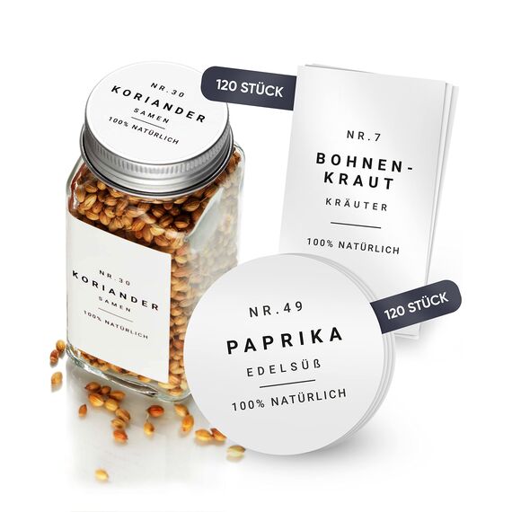 Homety - Home & Living 240 Gewürzaufkleber - minimalistisch EIN BLICKFANG IN DEINER KÜCHE! Du willst Ordnung in deiner Gewürzschublade oder deinem Gewürzregal schaffen? Möchtest aber nicht alles handschriftlich Beschriften, sondern ein minimalistisch modernes Design? Dann sind unsere Gewürzetiketten genau das richtige für dich! EASY UND MODERN ORDNUNG SCHAFFEN Schaffe kinderleicht eine tolle Übersicht und spare Zeit bei der Suche nach einem bestimmten Gewürz für das Gericht, welches du gerade kochst. Hab mehr Spass beim Kochen, denn nummeriert und alphabetisch sortiert, findest du im Handumdrehen ein bestimmtes Gewürz. Erleichtere dir so deinen Alltag und spare damit wertvolle Zeit. GEWÜRZETIKETTEN SET 240 Etiketten jeweils 120 verschiedene Gewürzetiketten in rund und eckig, 22 davon auch für Backzutaten Masse: rechteckige Etiketten: 6,0 cm x 3,5 cm runde Etiketten 3,8 cm Durchmesser Passend für Gläser und Dosen mit einer Länge von mindestens 6cm und einer Breite von 4cm bzw. ab einem Füllvolumen von 120ml und grösser QUALITÄT, DIE HÄLT WAS SIE VERSPRICHT: wasserfest, ölresistent, selbstklebend, reissfest, leicht aufzukleben Wir sind ein deutsches Familienunternehmen und legen höchste Ansprüche an die Qualität unserer Waren. Wir stehen für Kundenfreundlichkeit und Qualität. Die Wichtigsten Tipps bevor du startest: Reinige und trockne die Gläser oder Dosen, die du bekleben möchtest, so dass die Oberfläche sauber und fettfrei ist Übe mit 1-3 Aufklebern, die du später nicht benötigst, um den dreh raus zu haben, die Aufkleber gerade und ohne Luftblasen auf dein Glas bzw. Dose zu kleben Drehe die Deckel auf die Gläser, so dass sie verschlossen sind und beginne erst dann die Aufkleber aufzukleben, so werden sie symmetrisch sein, wenn du deine Gewürze verschliesst Stell dir immer ein bereits beklebtes Glas/ Deckel neben das nächste und orientiere dich daran, was die Höhe des Aufklebers unten oder oben auf dem Glas betrifft, so entsteht schnell und einfach eine orden
