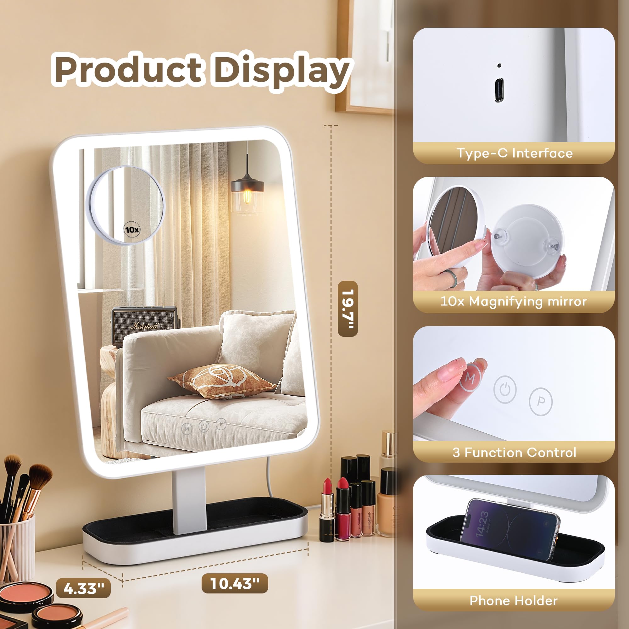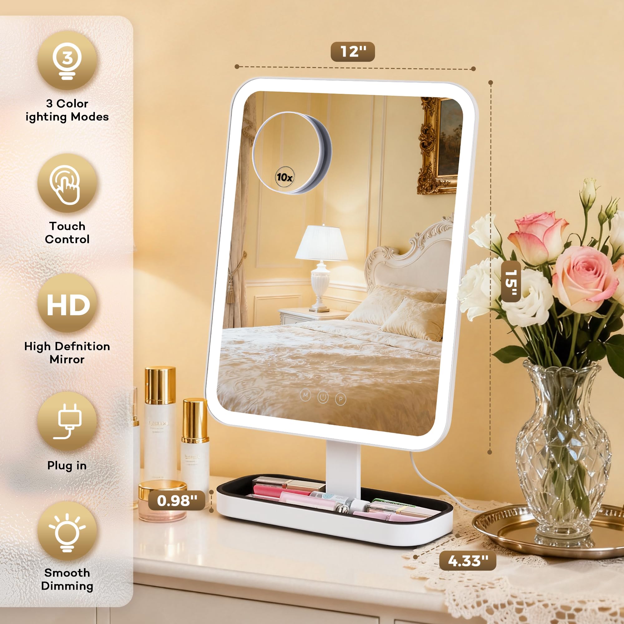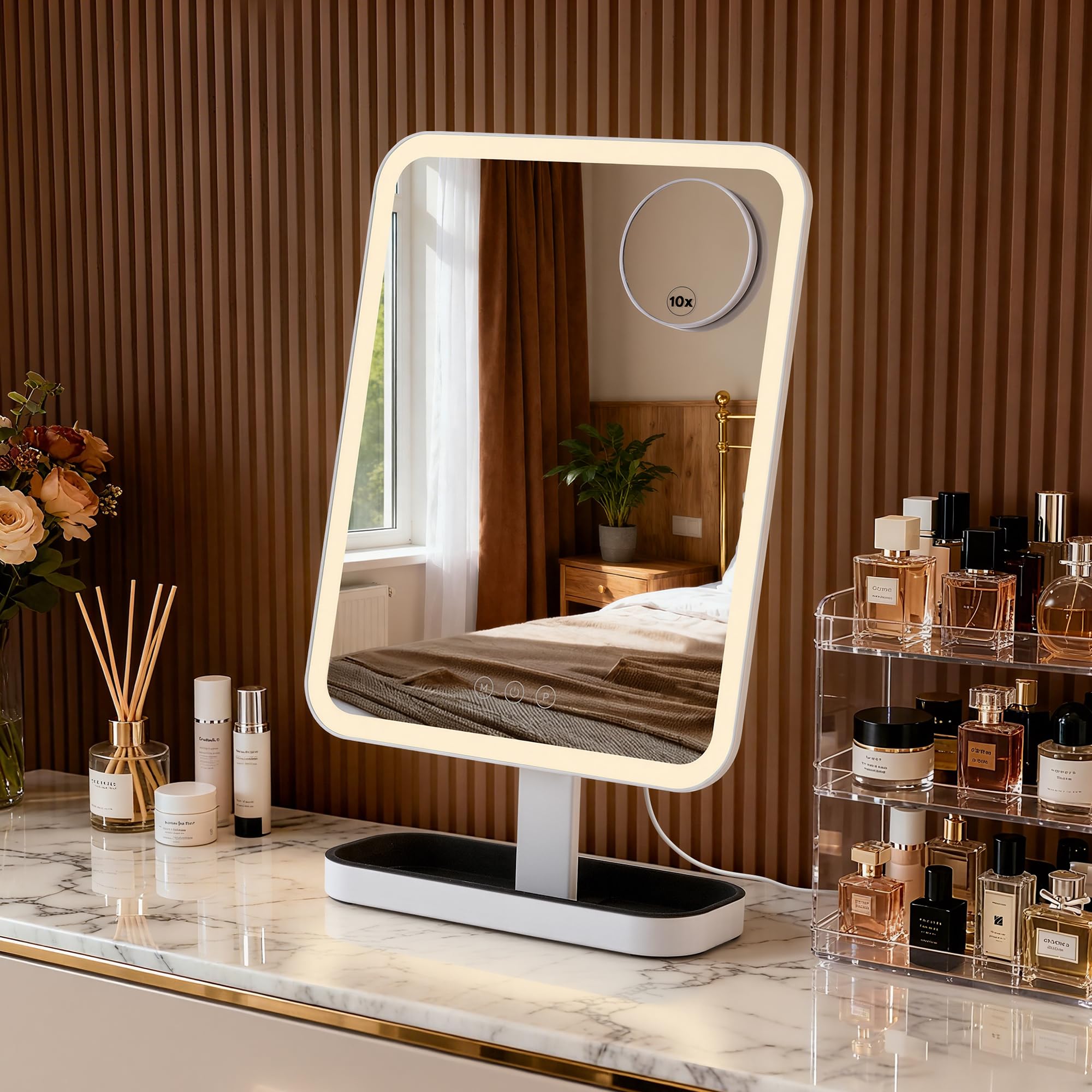 VORREMIRR Hollywood-Schminktischspiegel mit Beleuchtung: 38 x 30 cm grosser beleuchteter Kosmetikspiegel, intelligente Touch-Steuerung mit 3 Farblichtmodi, dimmbar, 30° neigbar – Netzbetrieb, Weiss