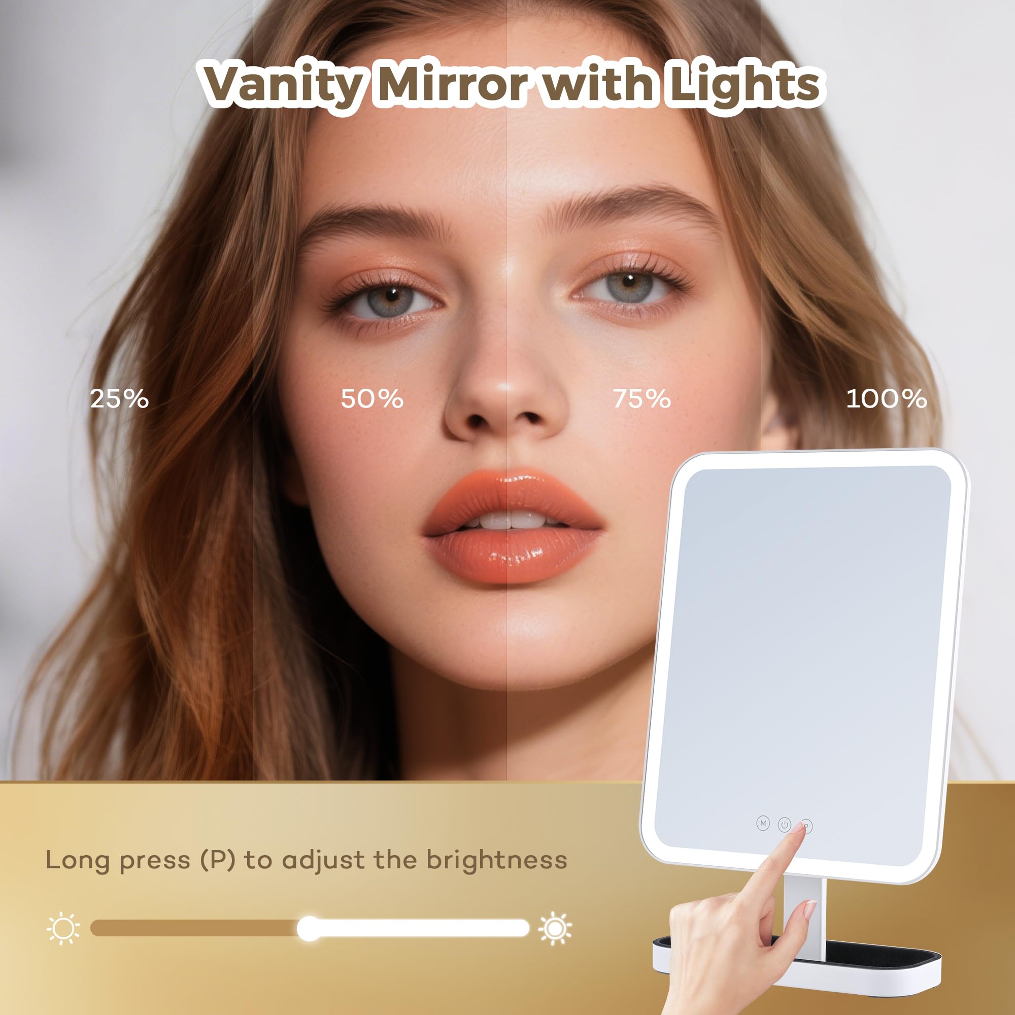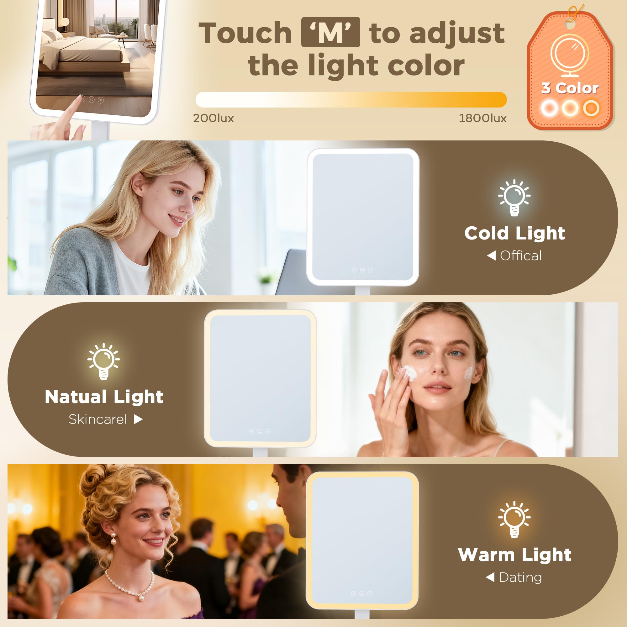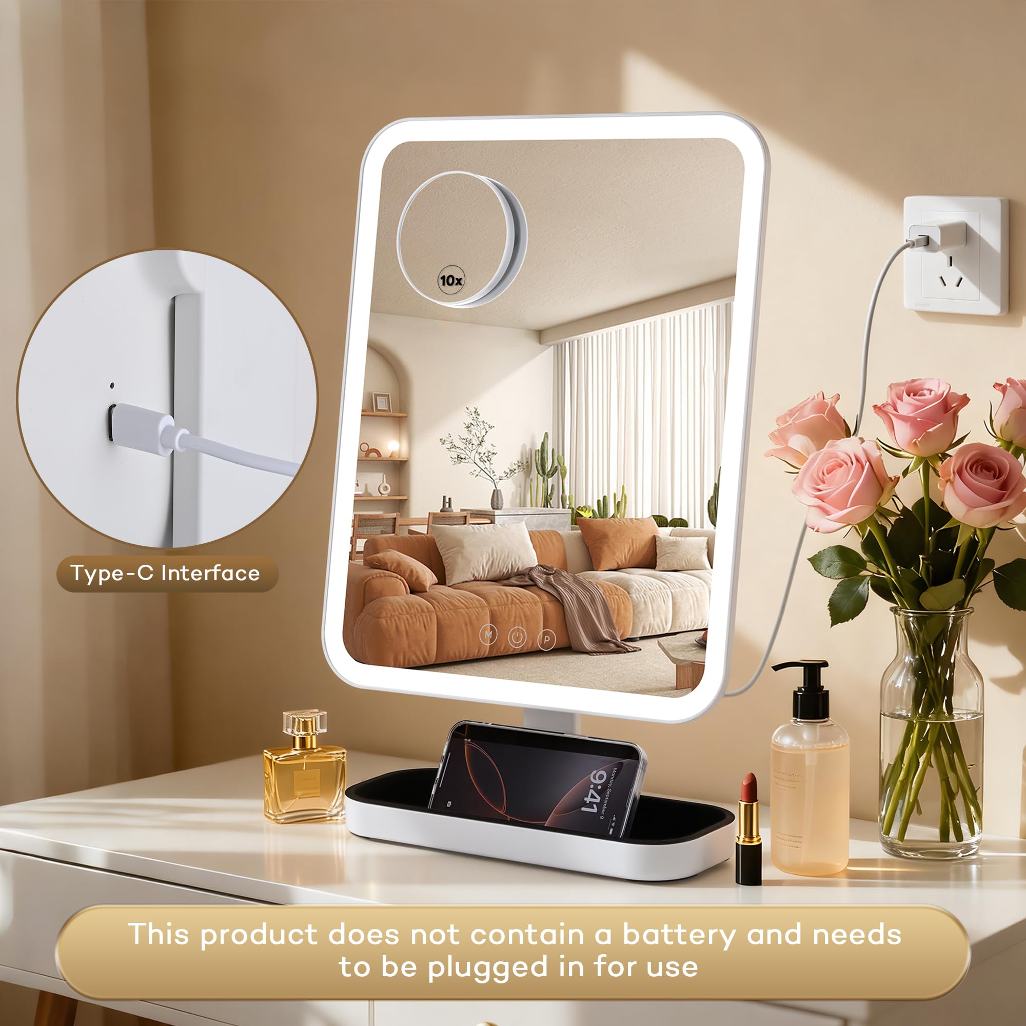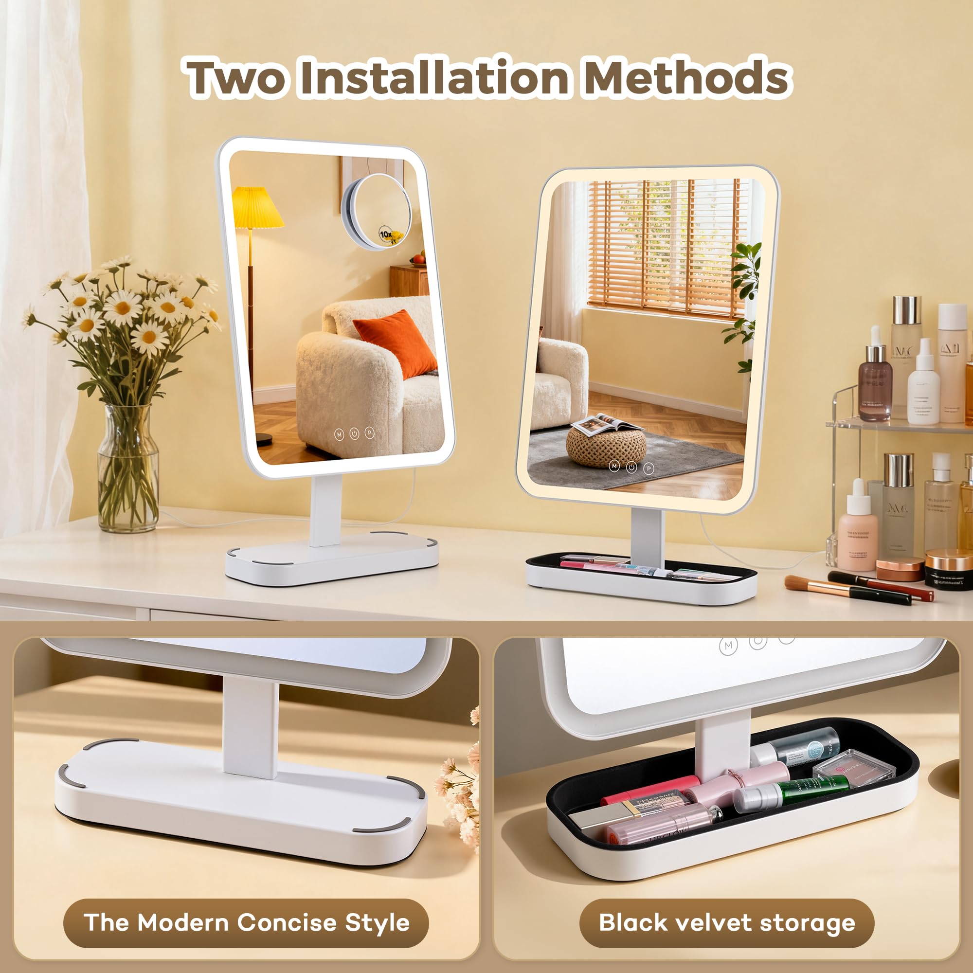 VORREMIRR Hollywood-Schminktischspiegel mit Beleuchtung: 38 x 30 cm grosser beleuchteter Kosmetikspiegel, intelligente Touch-Steuerung mit 3 Farblichtmodi, dimmbar, 30° neigbar – Netzbetrieb, Weiss