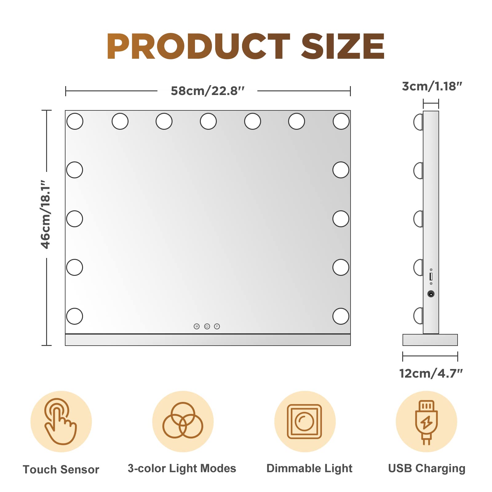 VORREMIRR Schminkspiegel mit Beleuchtung: 15 Birnen 56 * 44cm Hollywood Eitelkeitsspiegel mit Lichtern Spiegel mit Lichtern mit USB-Aufladung und 10x Vergrösserung, Touchscreen 3 Beleuchtungsmodi