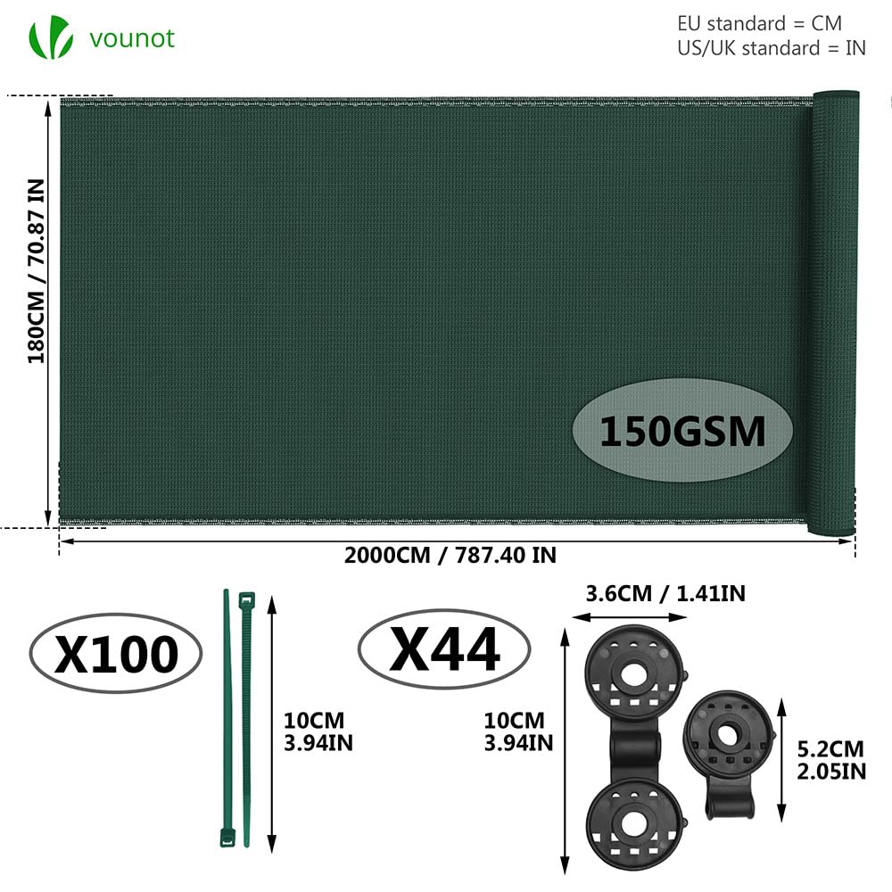 VOUNOT® Zaunblende 1.8×20m, Sichtschutz Zaun 150 g/m² HDPE Schattiernetz, Windschutz UV-resistent Reissfest, mit Löcher und Kabelbinder, Grün